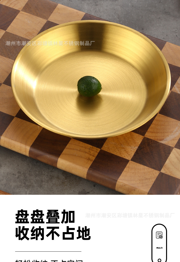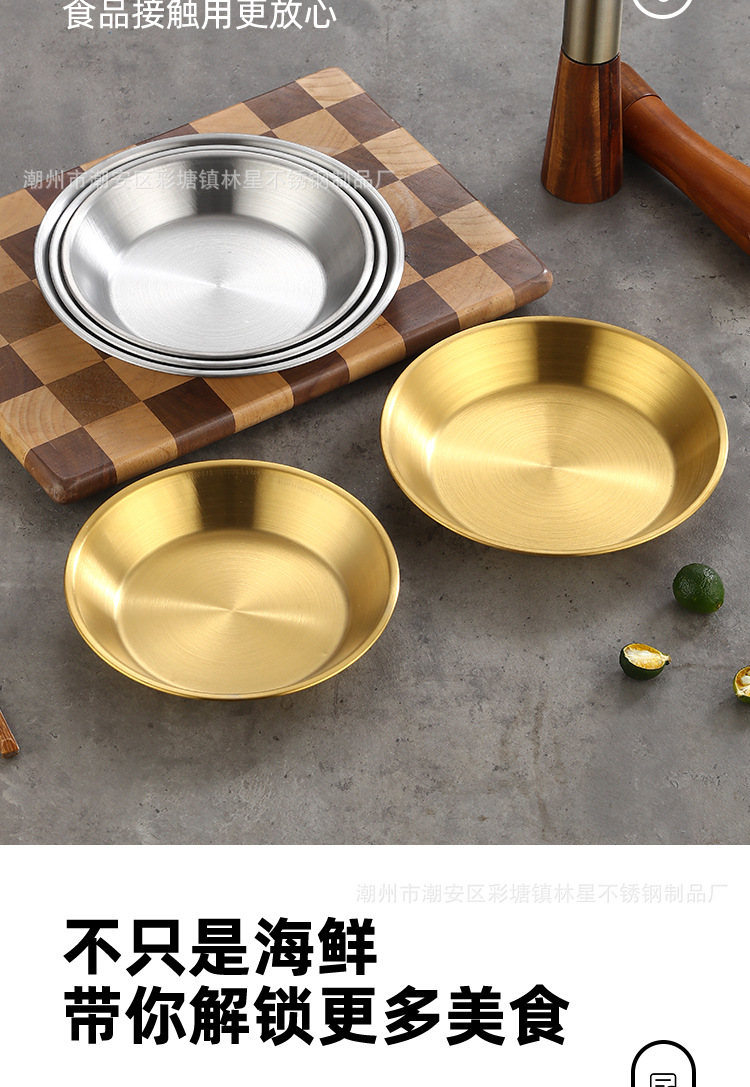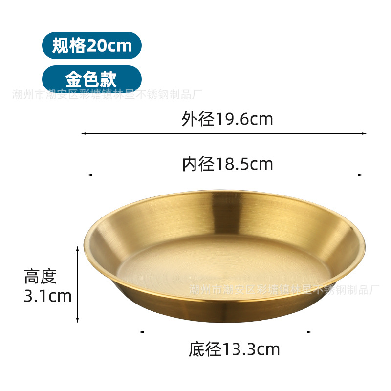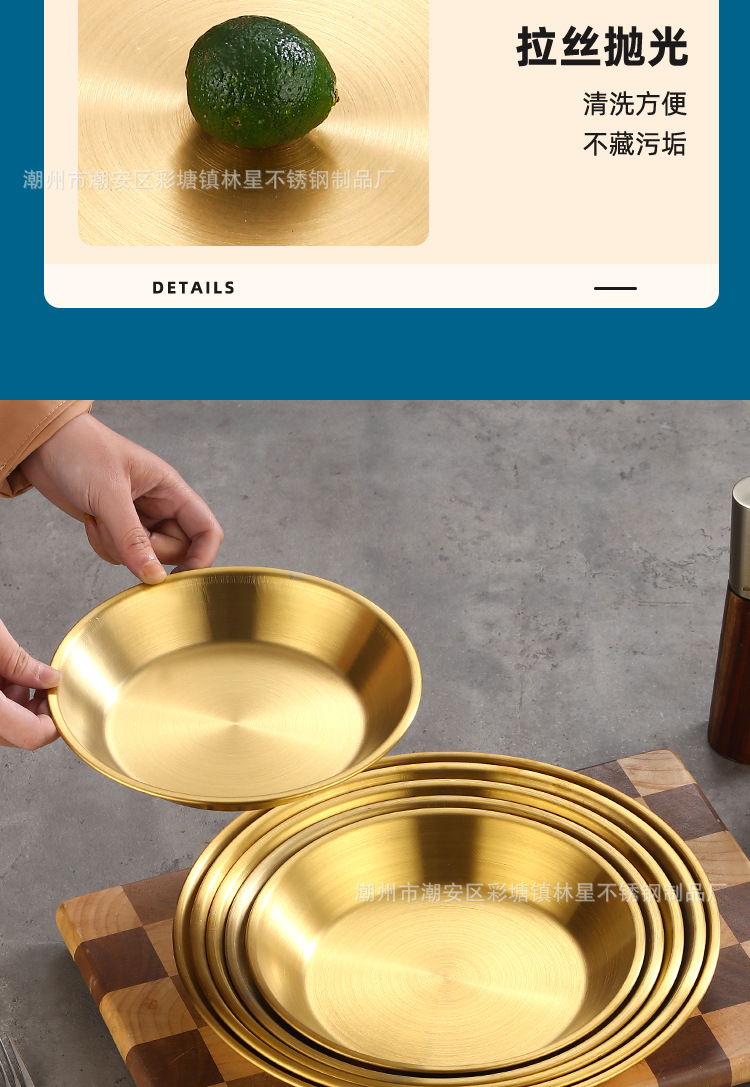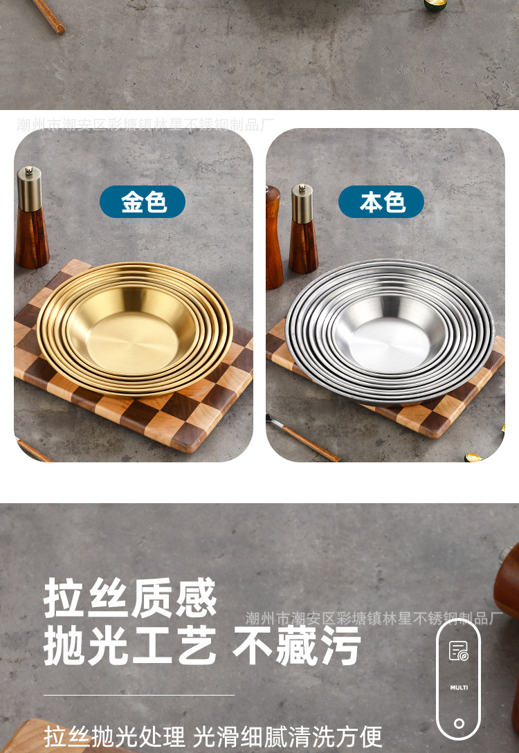 한국식 스테인레스 스틸 디스크 간단한 해산물 플레이트 골든 라운드 플랫 피자 플레이트 접시 바베큐 플레이트 트레이스토어 가기