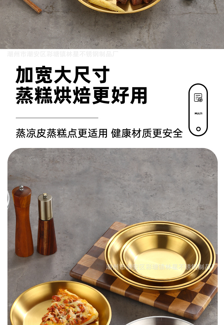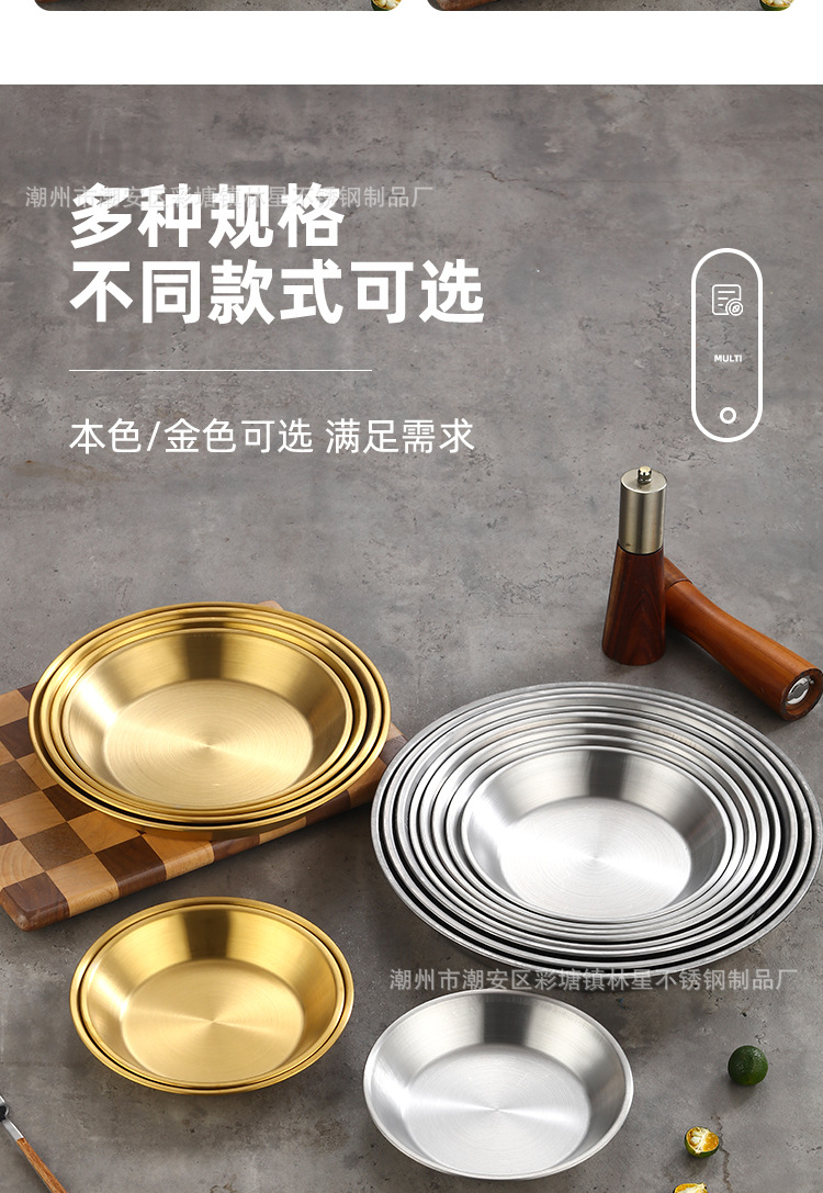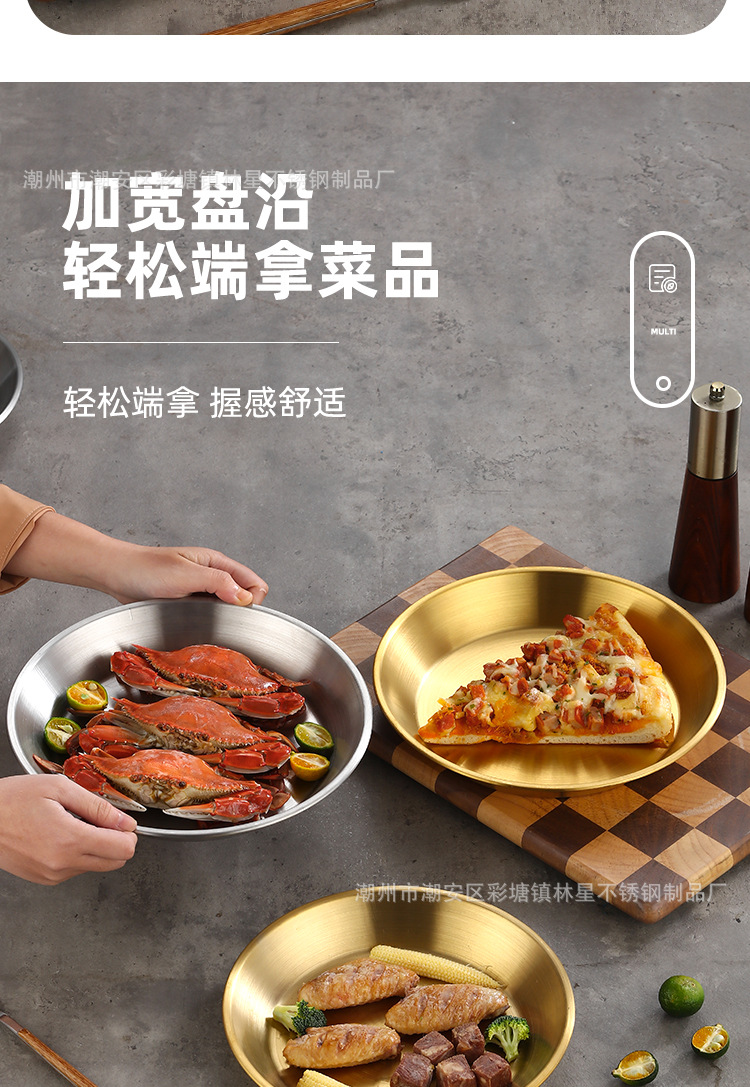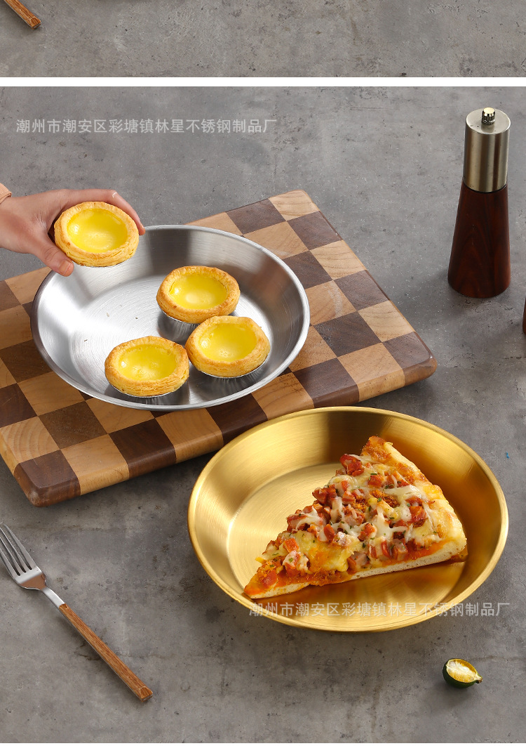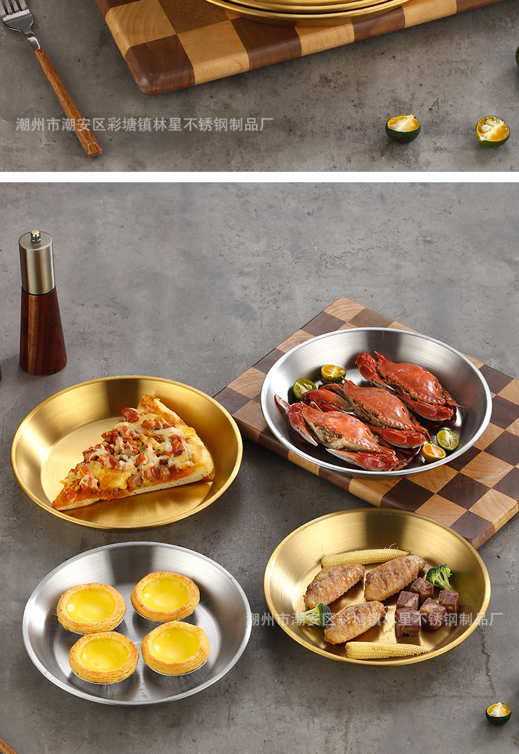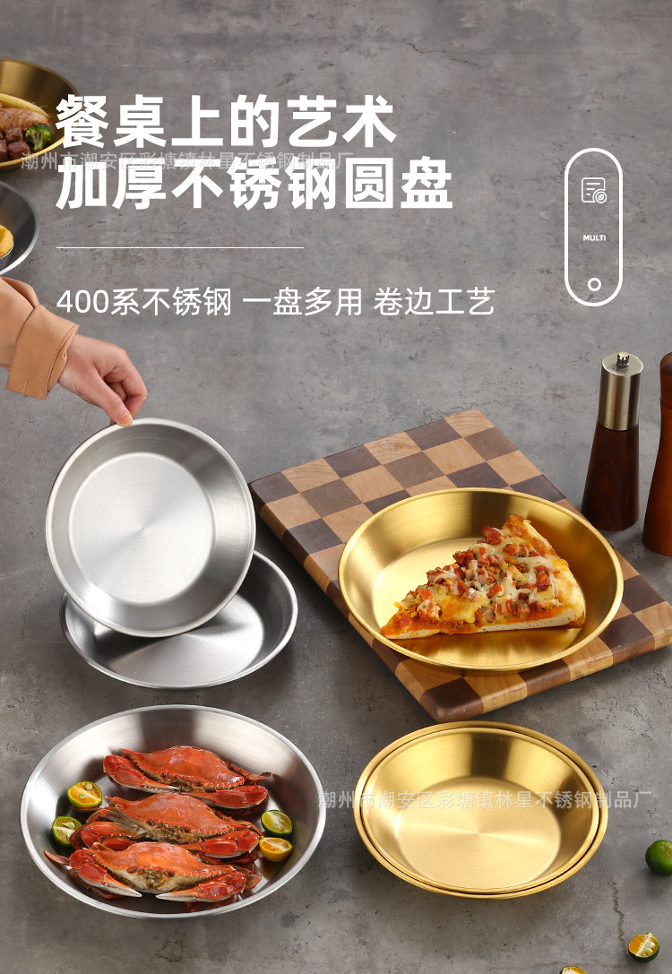 한국식 스테인레스 스틸 디스크 간단한 해산물 플레이트 골든 라운드 플랫 피자 플레이트 접시 바베큐 플레이트 트레이