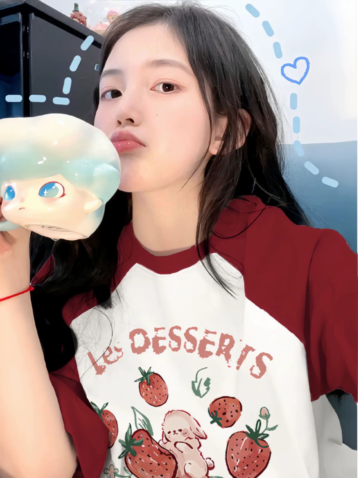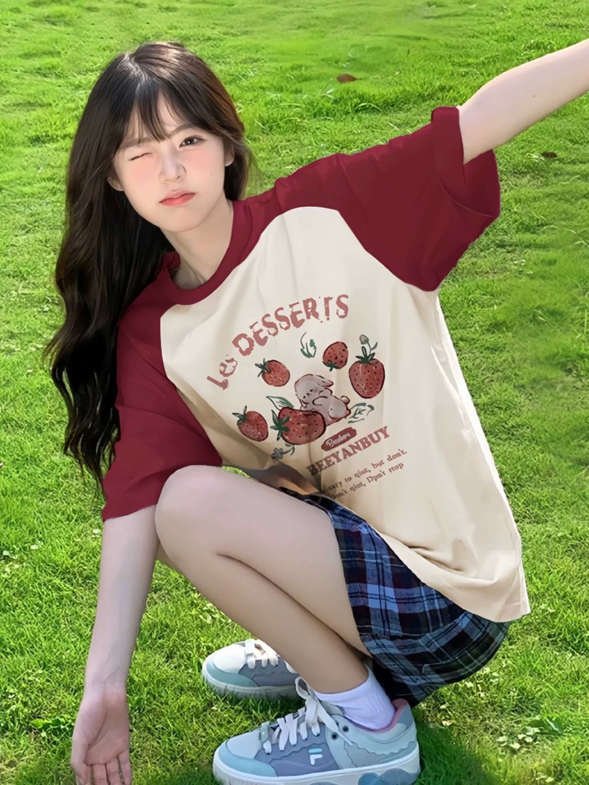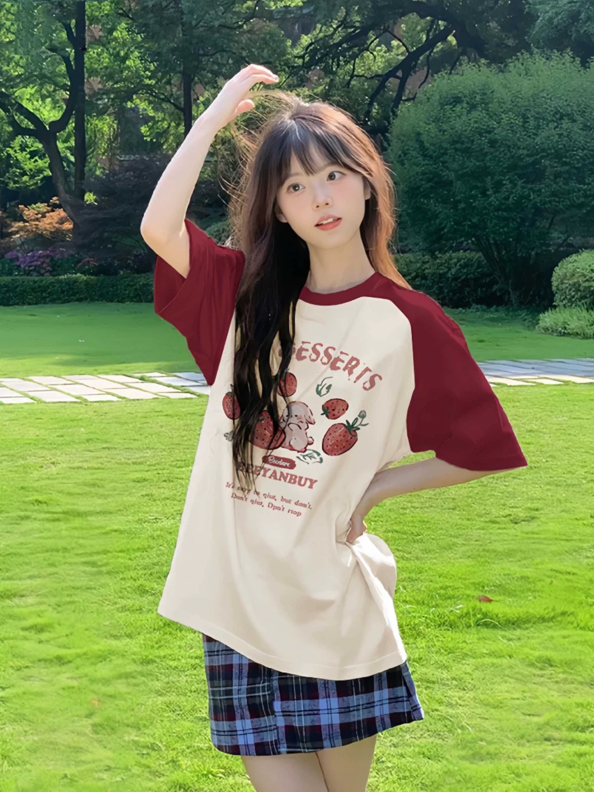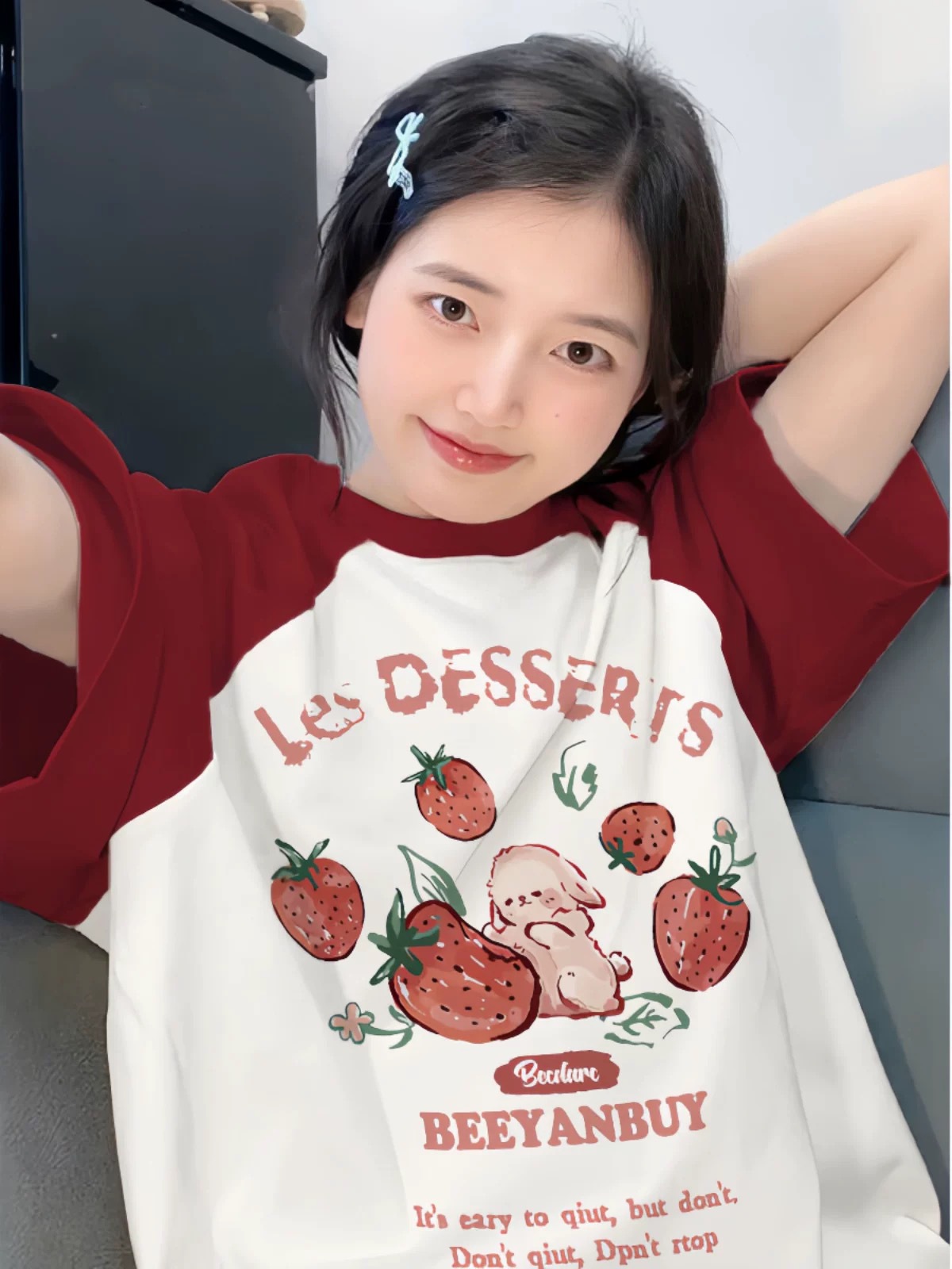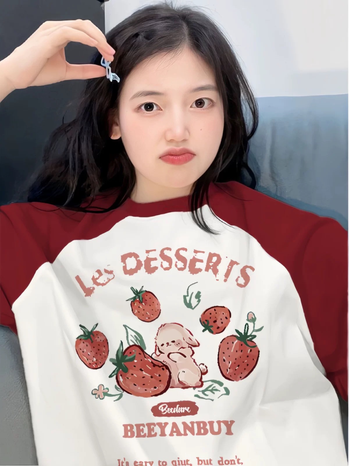 통통녀 느슨한 퓨어 코튼 라글란 반팔 티셔츠 여성용 여름 플러스 사이즈 딸기 토끼 디자인 센스 틈새스토어 가기