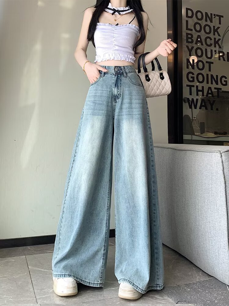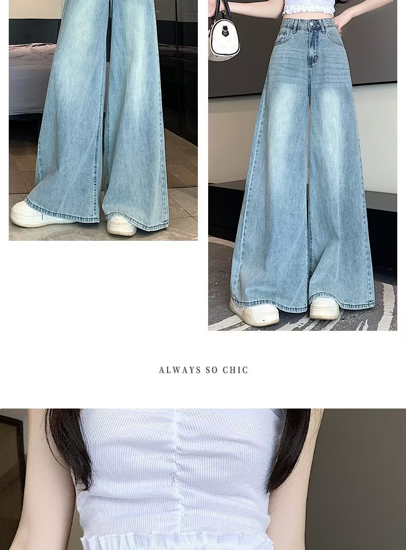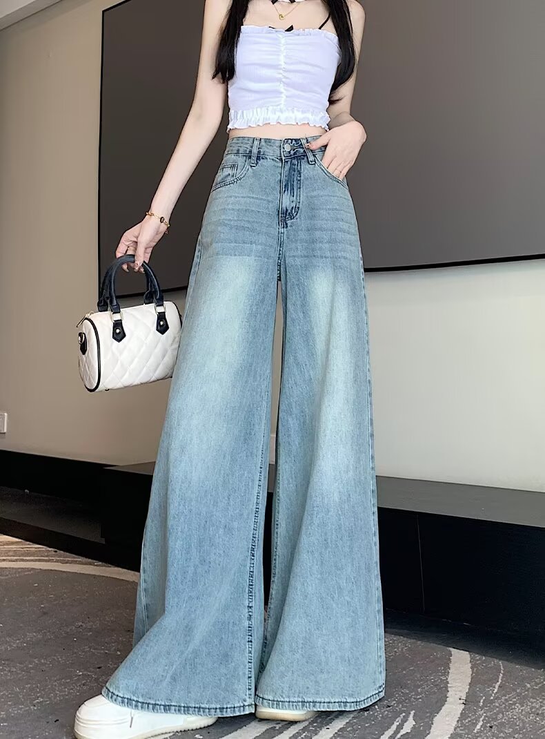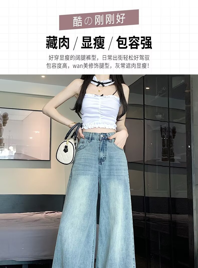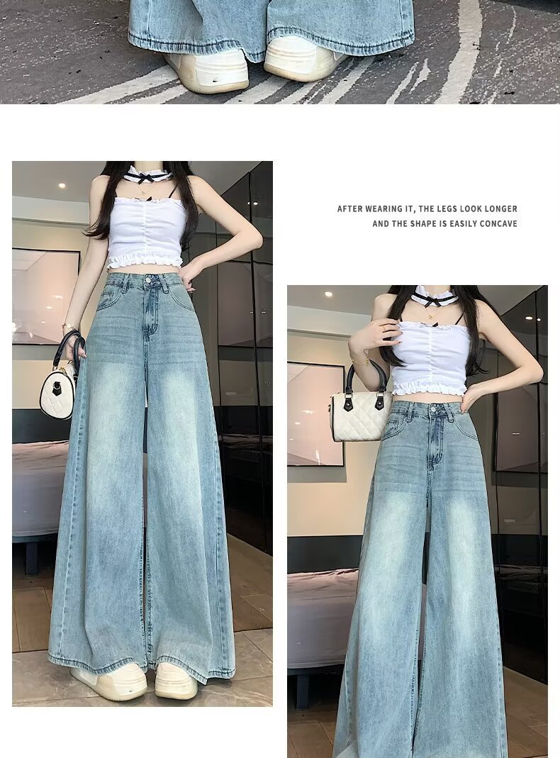 여름 여성용 광저우 대형 와이드 레그 청바지 얇은 하이 웨이스트 슬리밍 드레이프 루즈 스트레이트 바닥 길이 바지