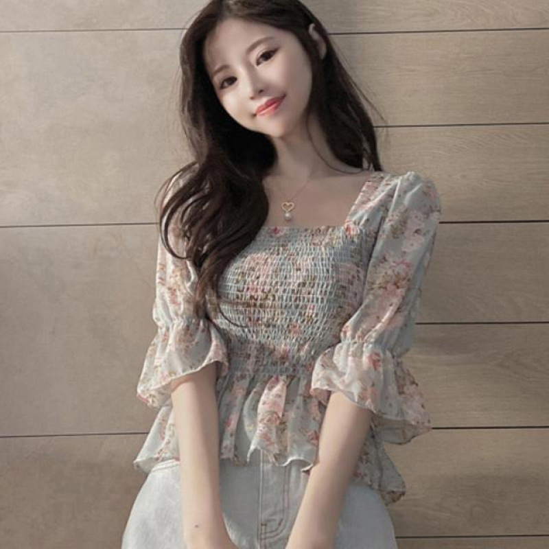 쉬폰 셔츠 여성의 새로운 봄과 여름 한국 달콤한 꽃 트럼펫 소매 랩 가슴 허리 슬리밍 짧은 셔츠 탑 여성스토어 가기