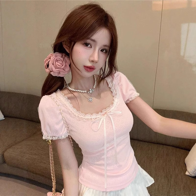 프렌치 레이싱 칼라 콘트라스트 컬러 스트랩 보우 걸의 슬림핏 슬리밍 탑 니티드 올 매치 버블 쇼트 티셔츠스토어 가기