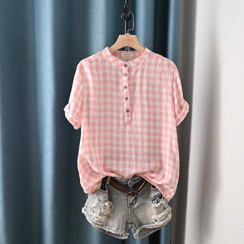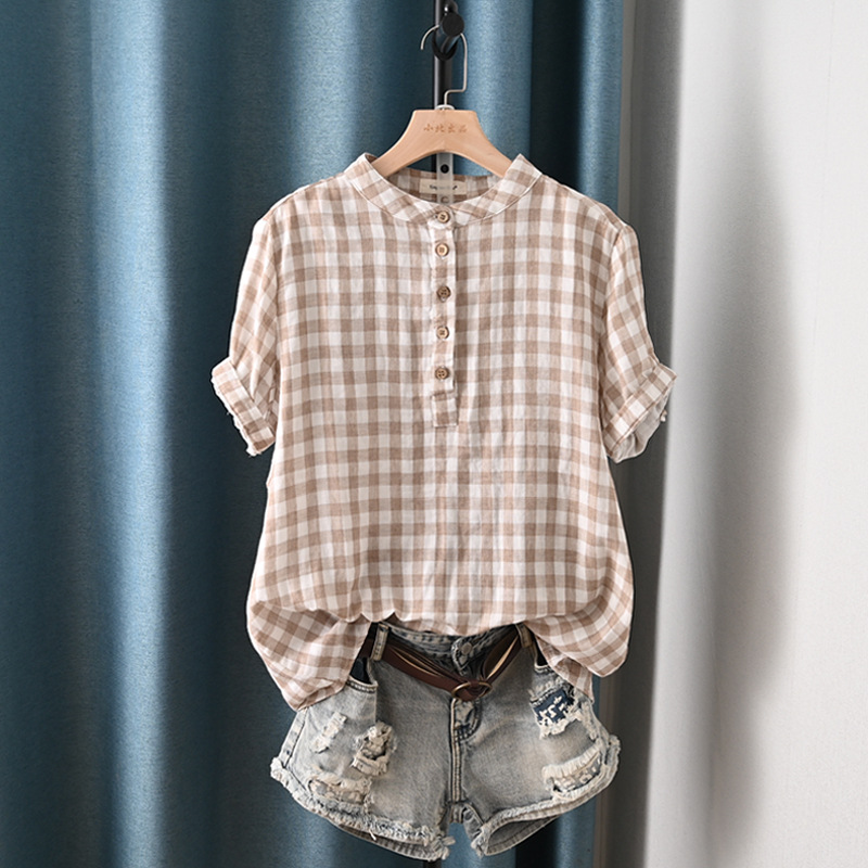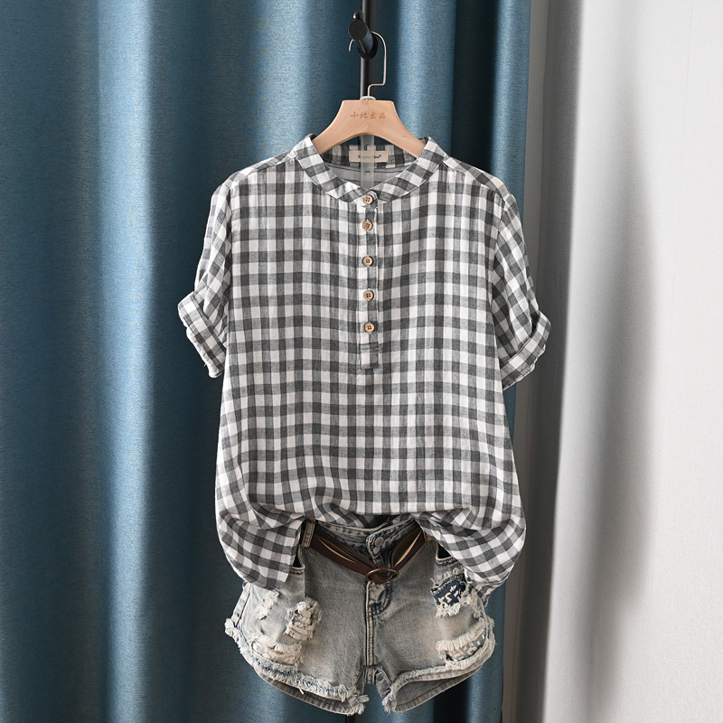 여름 디자인 레트로 칼라 코튼 거즈 반팔 체크 셔츠 일본 스타일 우아한 느슨한 통기성 탑스토어 가기
