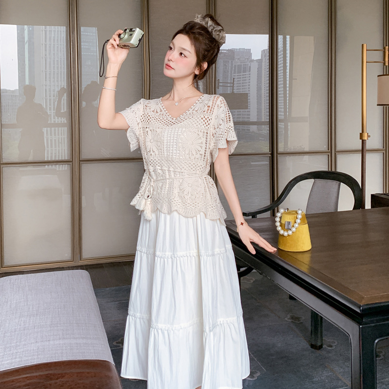 리얼 샷 프랑스 복고풍 중공 크로 셰 뜨개질 스웨터 서스펜더 스커트 투피스 2025 새로운 기질 슬림 세트
