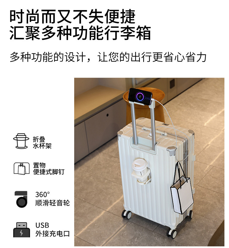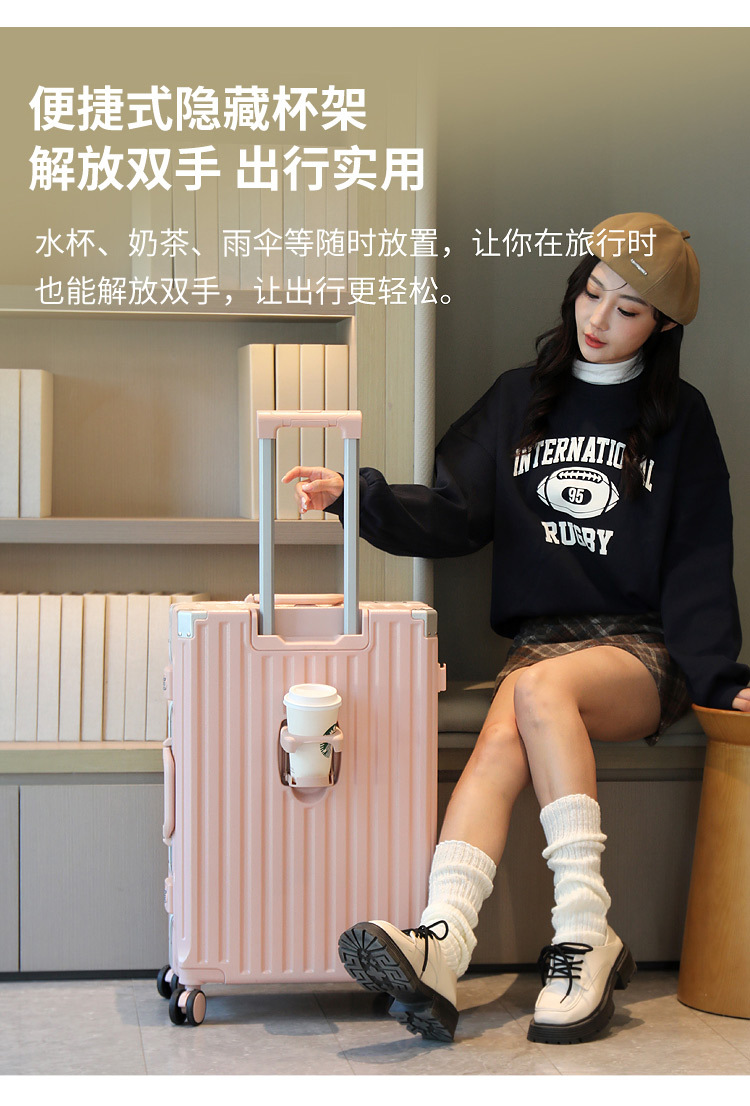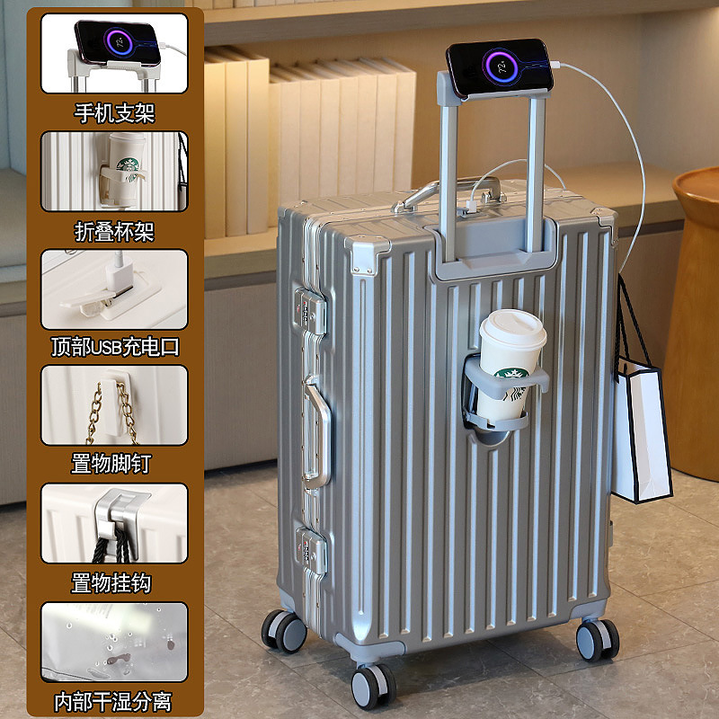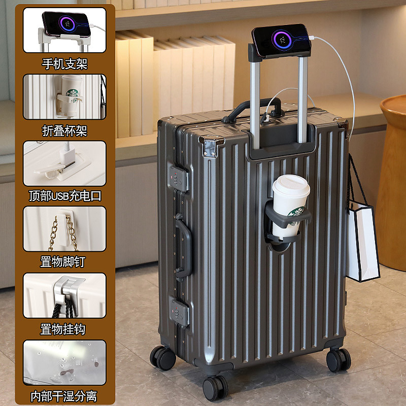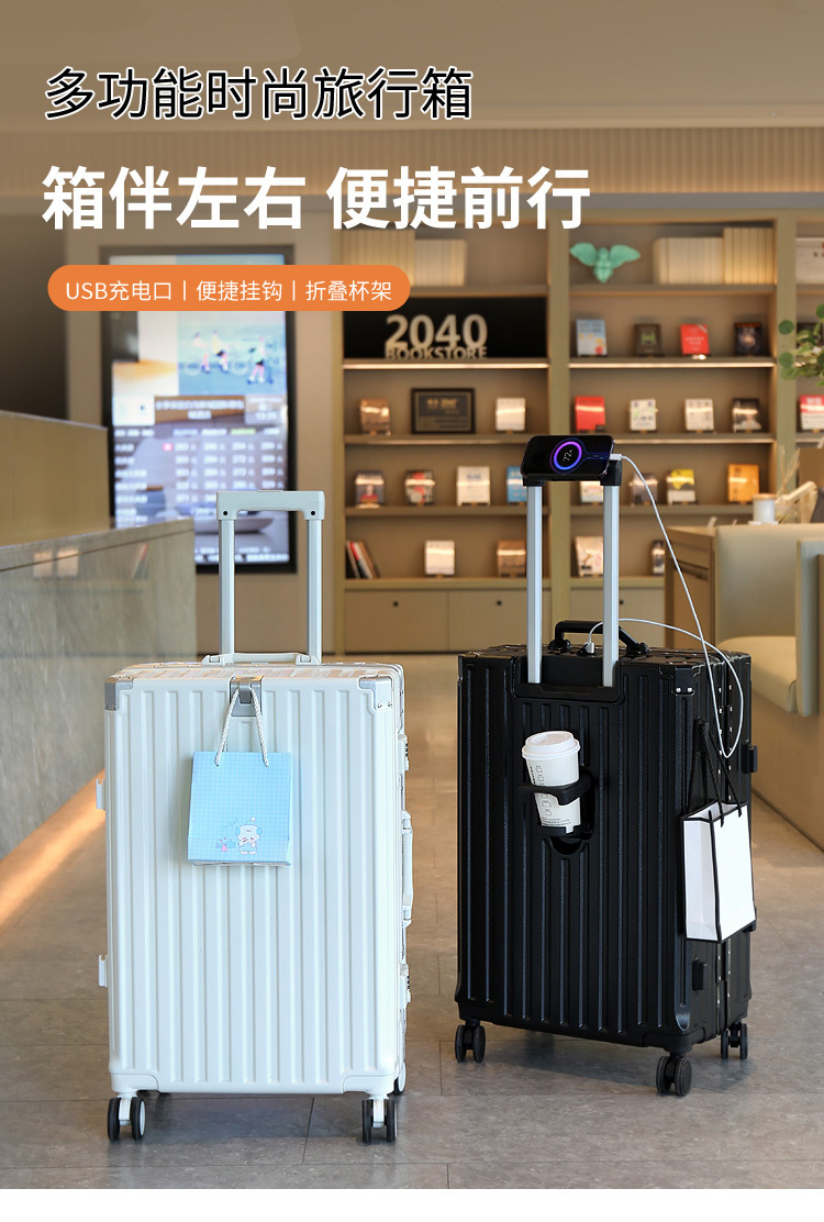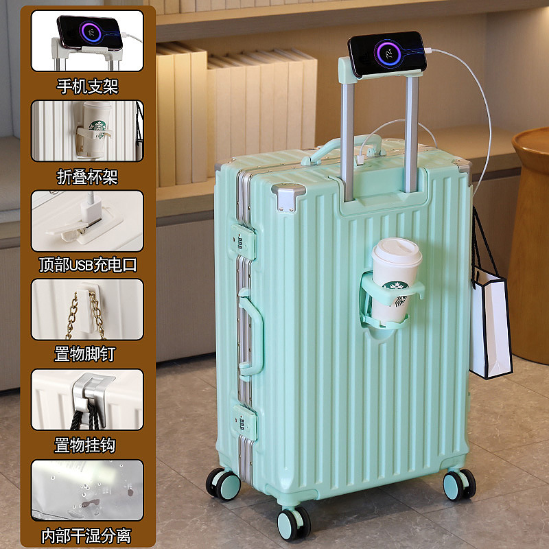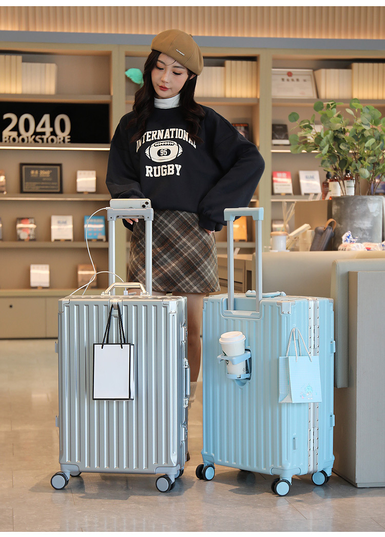 다기능 컵 홀더 가방 트롤리 케이스 여성 20inch 탑승 알루미늄 프레임 충전 대용량 여행 암호 가죽 케이스