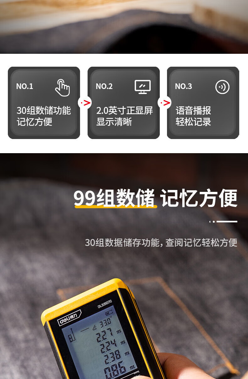 Deli DL331070 레이저 거리 측정기 대형 스크린 음성 리튬 배터리 70m 적외선 전자 눈금자 측정 장비스토어 가기