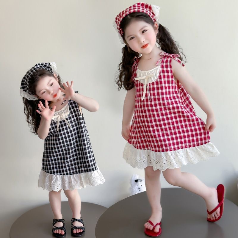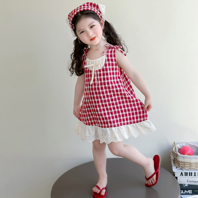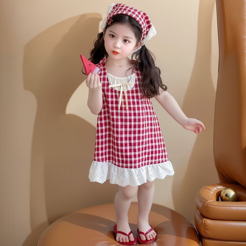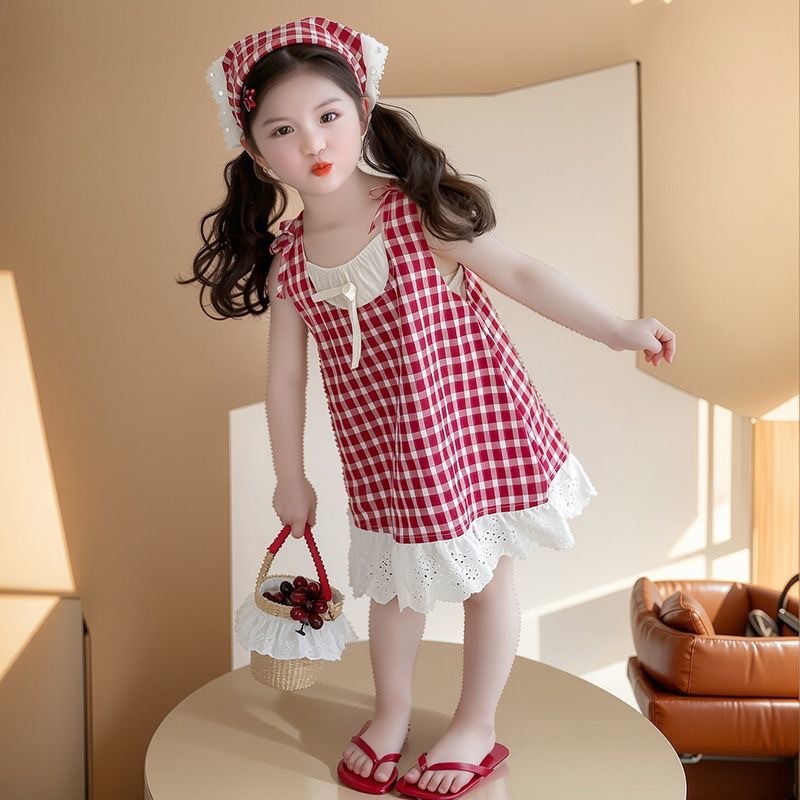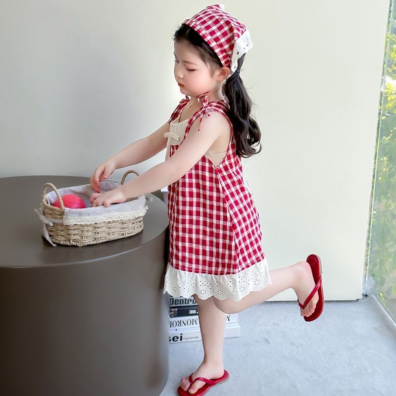 【48시간 배송】여름 여아용 민소매 레이스 체크무늬 스커트 레드 프린세스 스타일 원피스
