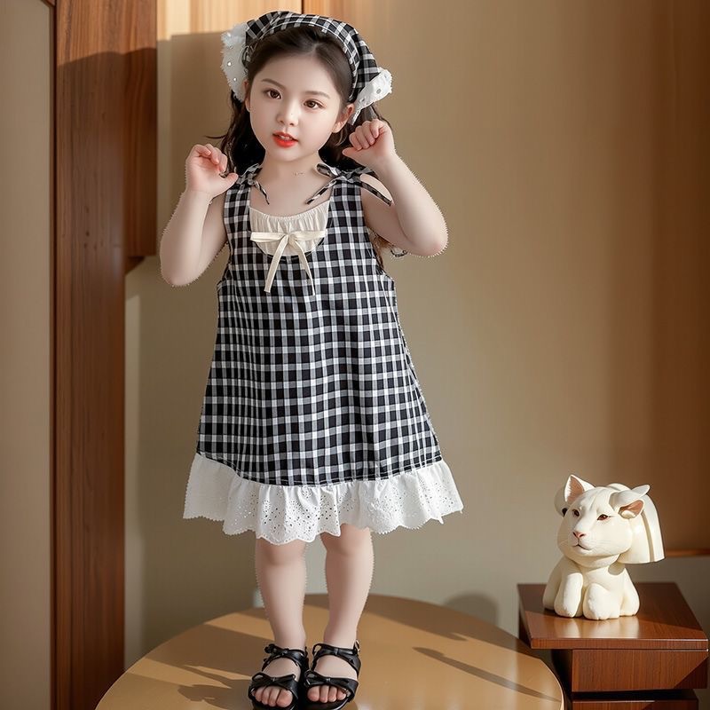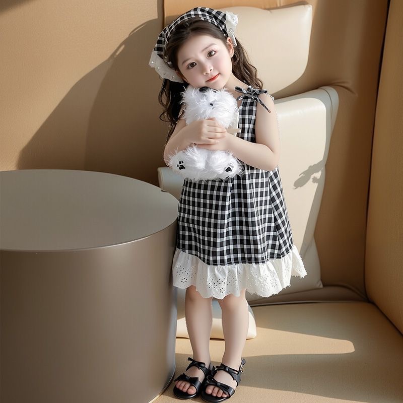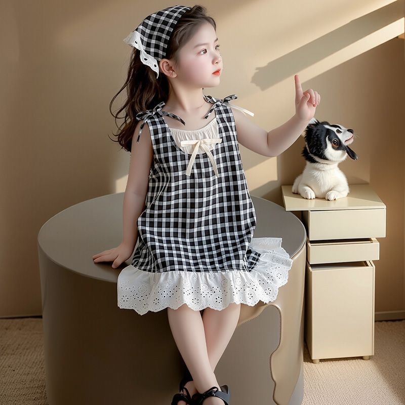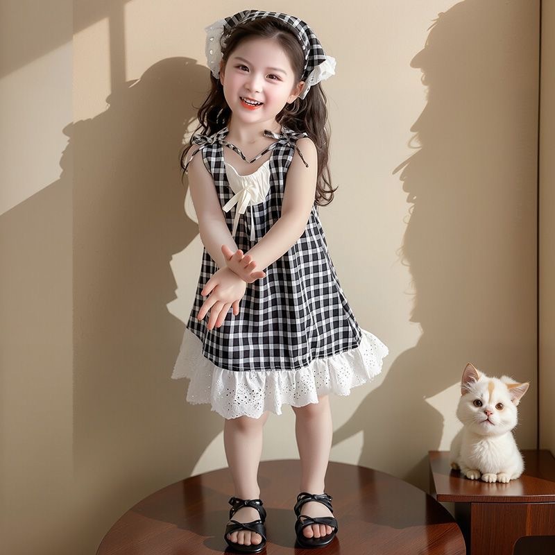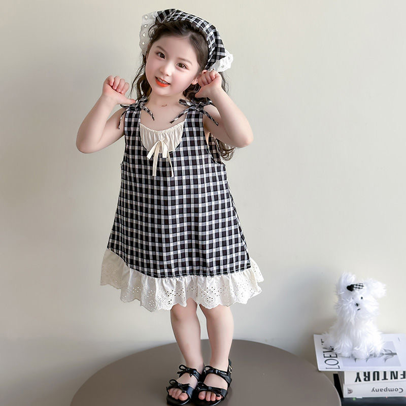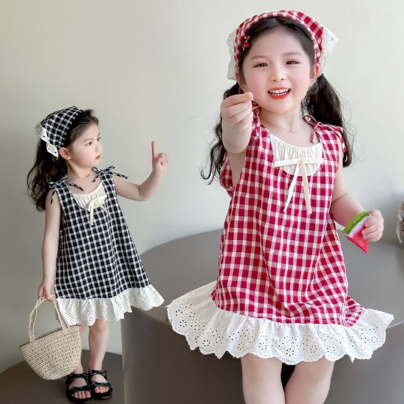 【48시간 배송】여름 여아용 민소매 레이스 체크무늬 스커트 레드 프린세스 스타일 원피스