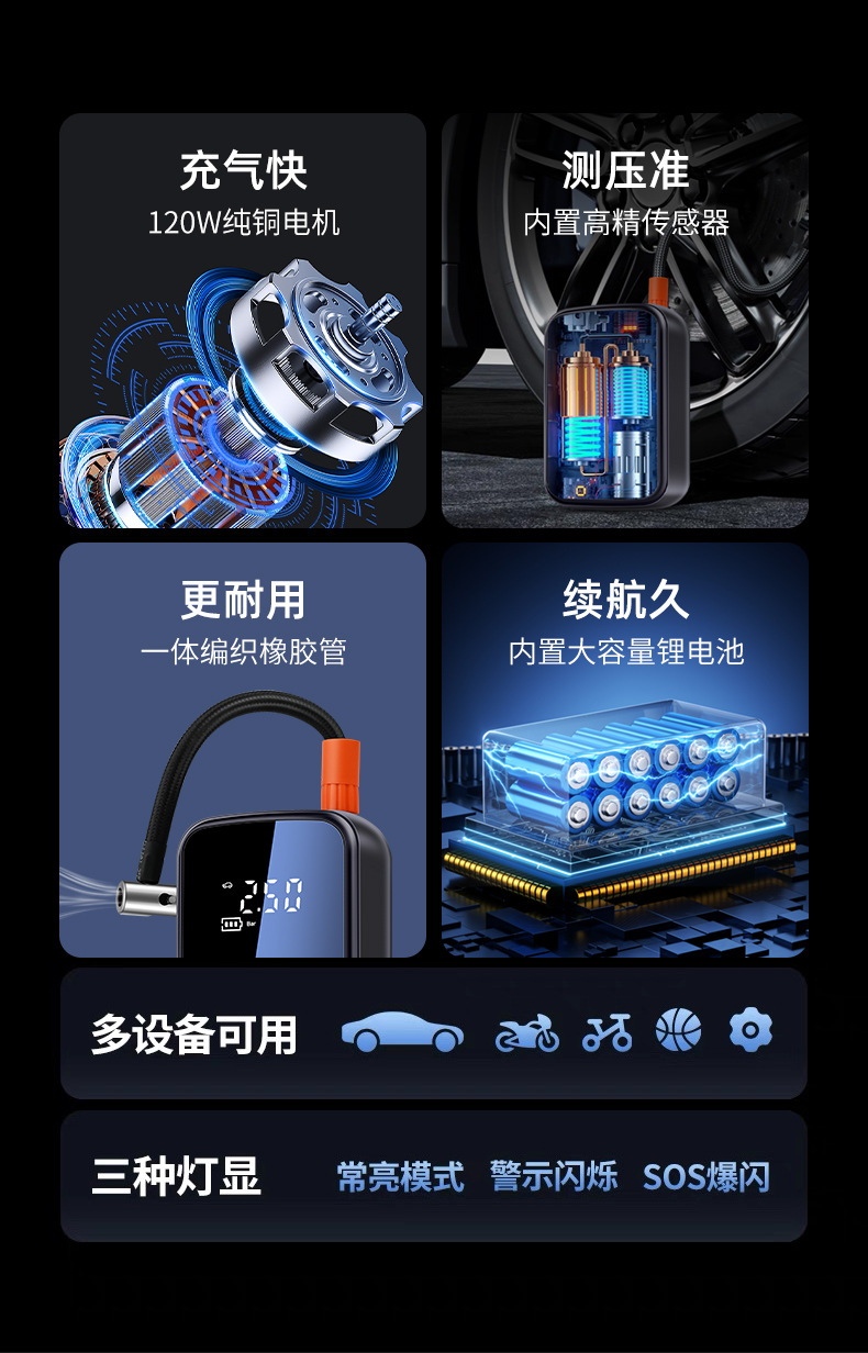 配件尺寸:充电线0.8M/点烟器线3M/充气管19CM