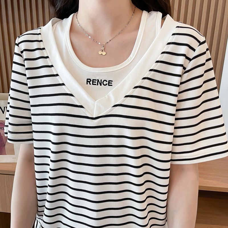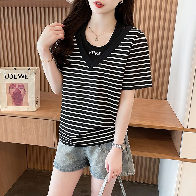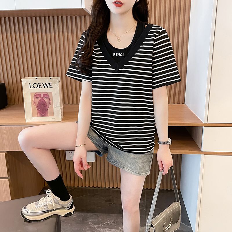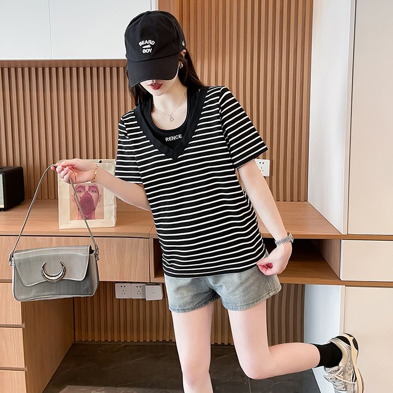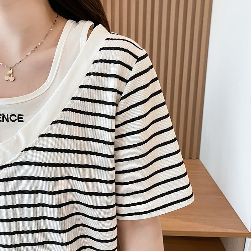 플러스 사이즈 여성 가짜 투피스 스트라이프 반팔 티셔츠 여자 여름 2025 새로운 루즈 통통녀 슬림 배꼽 커버 탑스토어 가기