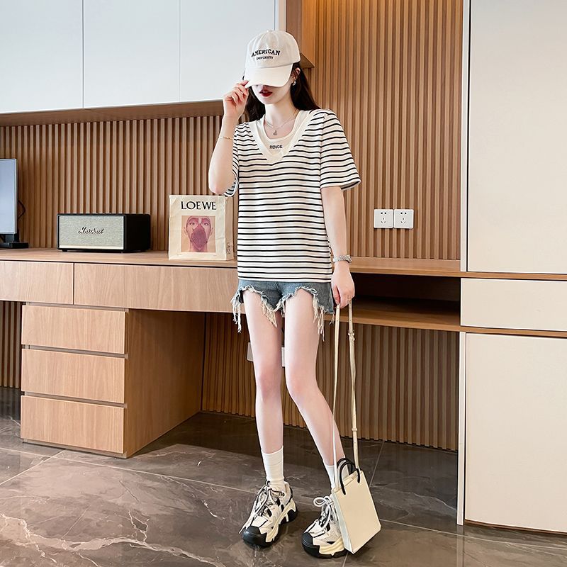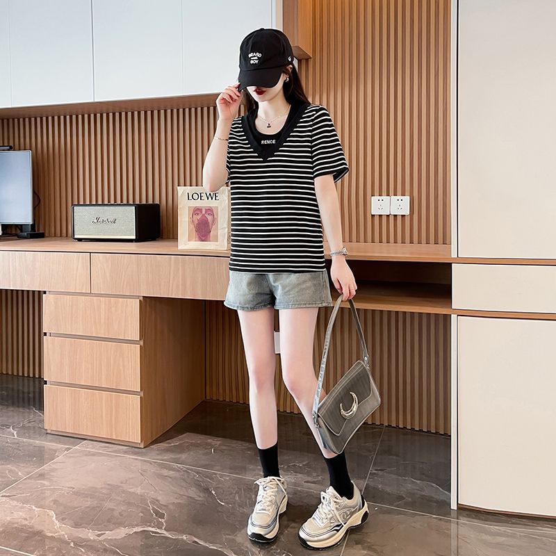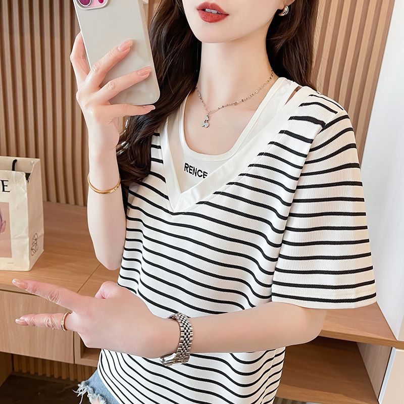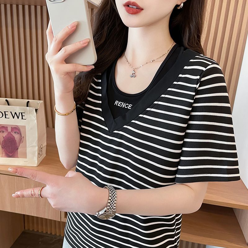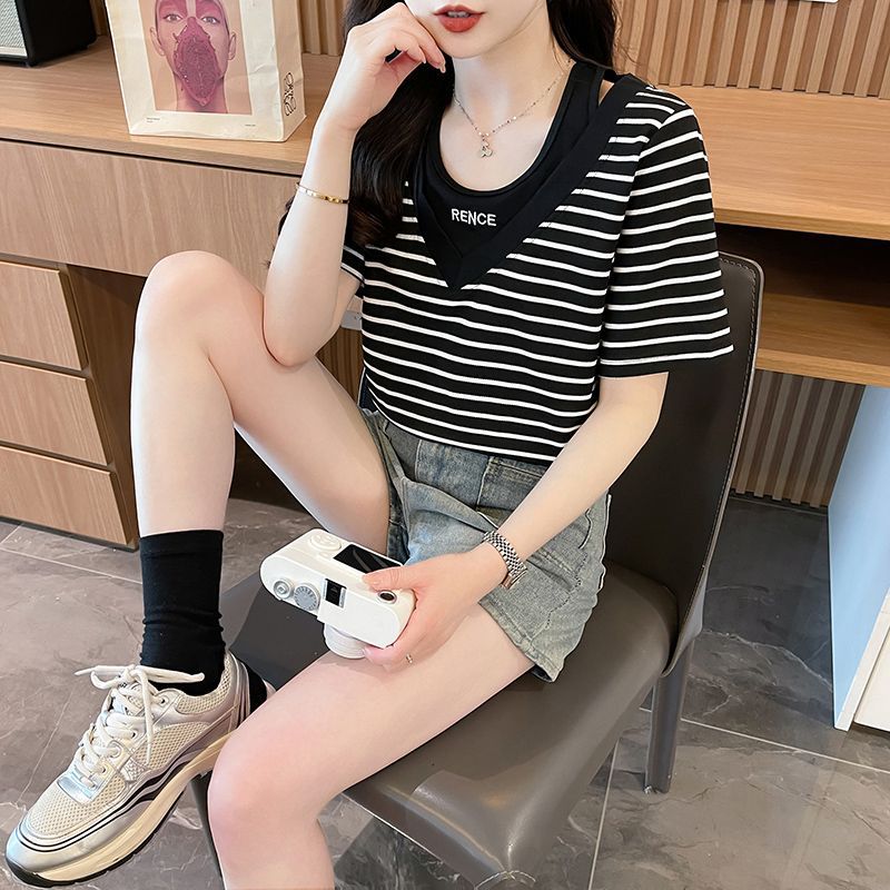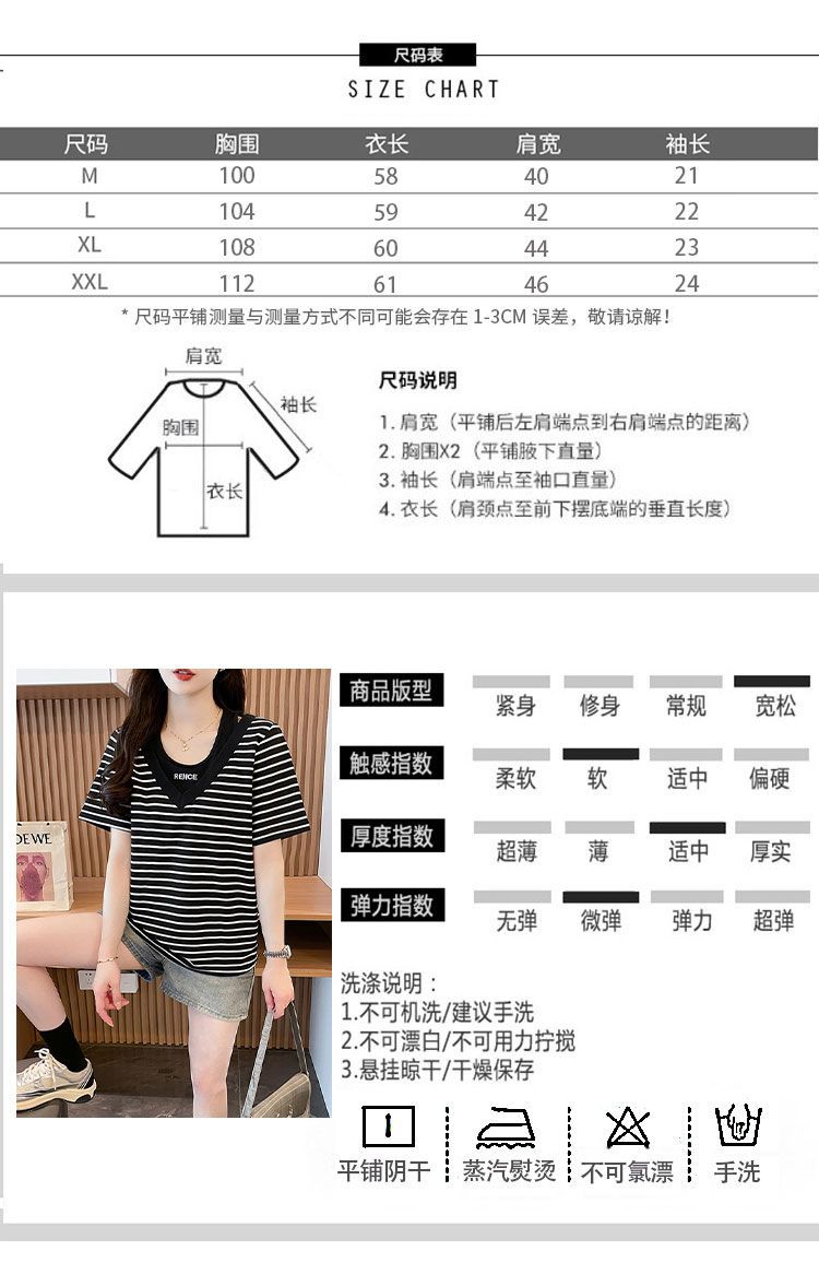 플러스 사이즈 여성 가짜 투피스 스트라이프 반팔 티셔츠 여자 여름 2025 새로운 루즈 통통녀 슬림 배꼽 커버 탑스토어 가기