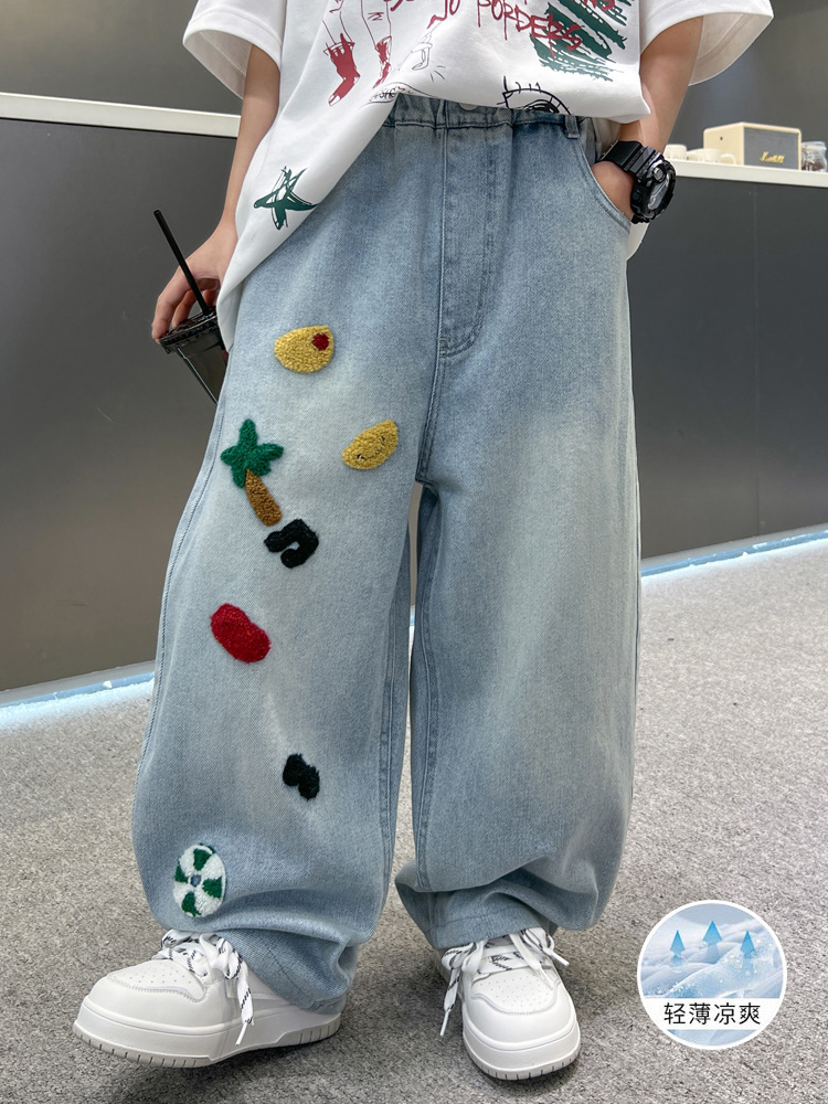 소년 바지 여름 얇은 2025 새로운 어린이 여름 얼음 실크 스트레이트 청바지 중형 및 대형 어린이 모기 방지 바지 유행스토어 가기