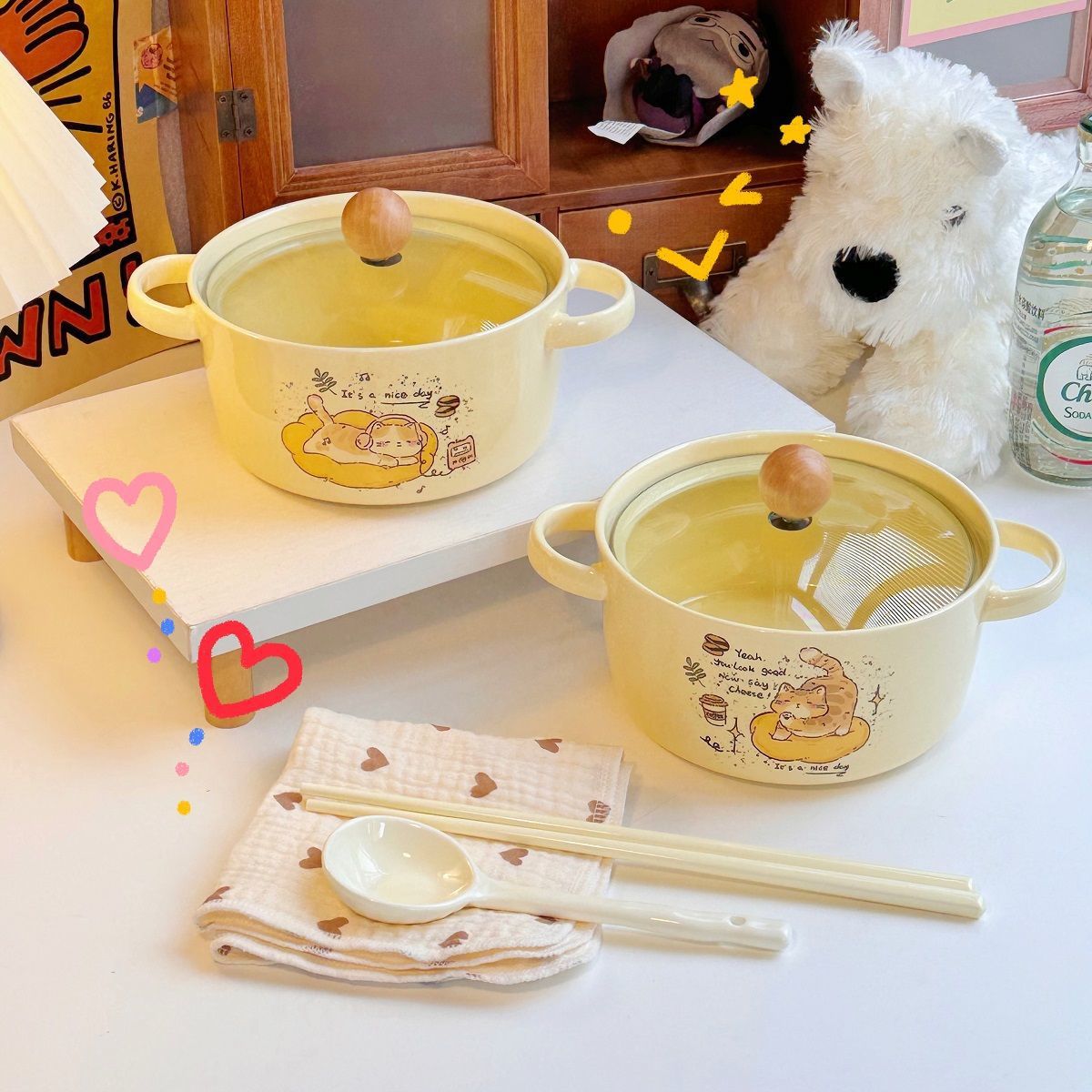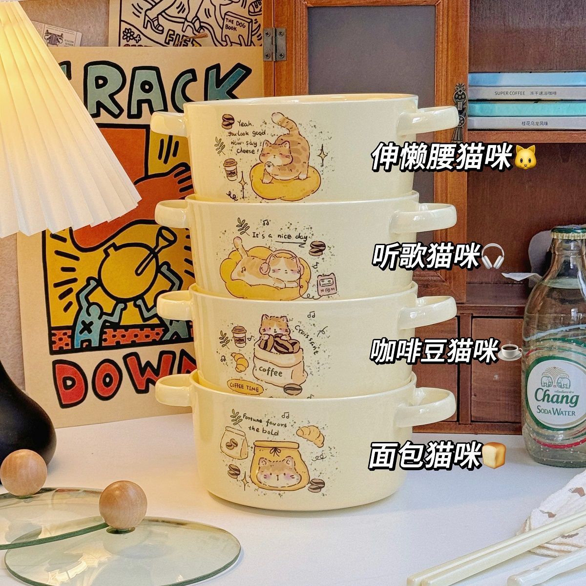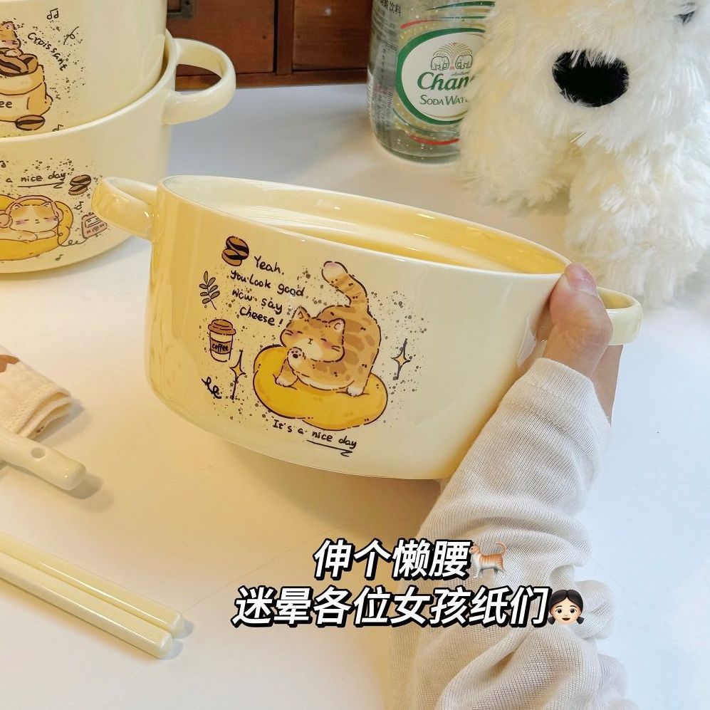 ins 고양이 컨트롤 인스턴트 국수 그릇 소녀 하트 학생 기숙사 인스턴트 국수 그릇 뚜껑이 있는 고급스러운 세라믹 전자레인지 사용 가능스토어 가기