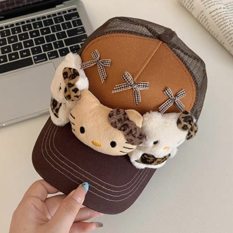 레오파드 무늬 헬로 키티 인형 야구 모자 봄과 여름 그리드 캡 만화 kt 고양이 피크 캡 통기성 y2k 핫 걸