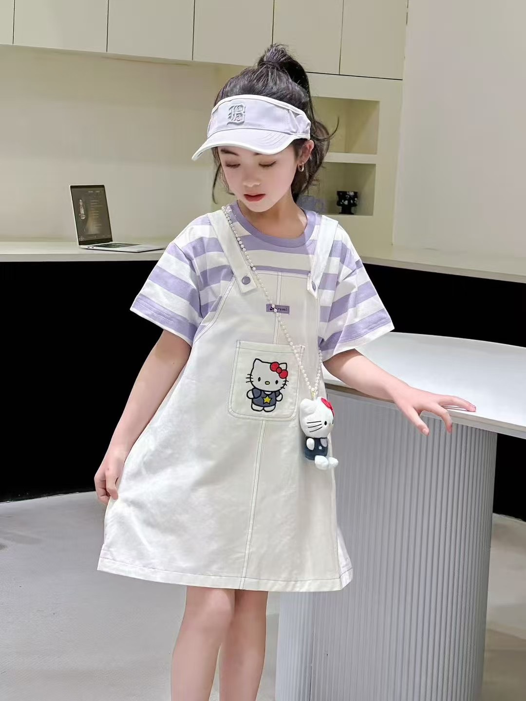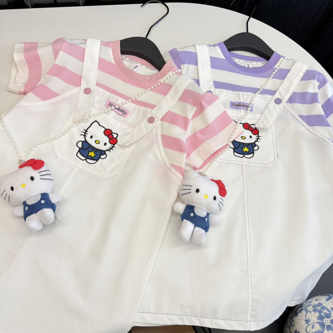 KT 고양이 드레스 여아 여름 드레스 세련된 어린이 가짜 투피스 서스펜더 스커트 여름 여아 모두 작은 액세서리가 함께 제공됩니다.스토어 가기
