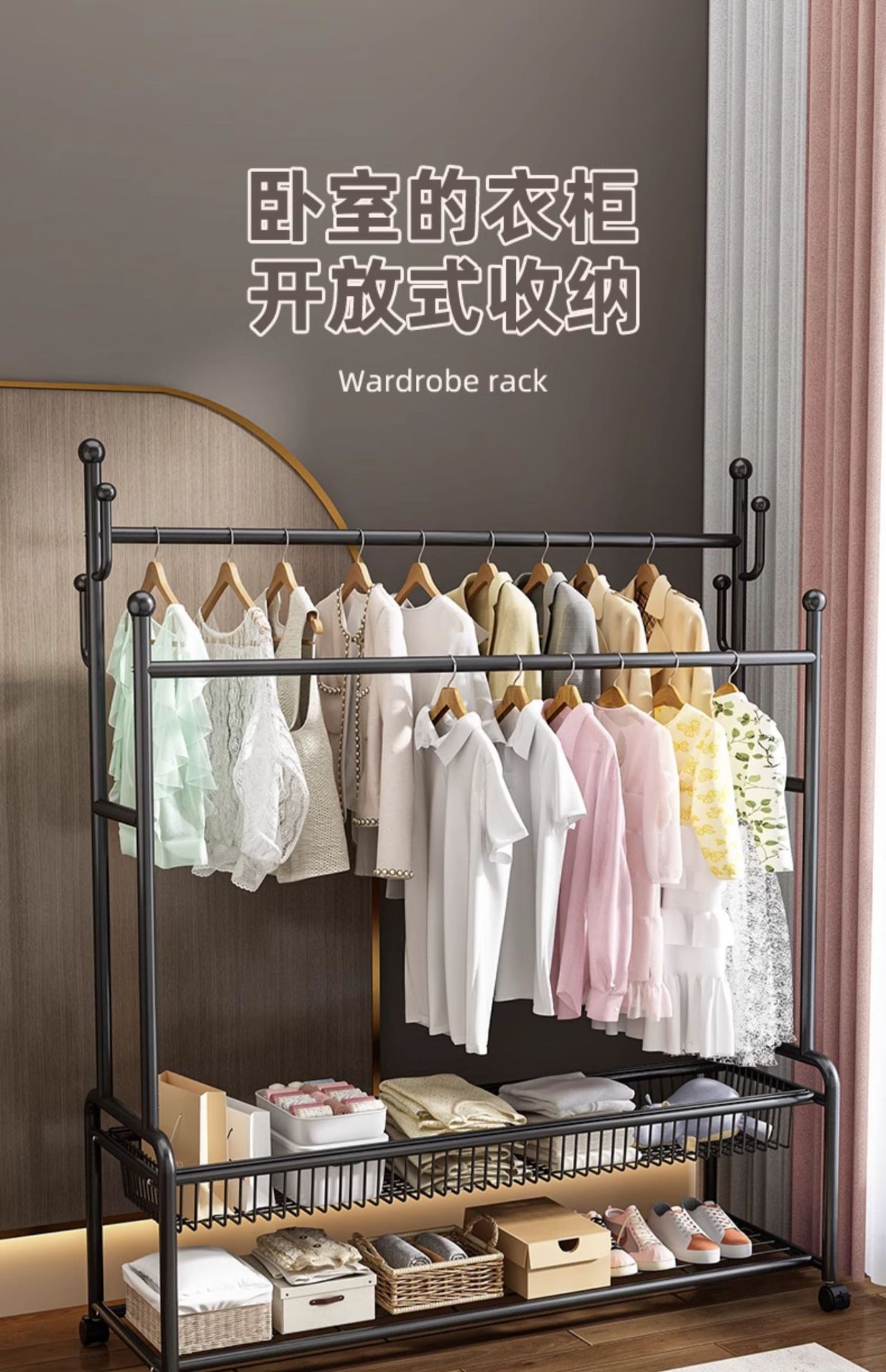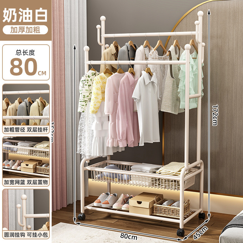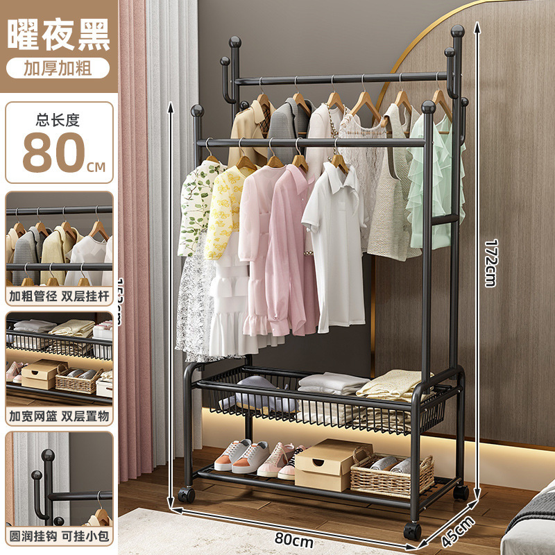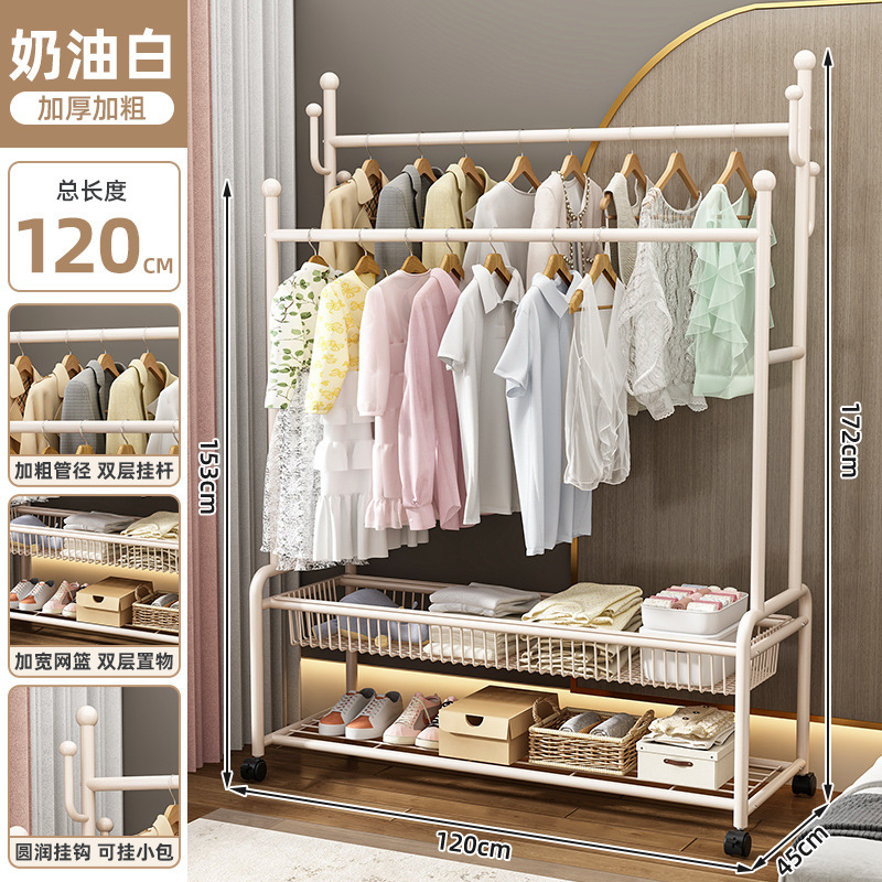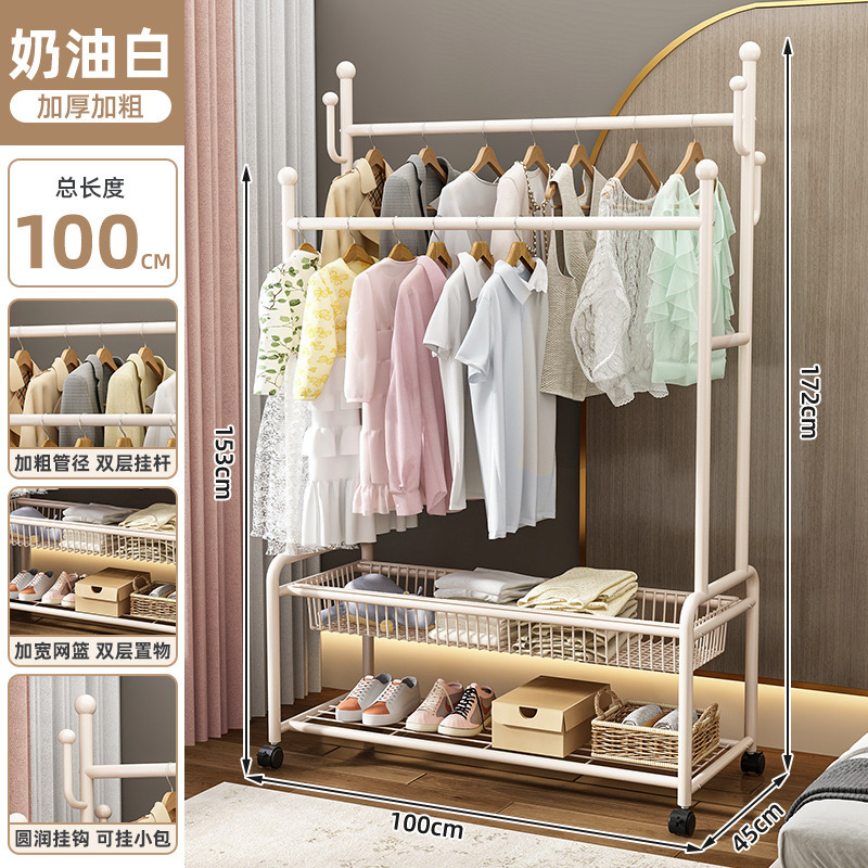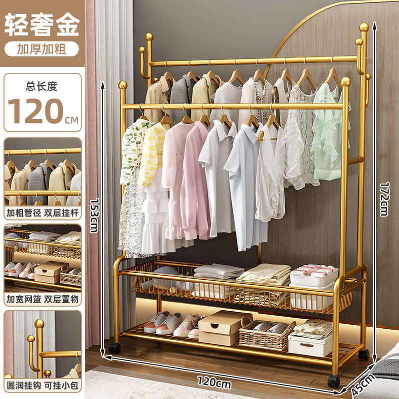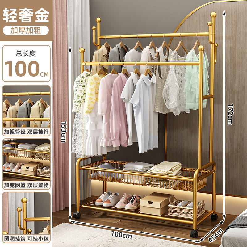 간단한 이중 막대 침실 코트 랙 바닥 스탠딩 모바일 홈 거실 발코니 건조 막대 옷 걸이 랙