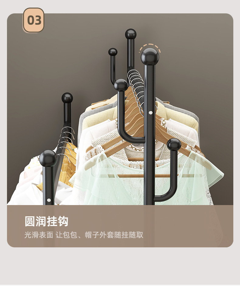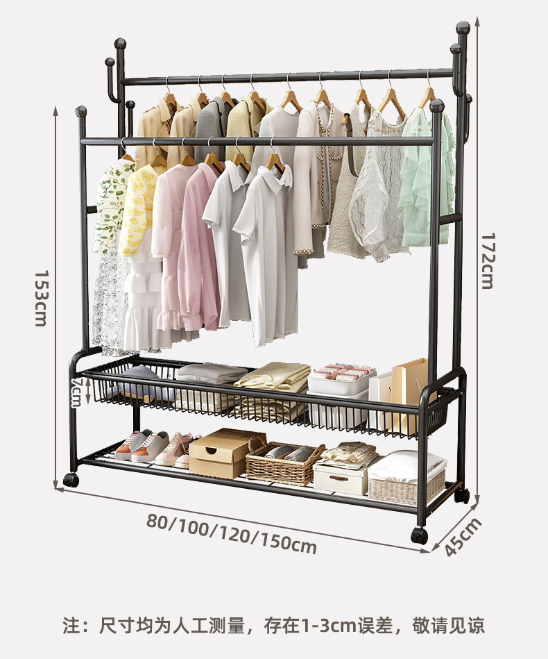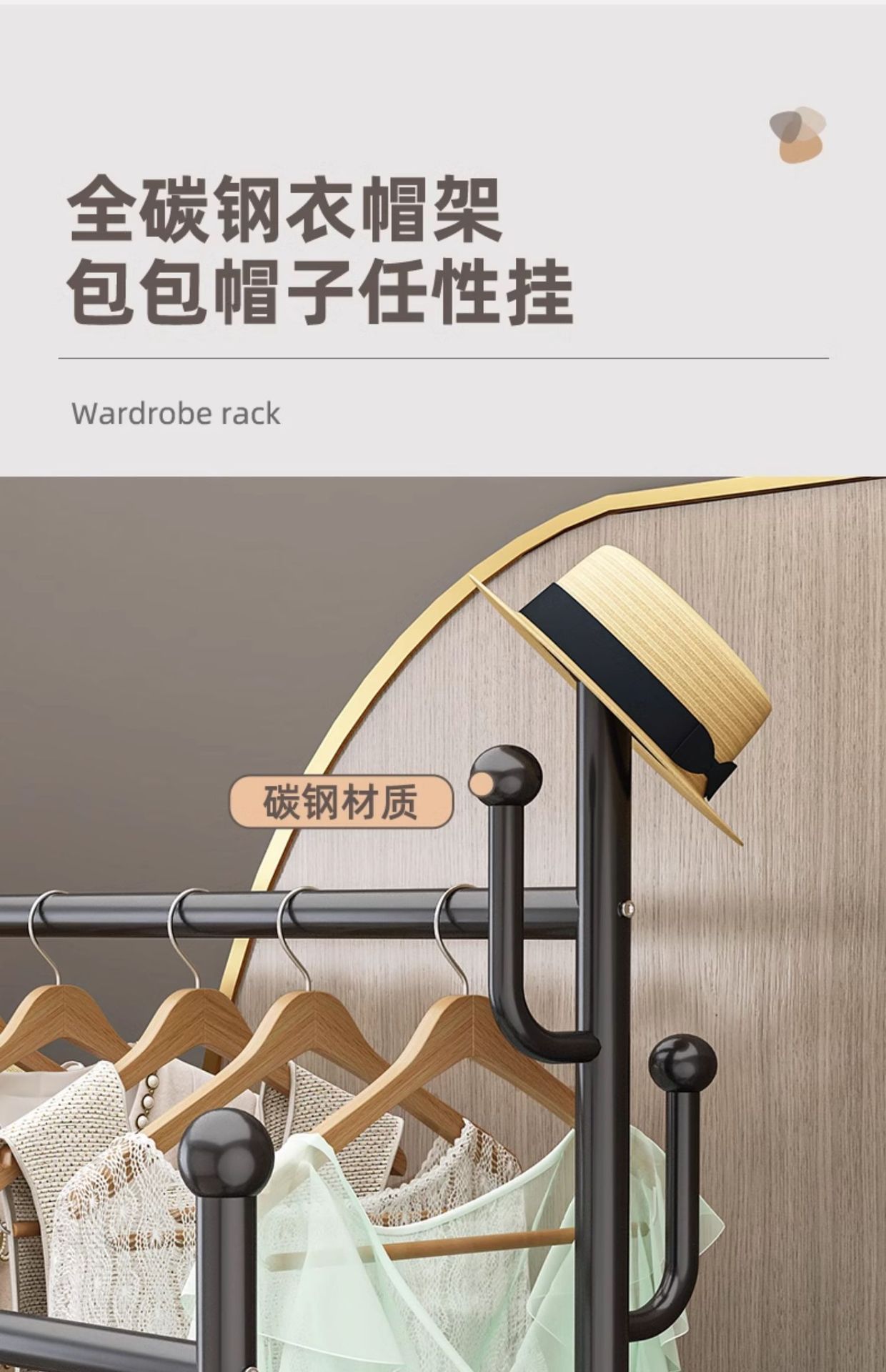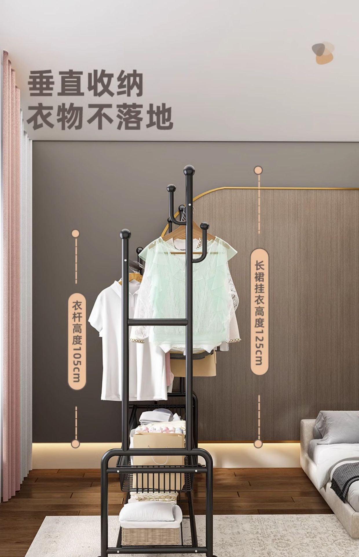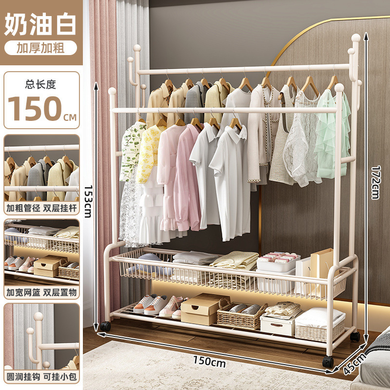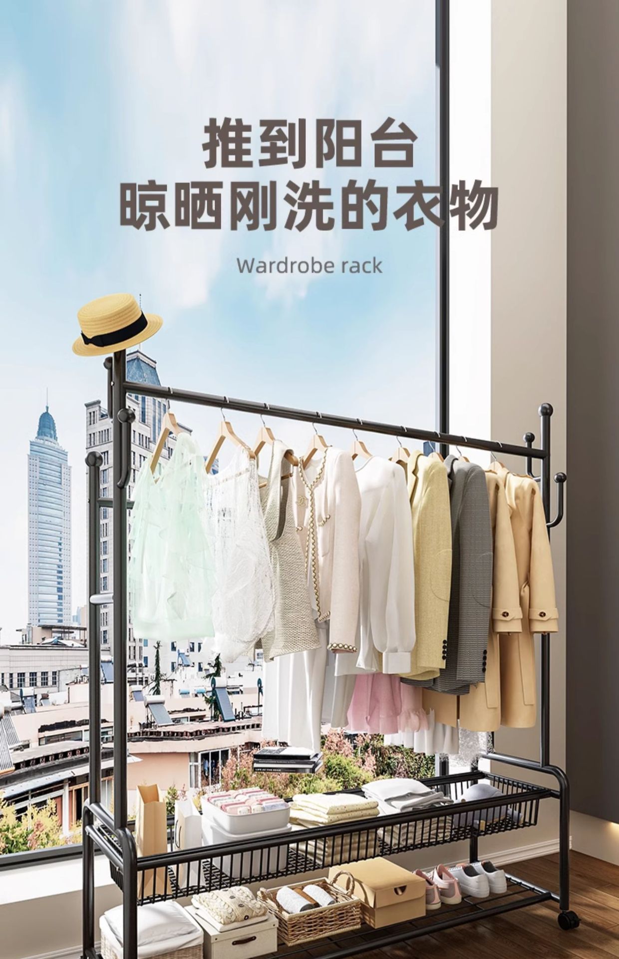간단한 이중 막대 침실 코트 랙 바닥 스탠딩 모바일 홈 거실 발코니 건조 막대 옷 걸이 랙