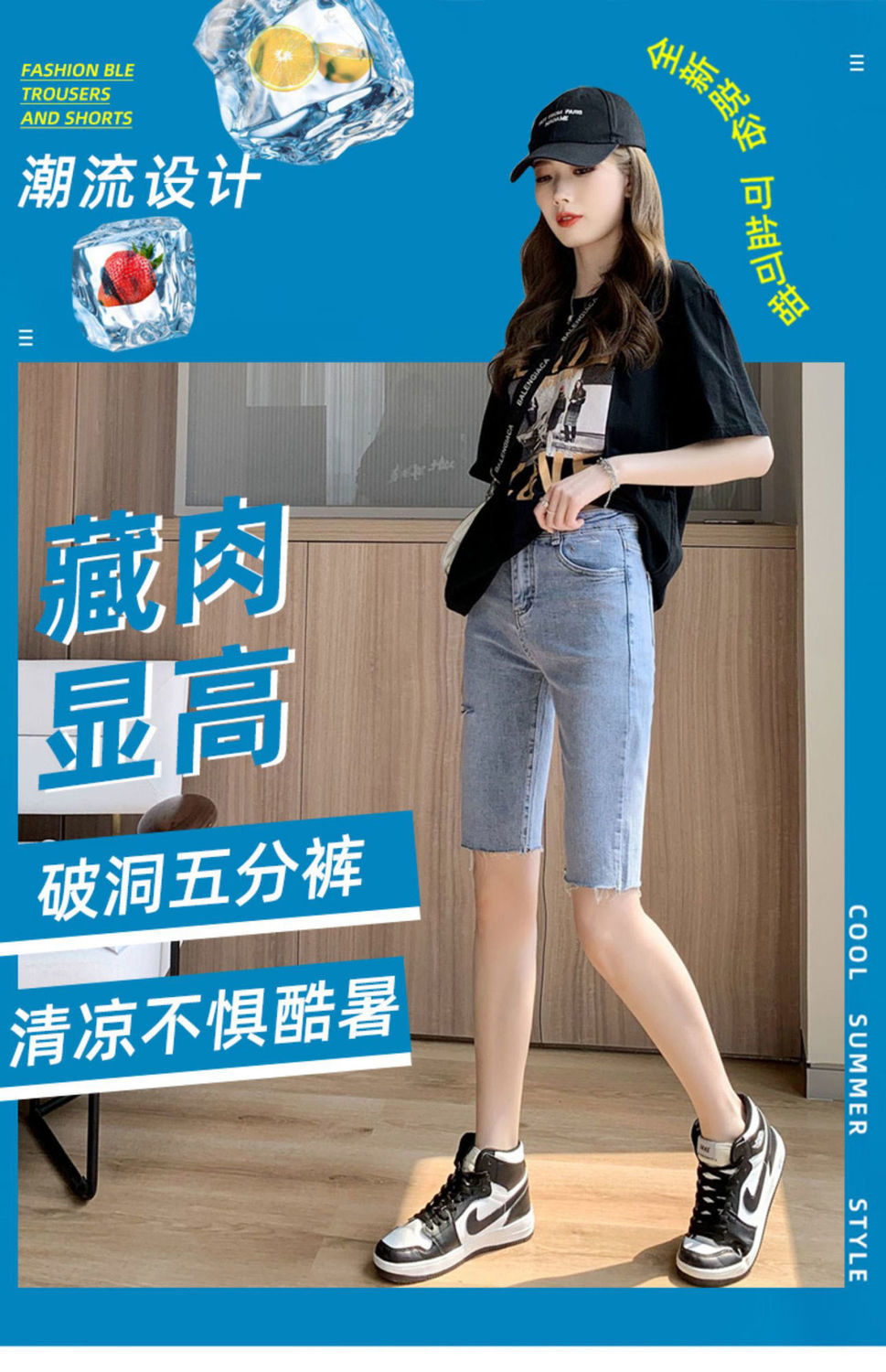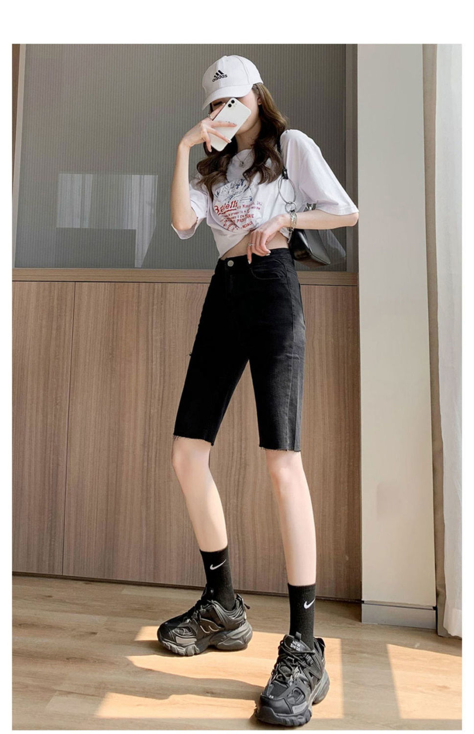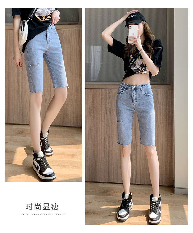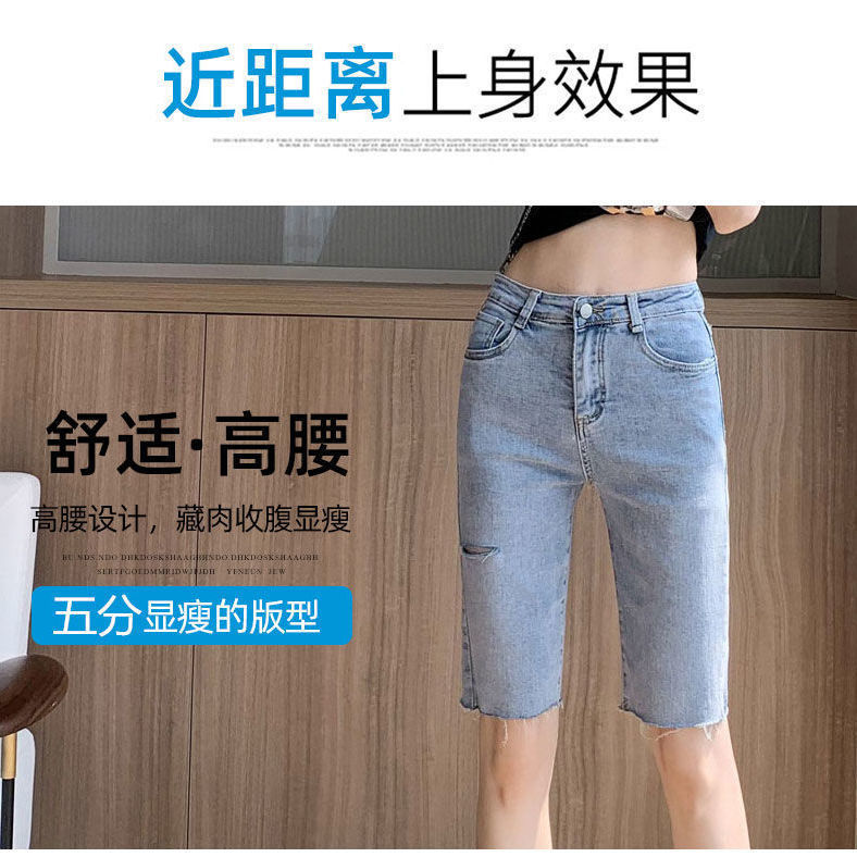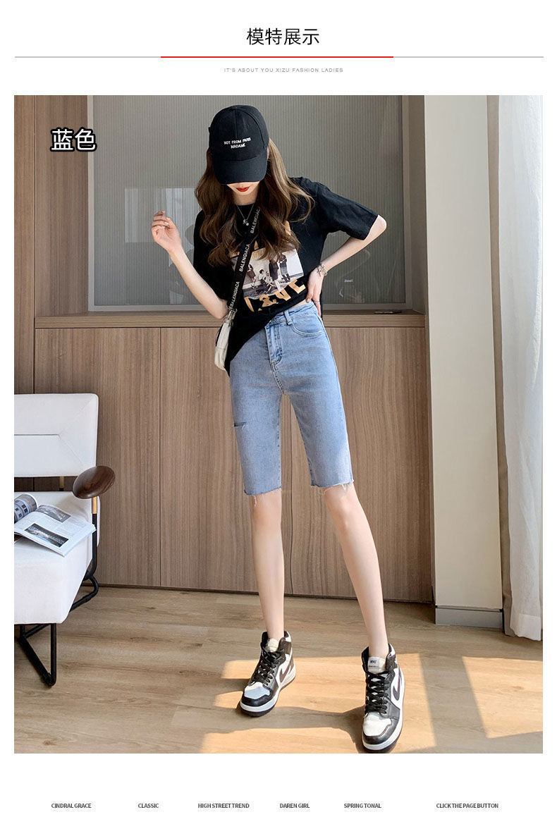 여름 신상 5부 하이웨이스트 얇은 찢어진 데님 반바지 여성용 스트레치 사이클링 한국식 타이트하고 다재다능한 미드팬츠 트렌디스토어 가기