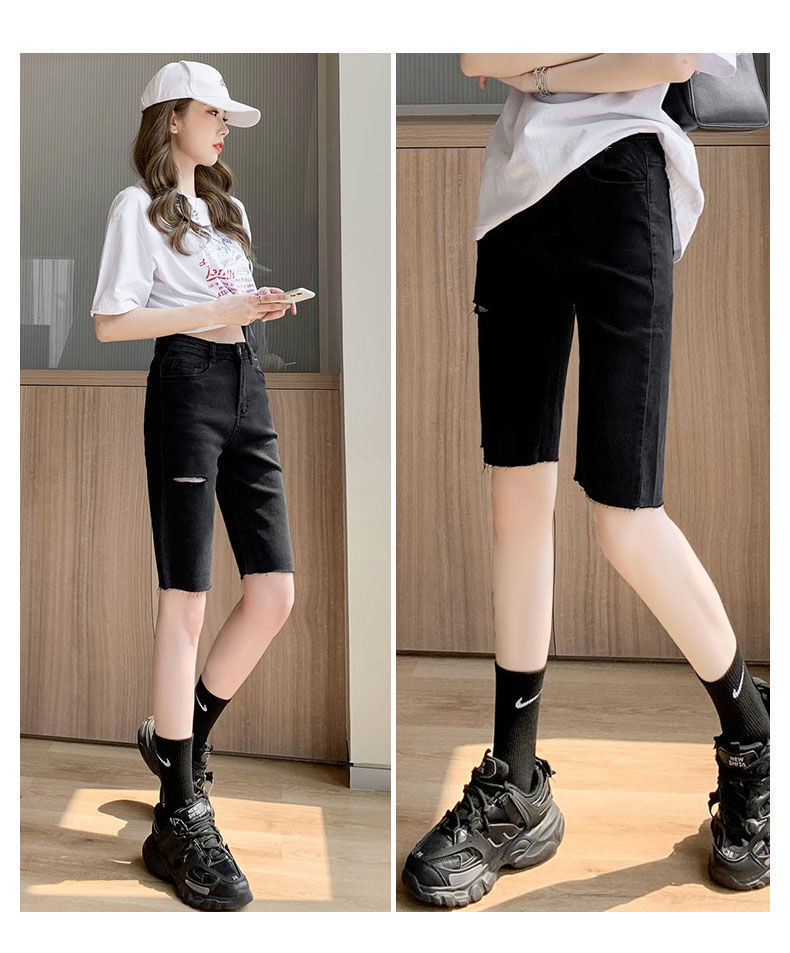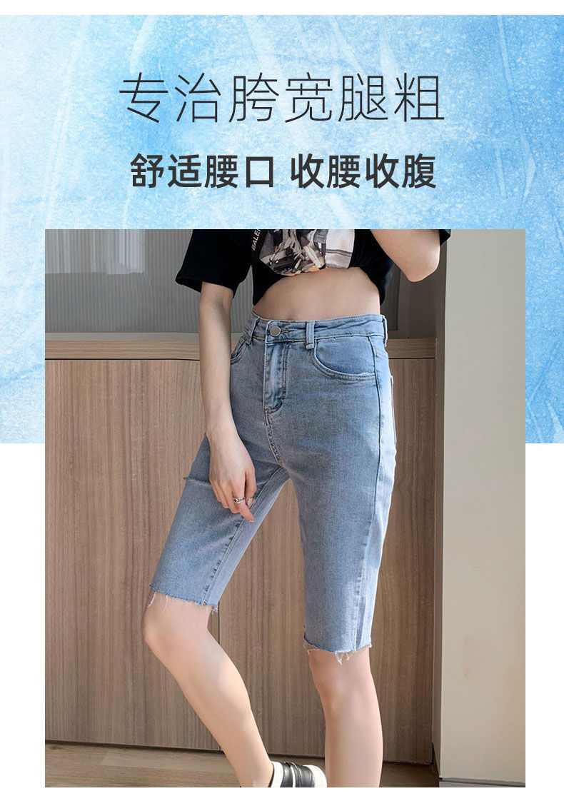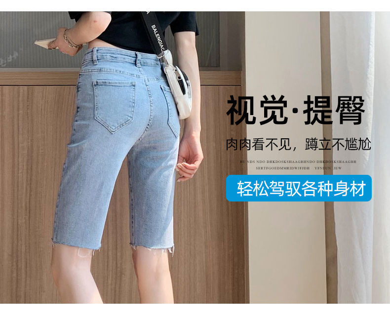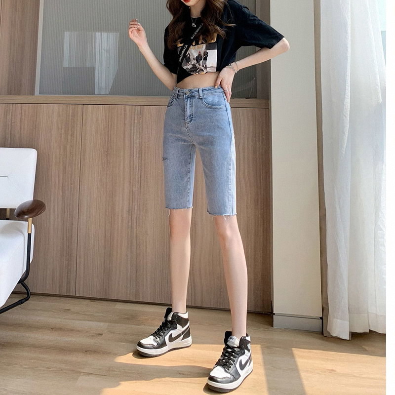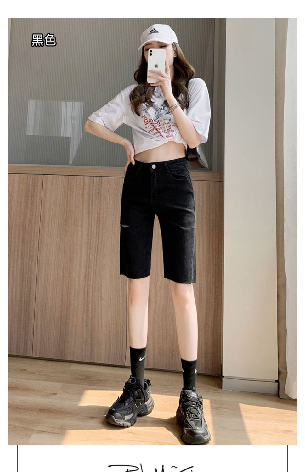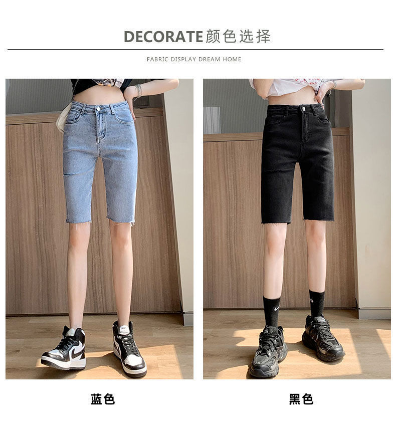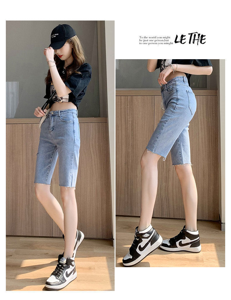 여름 신상 5부 하이웨이스트 얇은 찢어진 데님 반바지 여성용 스트레치 사이클링 한국식 타이트하고 다재다능한 미드팬츠 트렌디스토어 가기