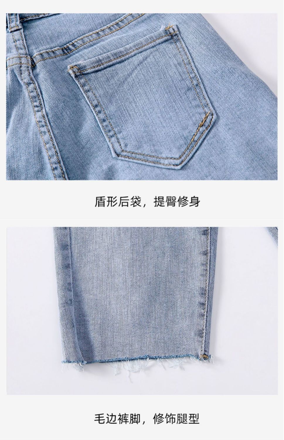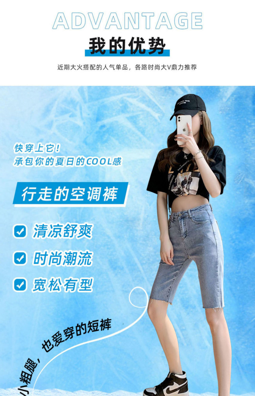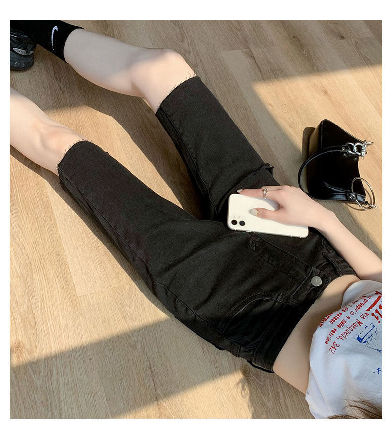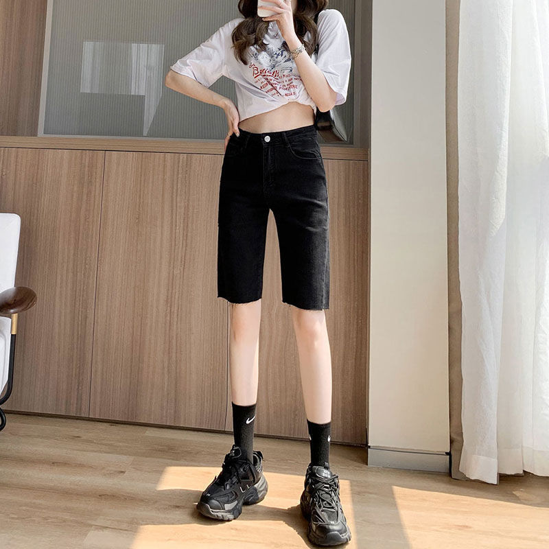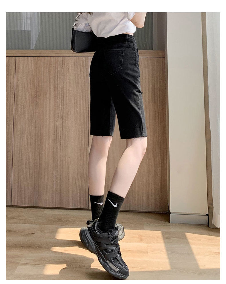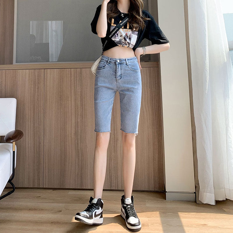 여름 신상 5부 하이웨이스트 얇은 찢어진 데님 반바지 여성용 스트레치 사이클링 한국식 타이트하고 다재다능한 미드팬츠 트렌디스토어 가기