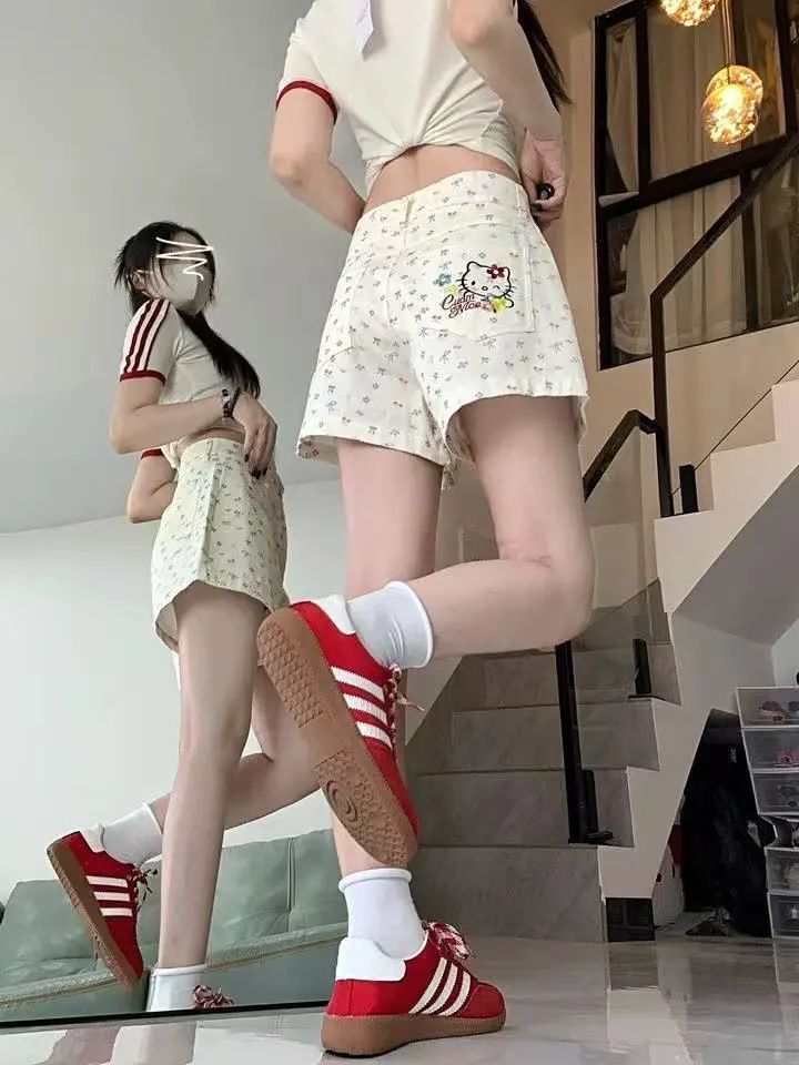 여자 흉한 스타일 체리 꽃 키티 고양이 인쇄 반바지 여성의 2025 년 여름 새로운 패션 자수 바지