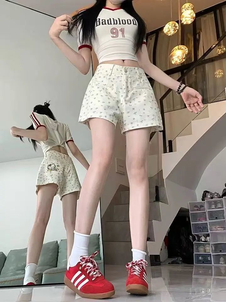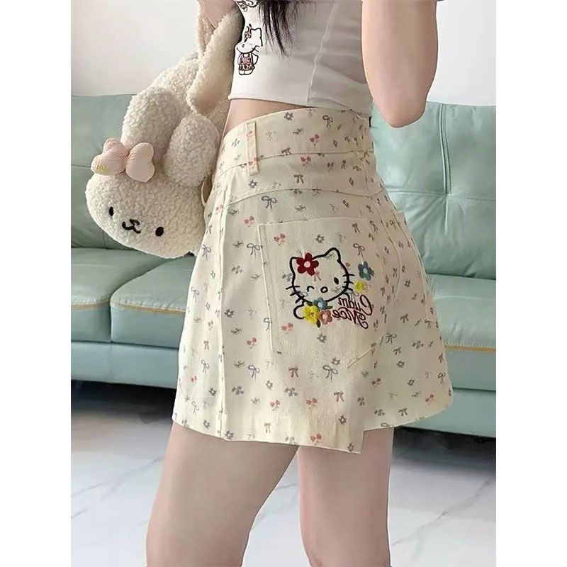 여자 흉한 스타일 체리 꽃 키티 고양이 인쇄 반바지 여성의 2025 년 여름 새로운 패션 자수 바지스토어 가기
