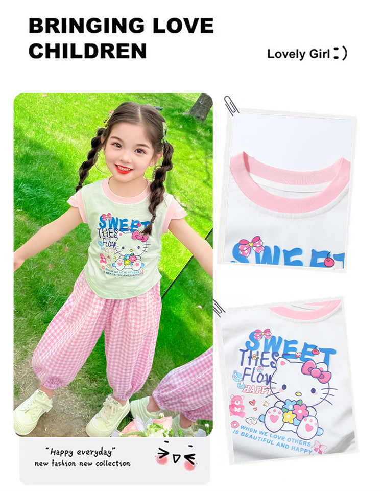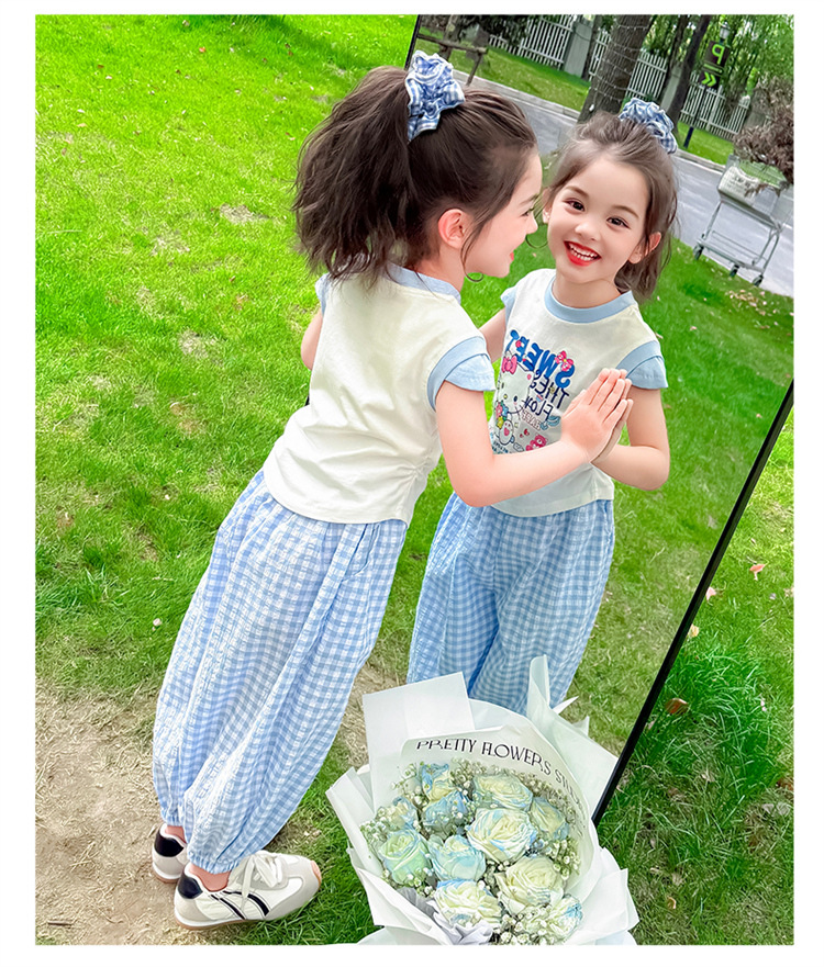 여자 만화 반팔 양복 여름 2025 새로운 어린이 인터넷 연예인 투피스 세트 아기 소녀 격자 무늬 바지 캐주얼웨어스토어 가기