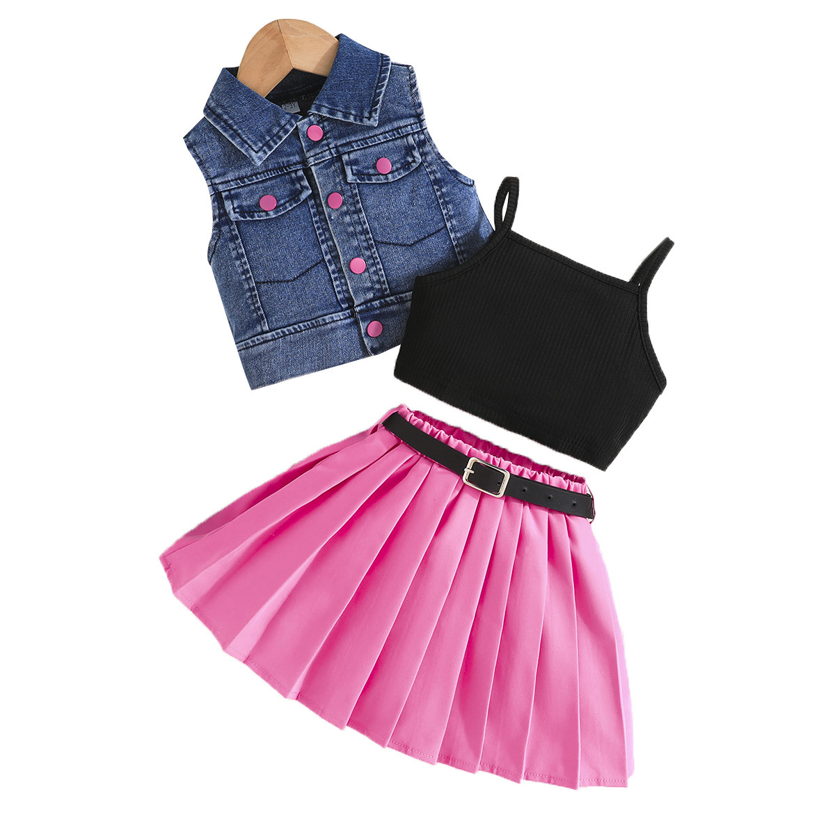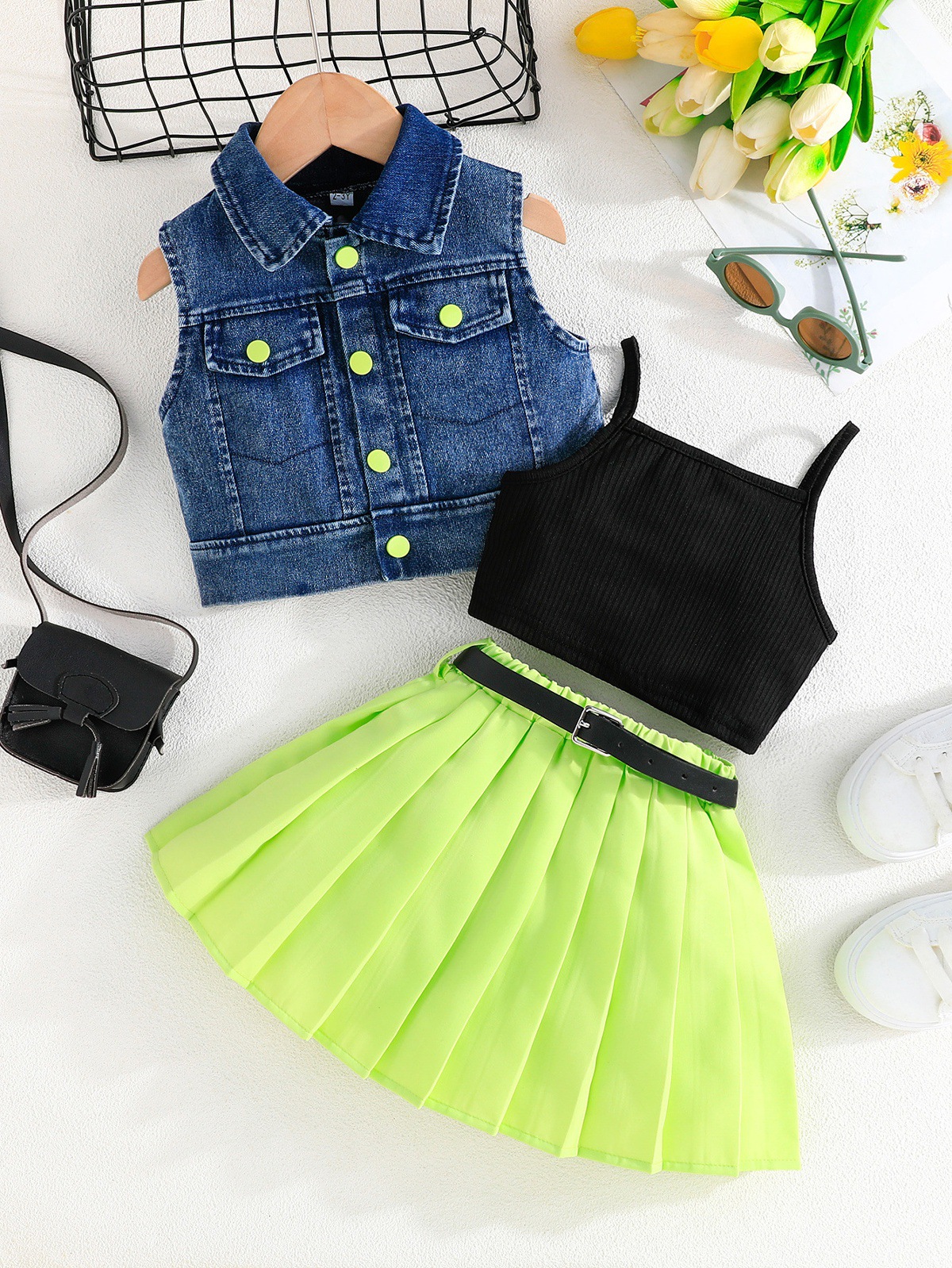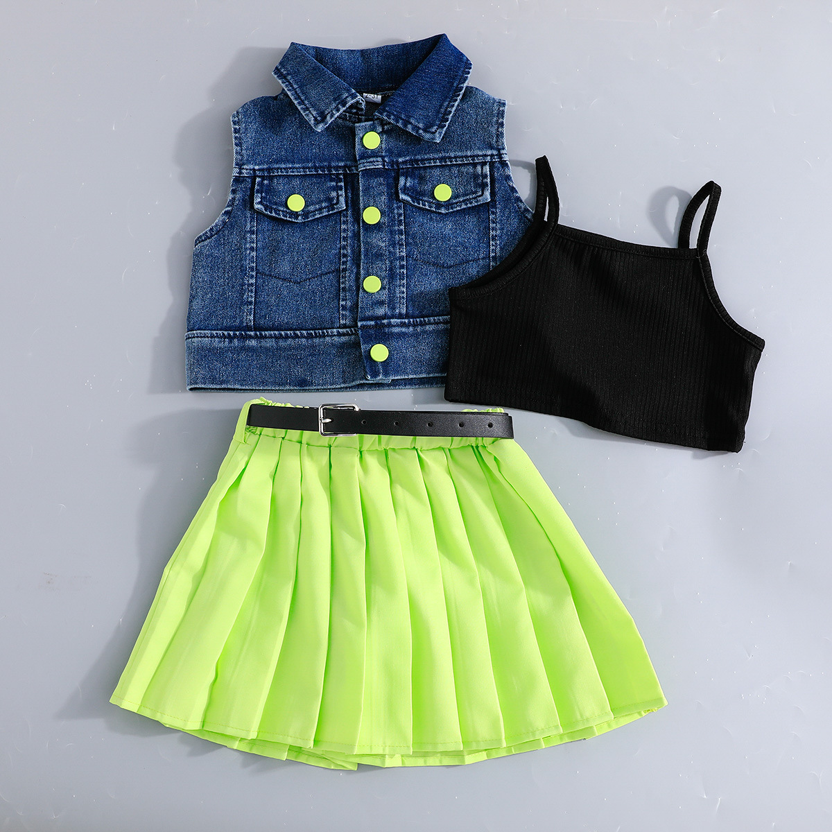 국경 간 신제품 여름 소녀 데님 조끼 탑 + 서스펜더 속옷 + 녹색 100% off 스커트 + 벨트 4 피스 세트