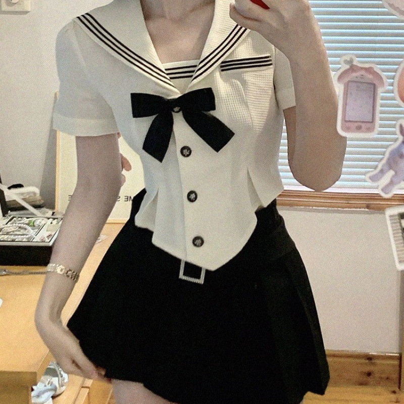 플러스 사이즈 반팔 네이비 칼라 짧은 보우 셔츠 + 플리츠 스커트 여성 여름 순수한 섹시 스타일 투피스 세트스토어 가기