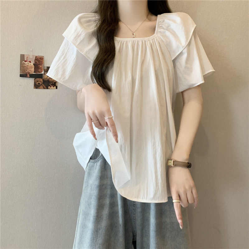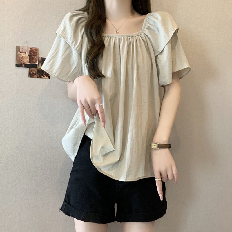 플러스 사이즈 우아한 스위트 스타일 레트로 스퀘어 칼라 쉬폰 반팔 셔츠 여성용 통통한 느슨한 슬리밍 벨리 커버 올 매치 탑