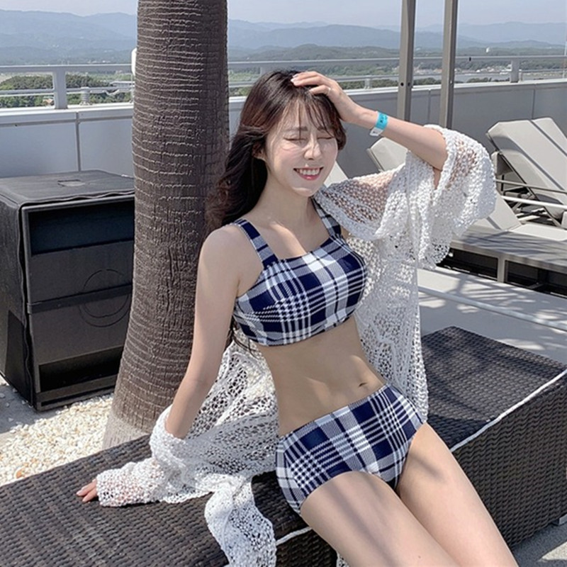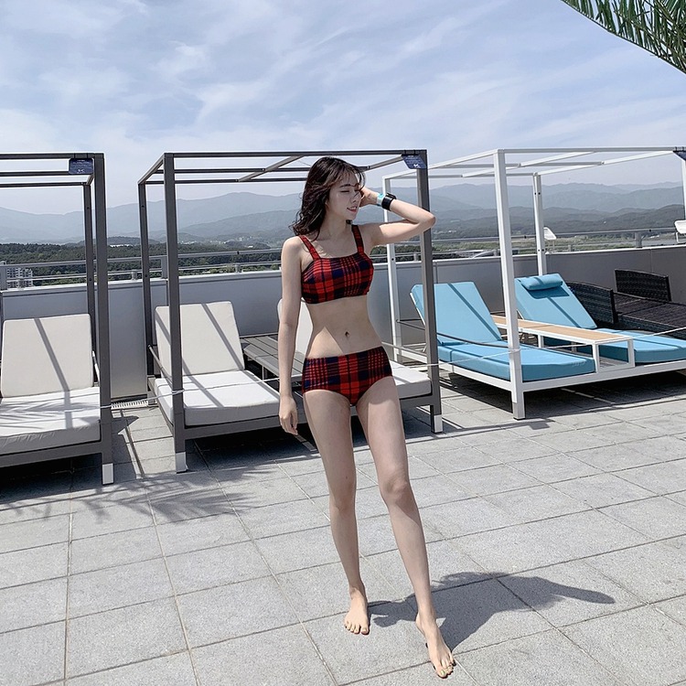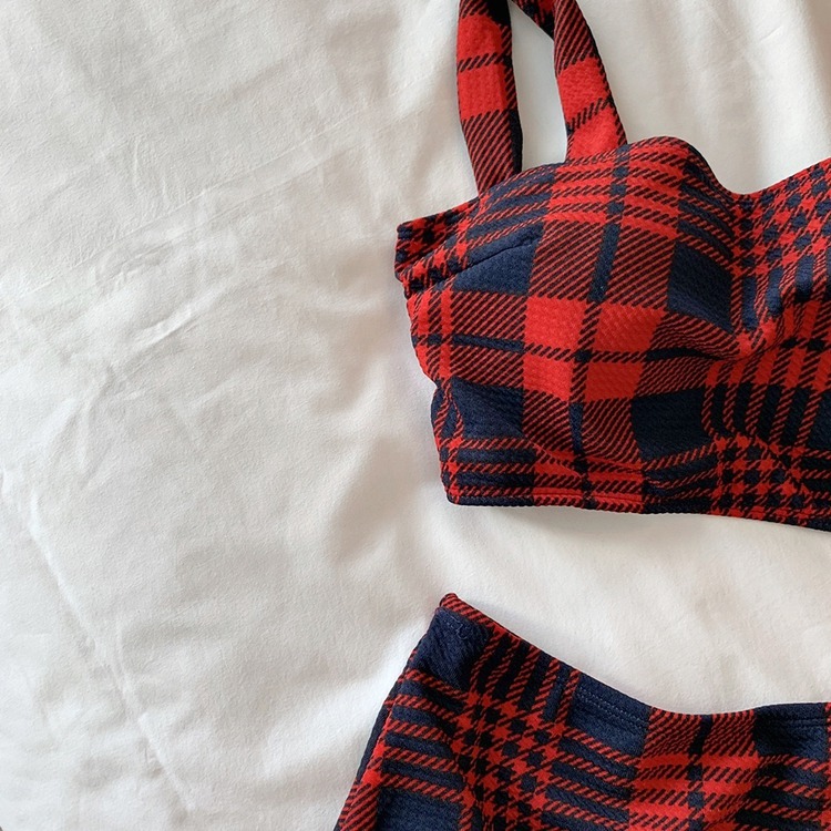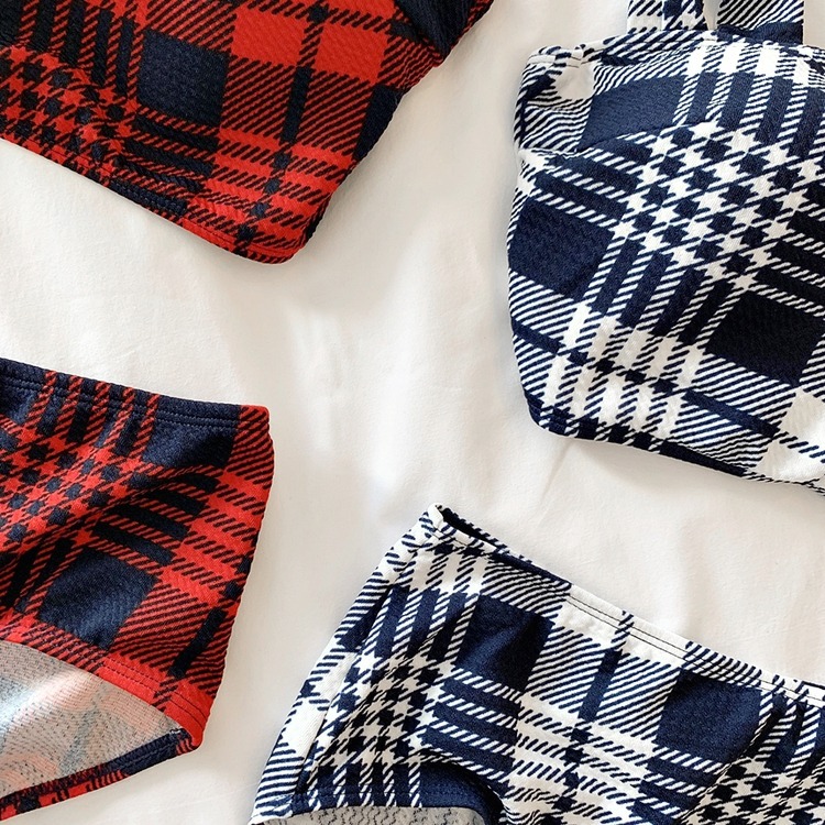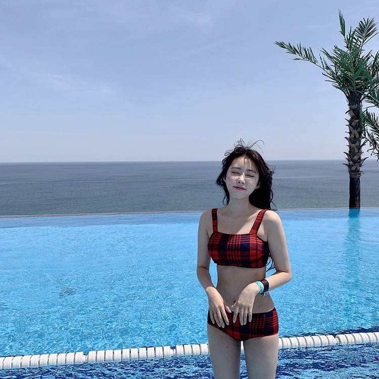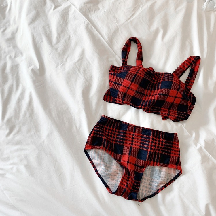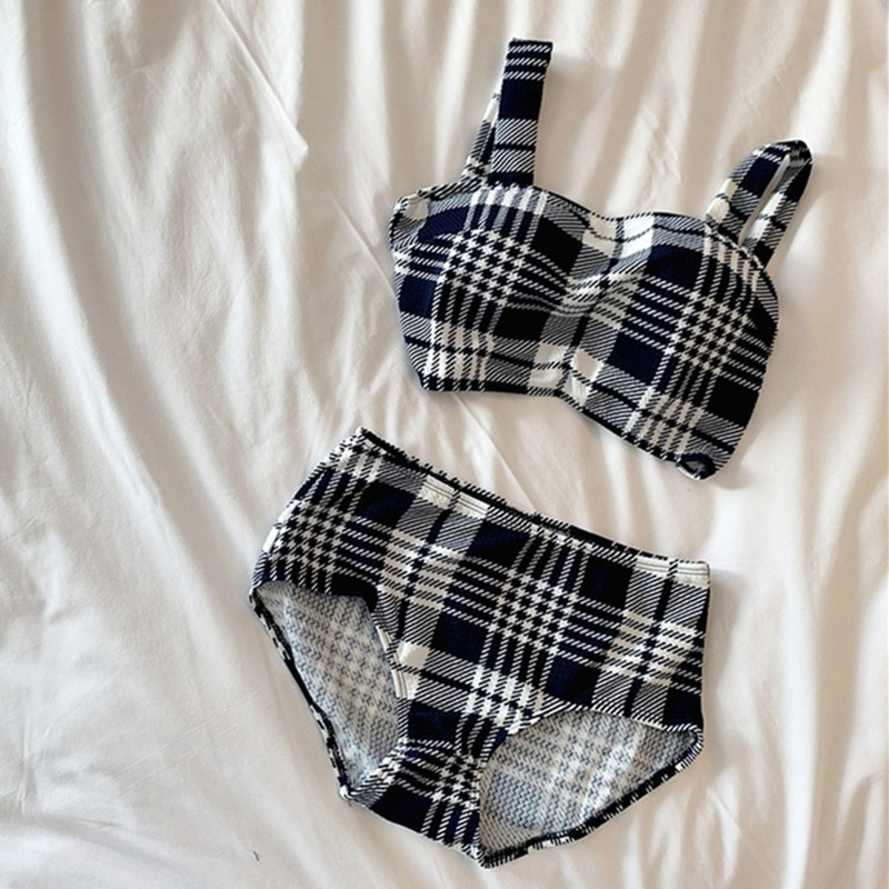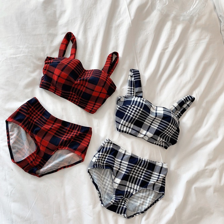 2024 달콤한 소녀 빈티지 체크 샤넬 스타일 작은 가슴 더블 어깨 스트랩 스플릿 수영복 여성용 수영복