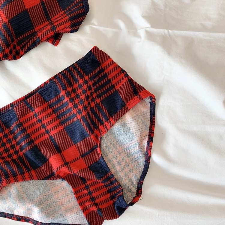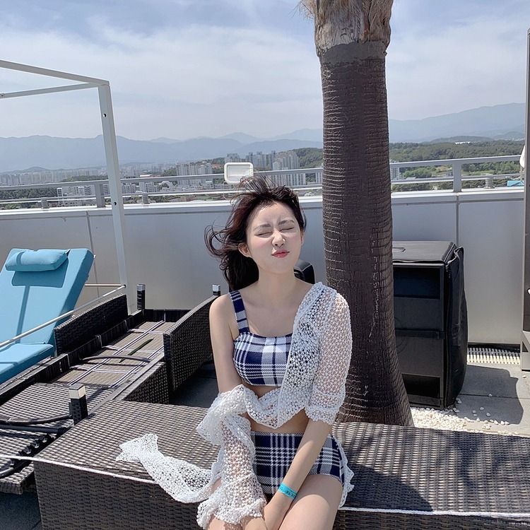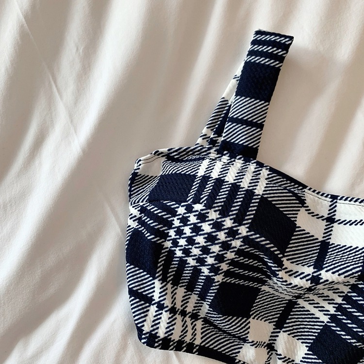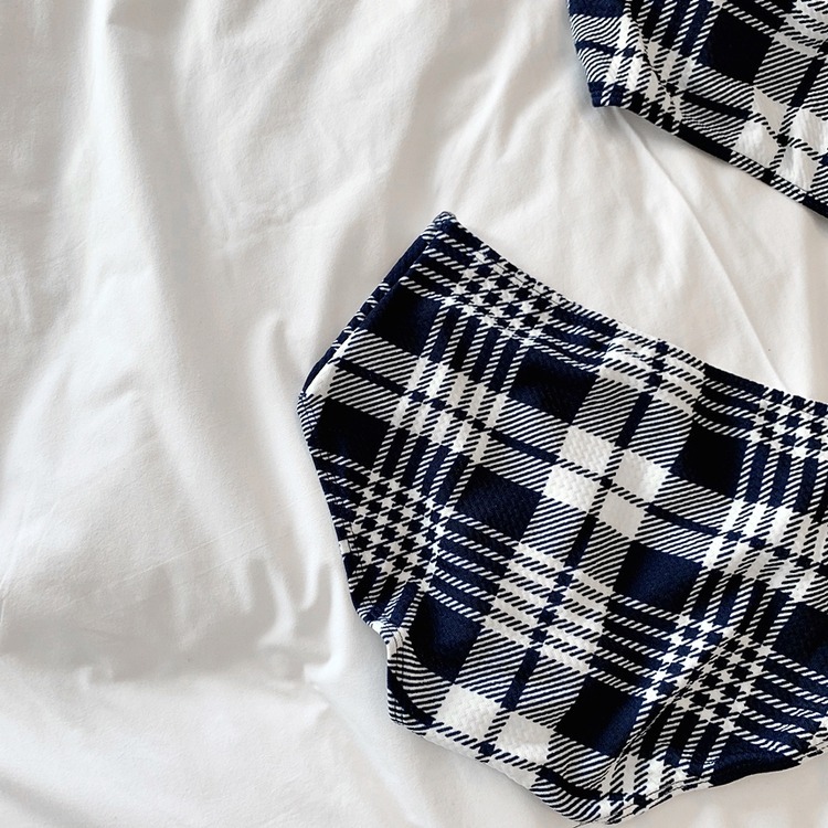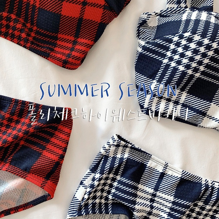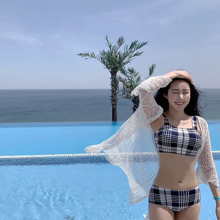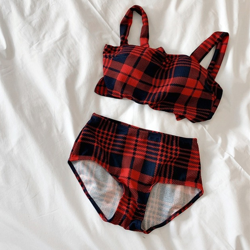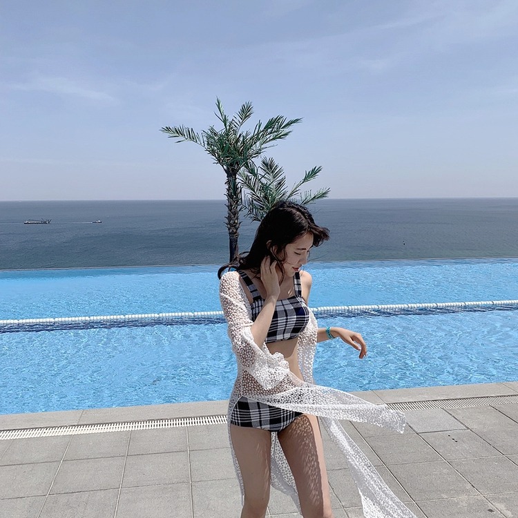 2024 달콤한 소녀 빈티지 체크 샤넬 스타일 작은 가슴 더블 어깨 스트랩 스플릿 수영복 여성용 수영복