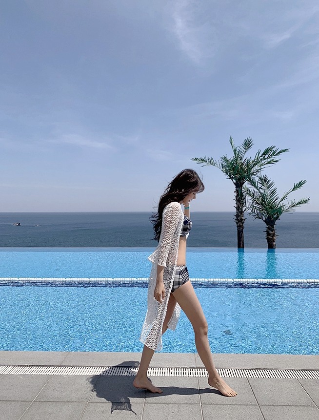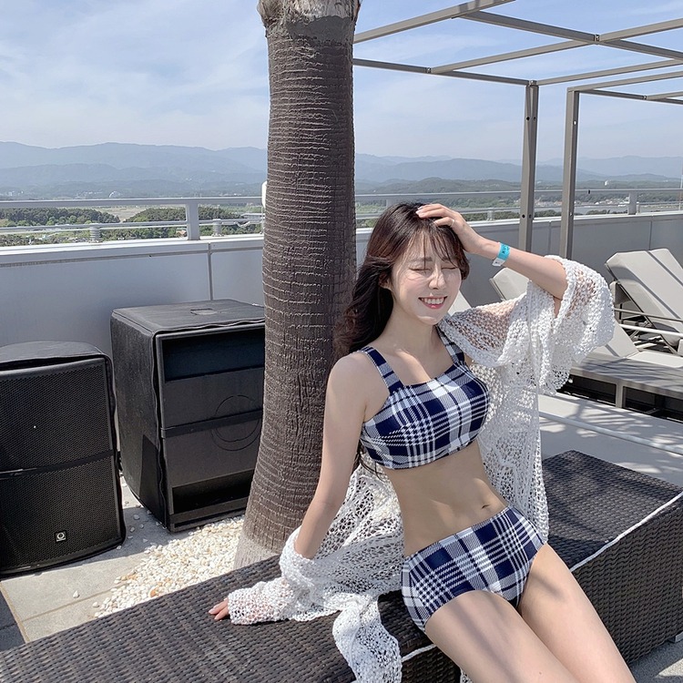 2024 달콤한 소녀 빈티지 체크 샤넬 스타일 작은 가슴 더블 어깨 스트랩 스플릿 수영복 여성용 수영복스토어 가기