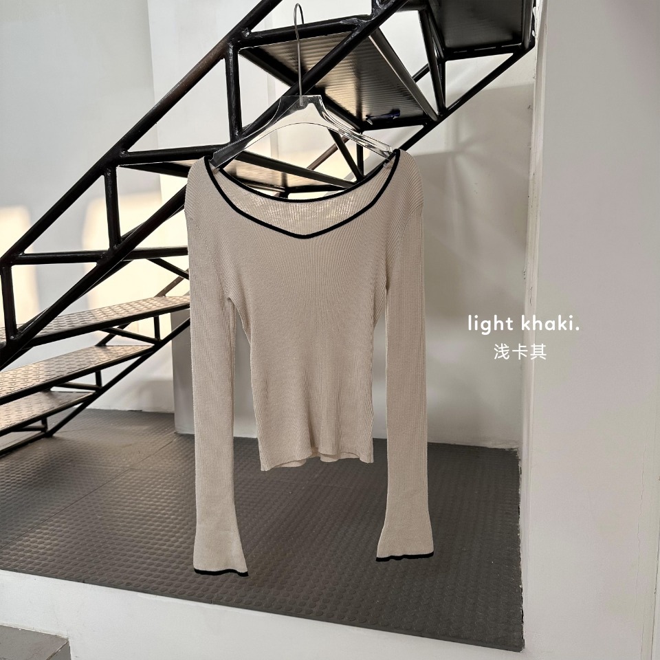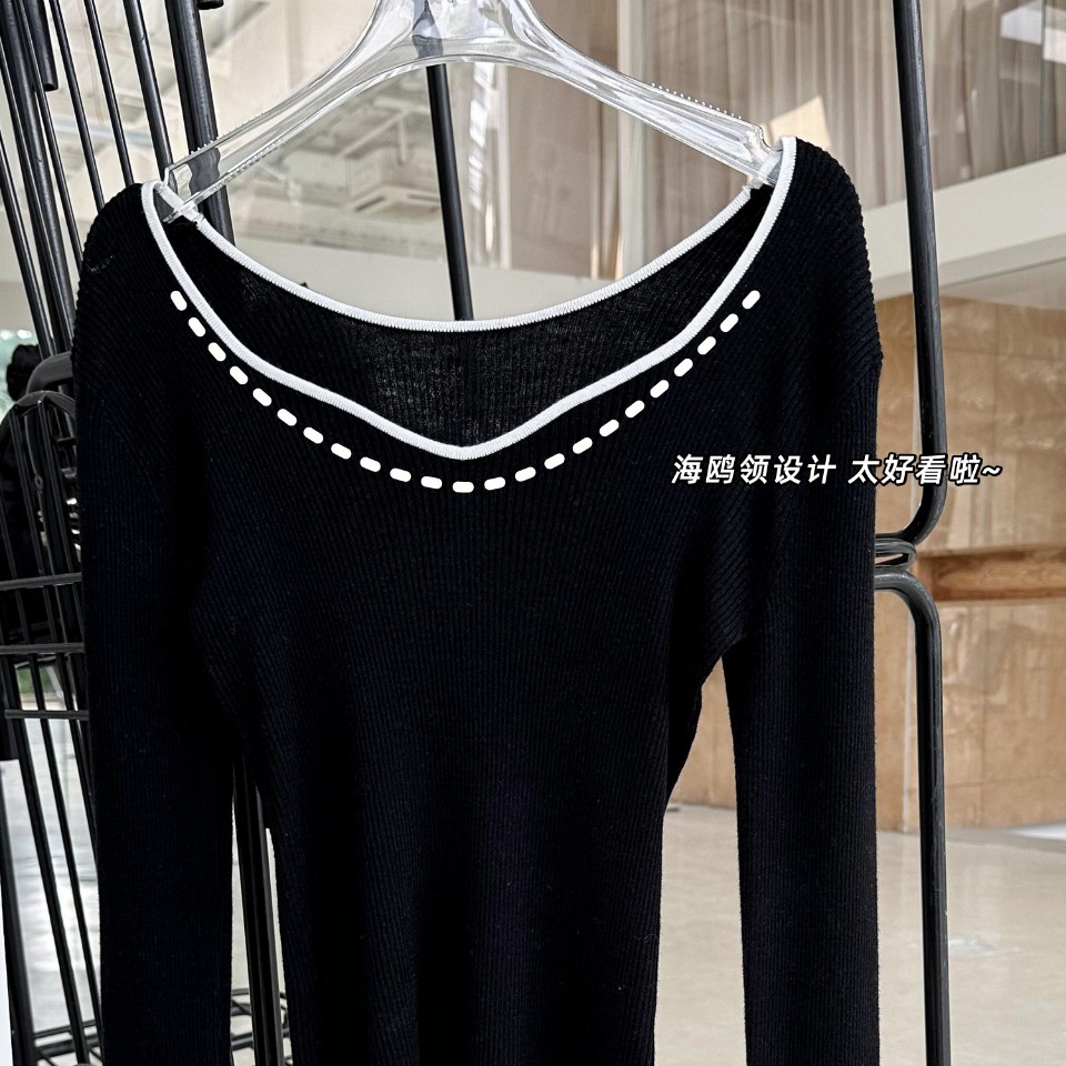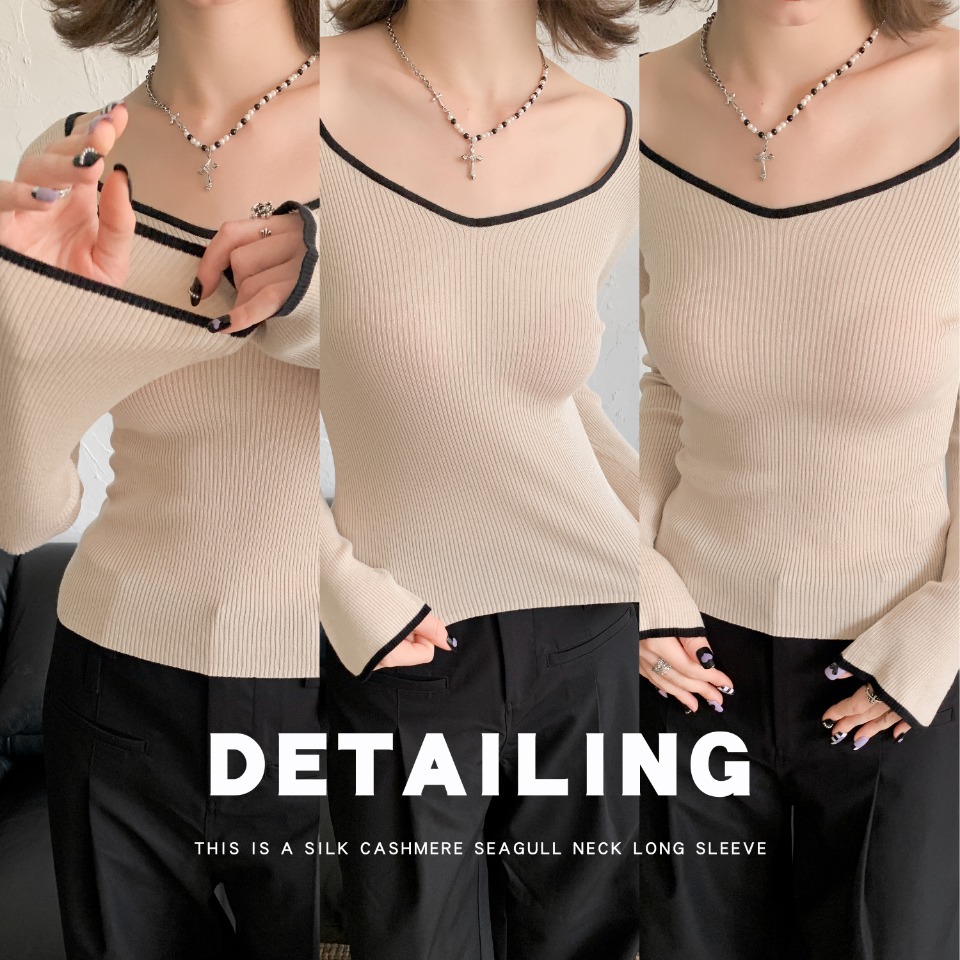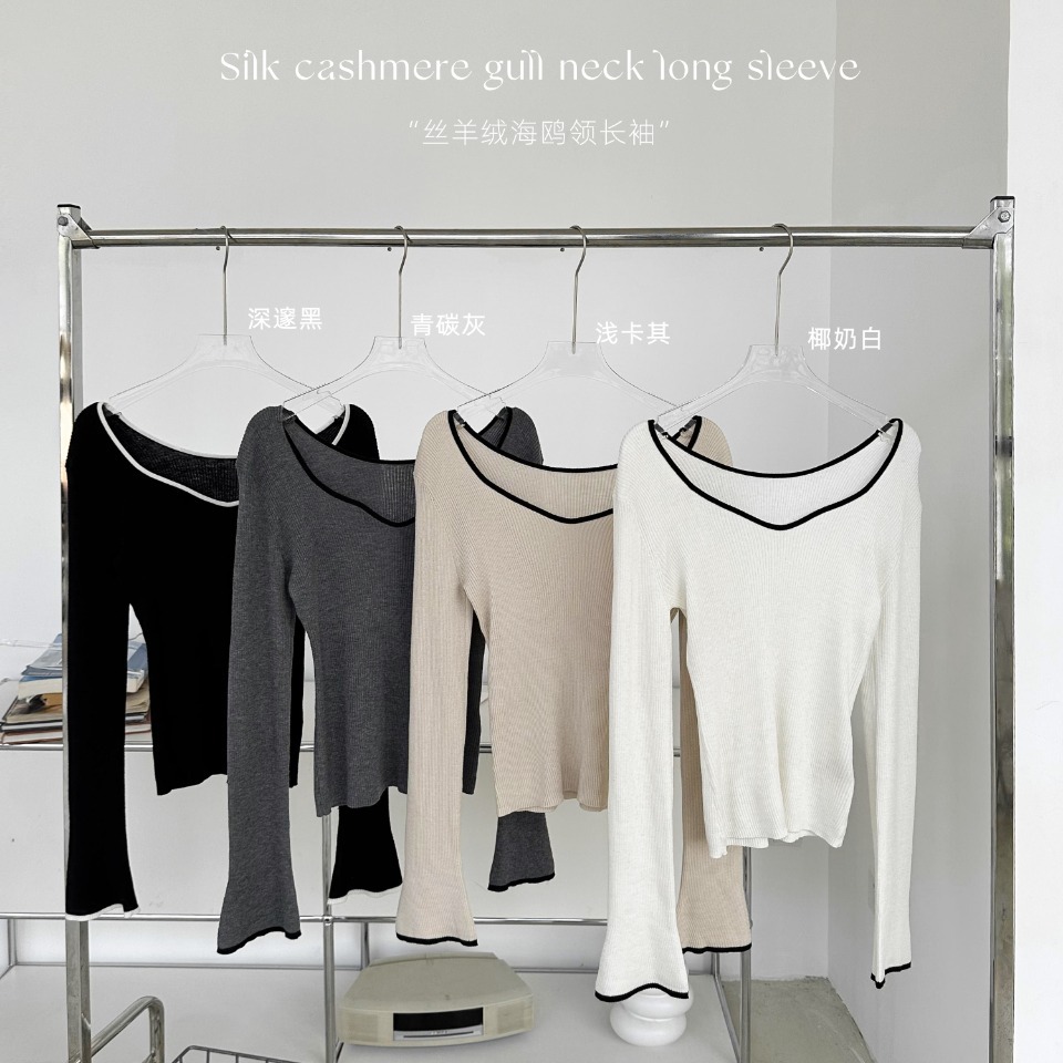 봄과 여름 새로운 프랑스 니트 갈매기 칼라 컬러 블록 실크 캐시미어 관대 한 조끼 반팔 슬림 핏 긴팔베이스 셔츠스토어 가기
