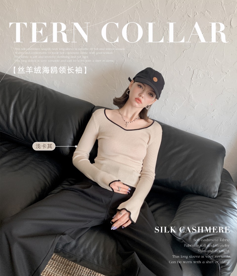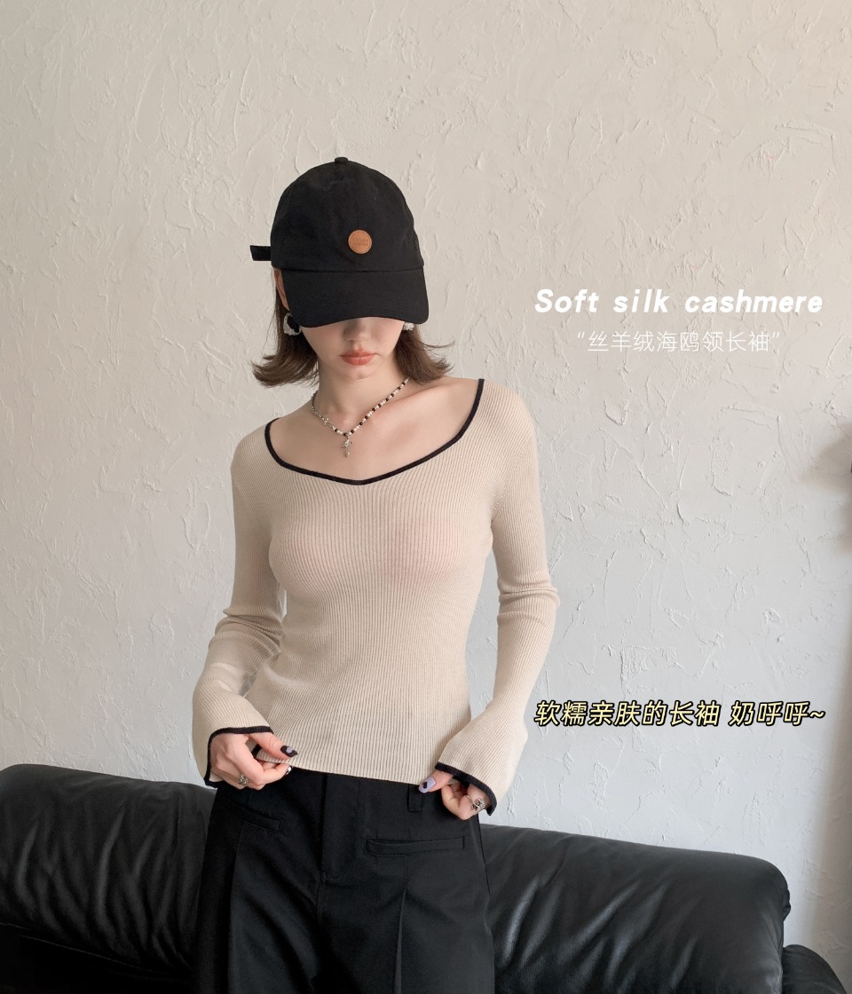 봄과 여름 새로운 프랑스 니트 갈매기 칼라 컬러 블록 실크 캐시미어 관대 한 조끼 반팔 슬림 핏 긴팔베이스 셔츠
