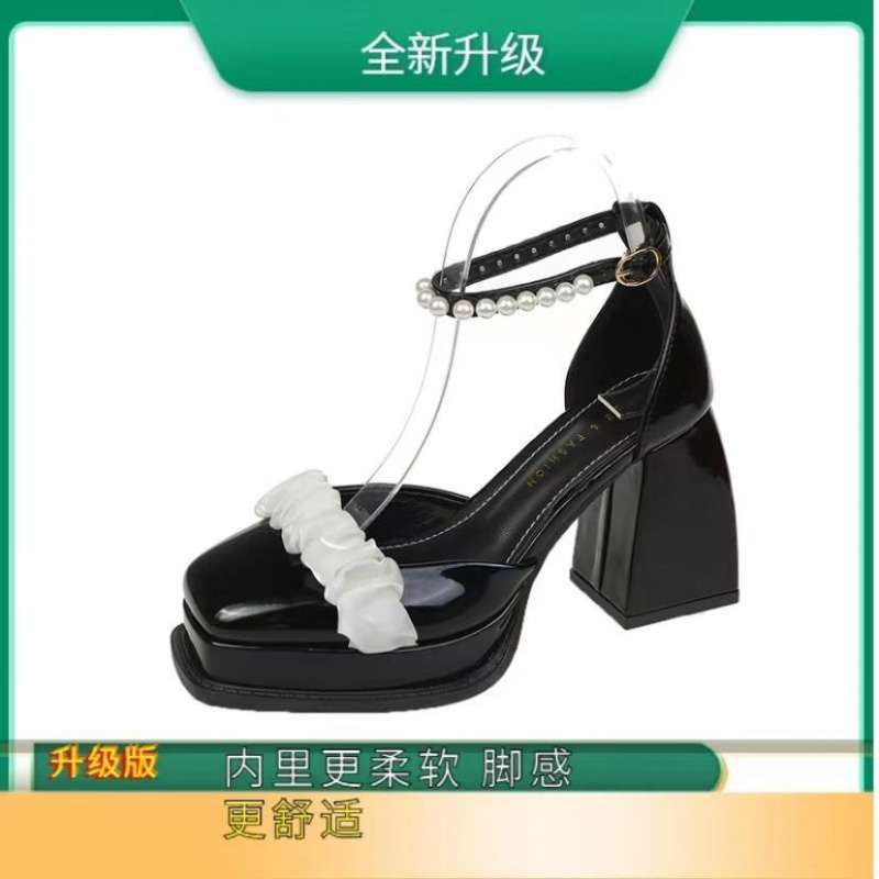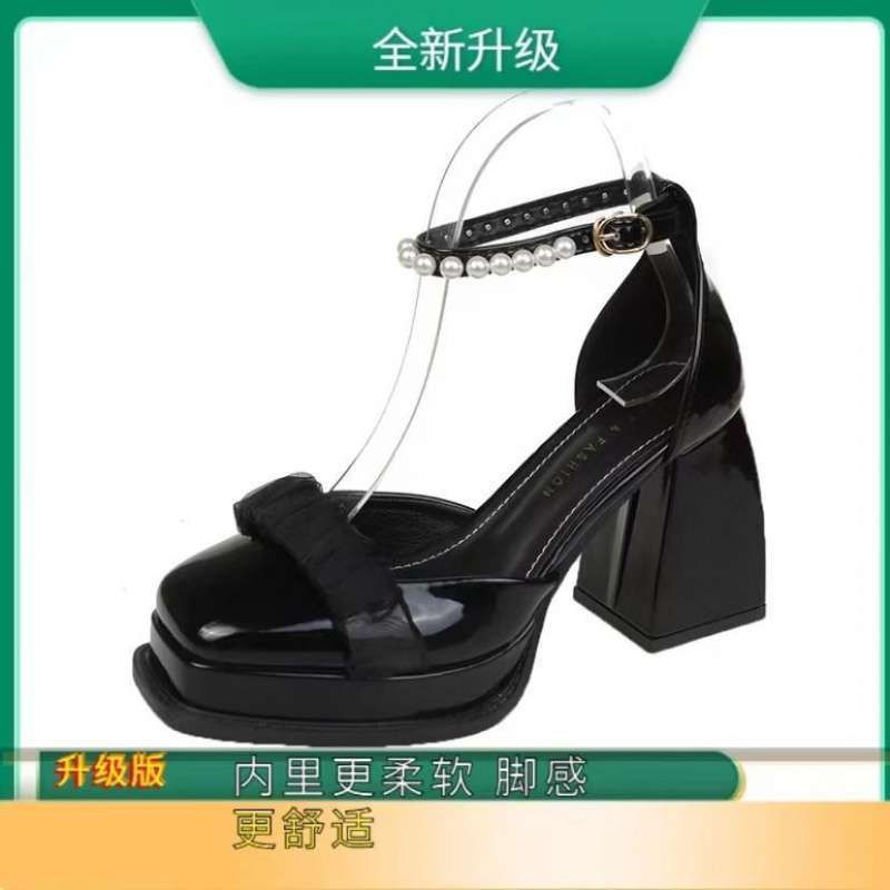 메리 제인 하이힐 여성 여름 2025 봄, 가을 새로운 두꺼운 굽 복고풍 스퀘어 토 진주 싱글 슈즈 원 스트랩 샌들