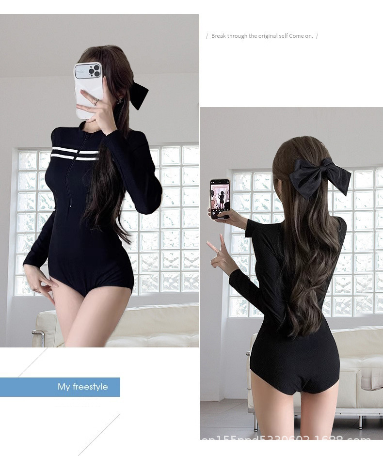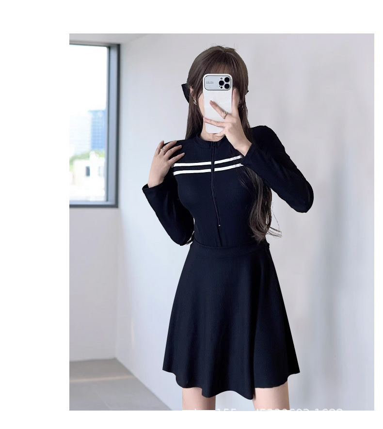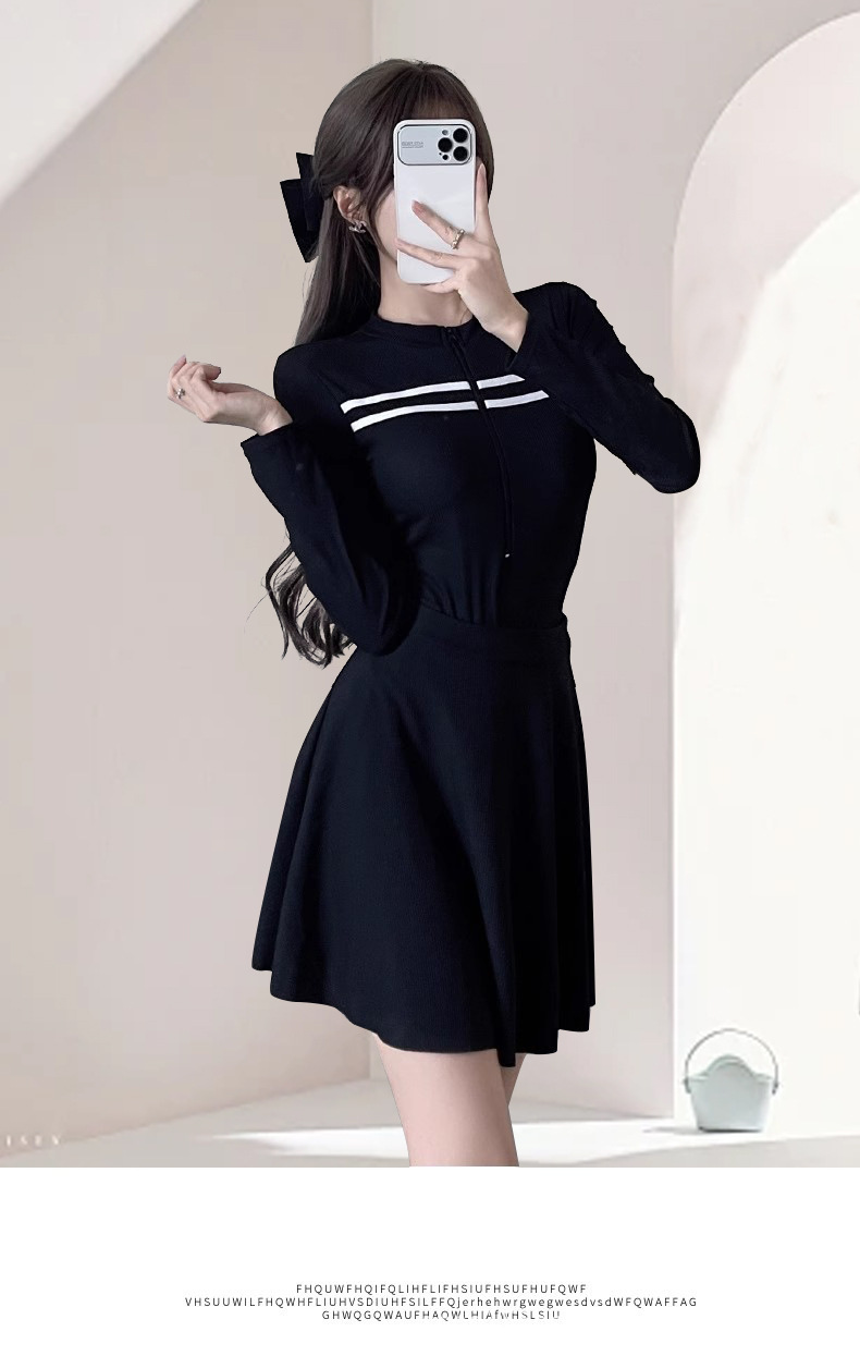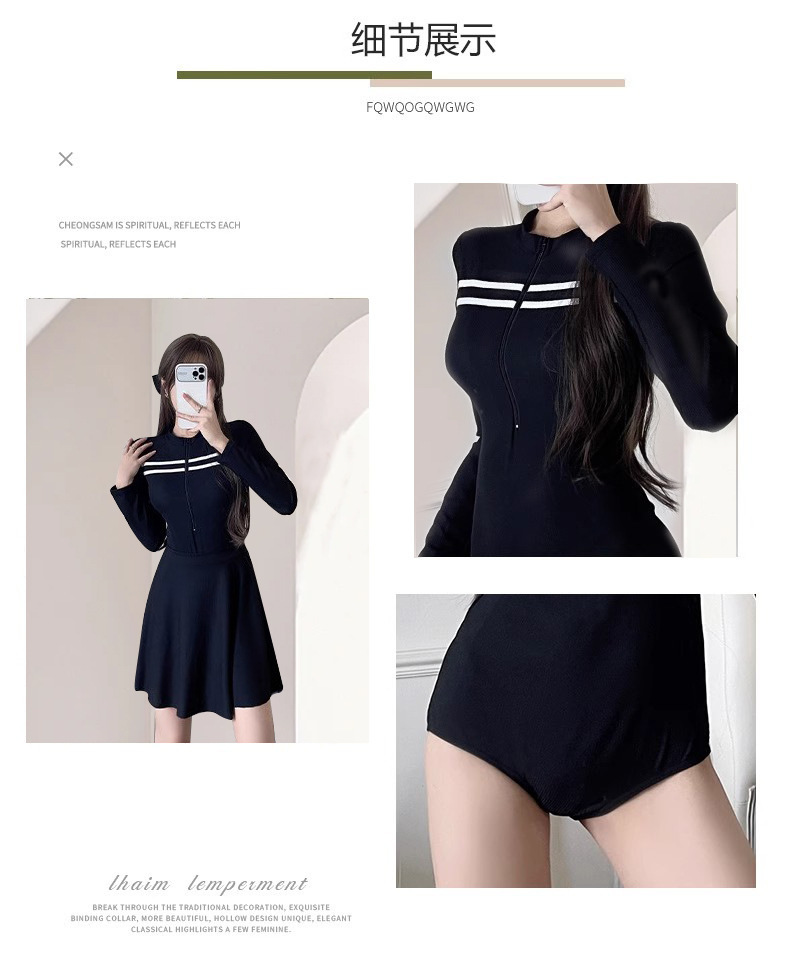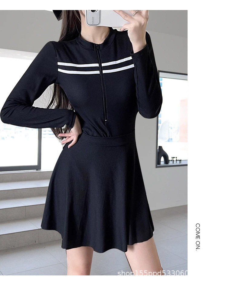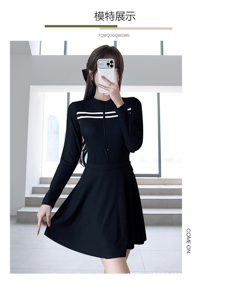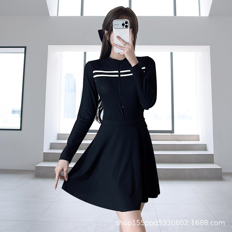 여성용 수영복, 투피스, 보수적, 슬림핏, 배 가리기, 스커트 스타일, 긴팔, 자외선 차단, 스포츠 트레이닝 수영복, Xunuo 6015