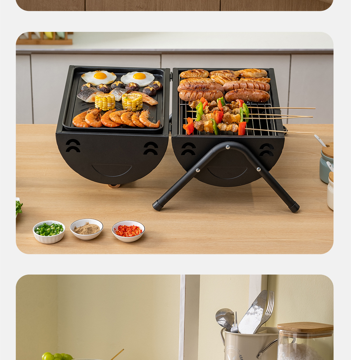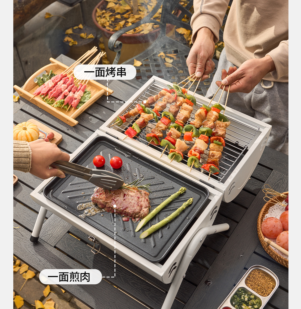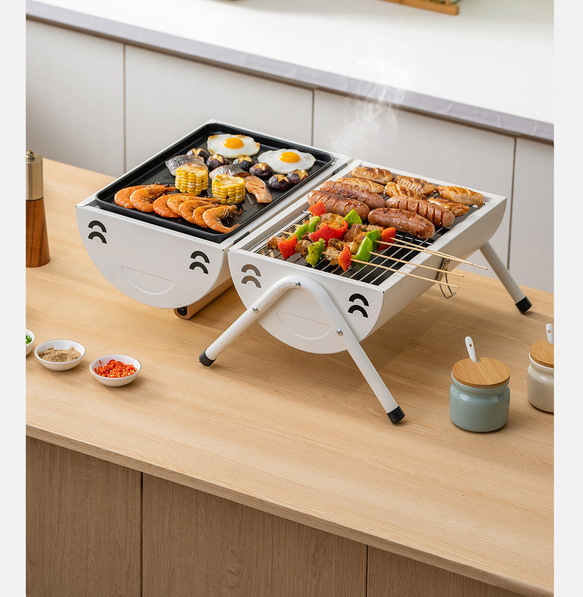 • 펄 화이트: 양면 바베큐 그릴 + 그릴 그릴*2 [이중 숯 여물통] 양면 그릴