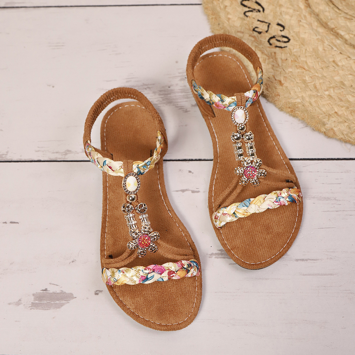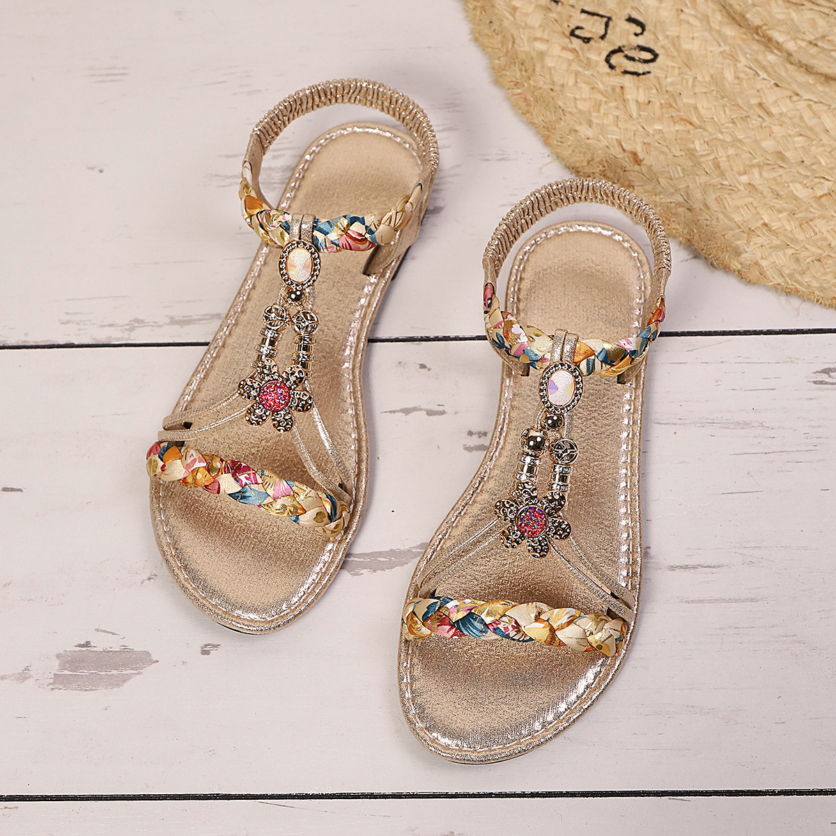 보헤미안 스타일 여성 샌들 2025 여름 새로운 색상 짠 파란색 라운드 발가락 편안한 플랫 샌들스토어 가기