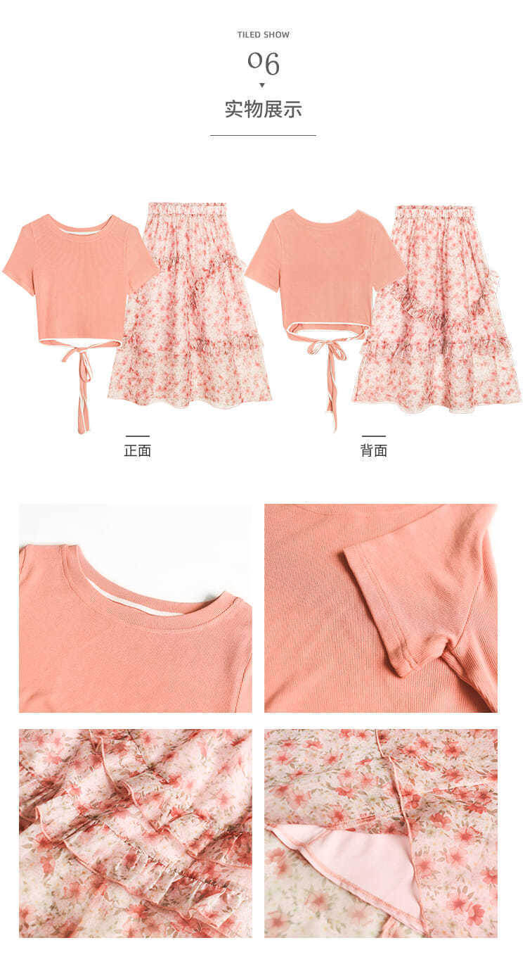 싱글/세트 코튼 핑크 연령 감소 세트 여성 여름 한국식 티셔츠 플로럴 스커트 유행 투피스 세트