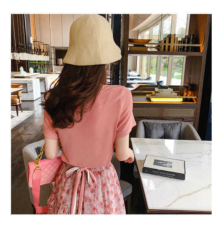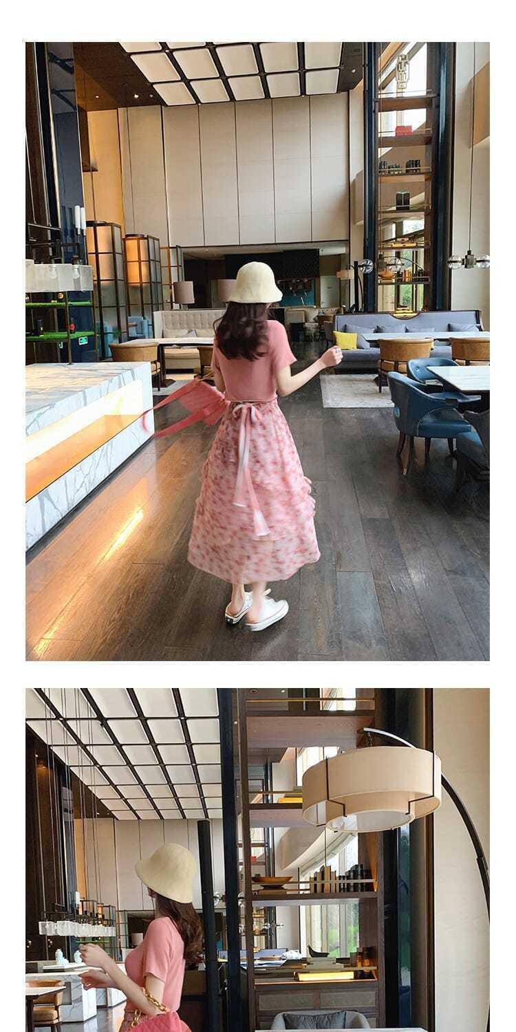 싱글/세트 코튼 핑크 연령 감소 세트 여성 여름 한국식 티셔츠 플로럴 스커트 유행 투피스 세트스토어 가기