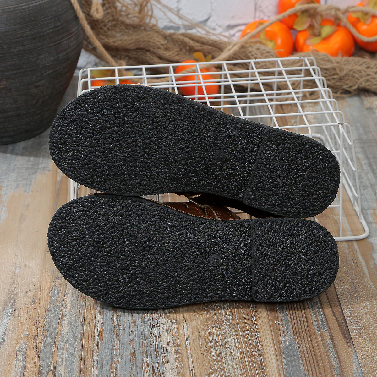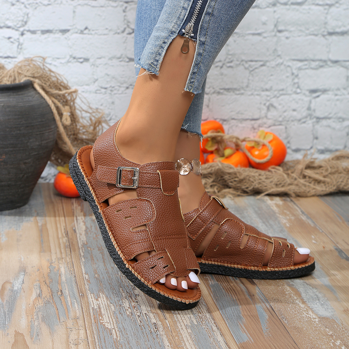 대외 무역 플러스 사이즈 새로운 벨트 버클 플랫 할로우 샌들 여성 레트로 스타일 외부 착용 솔리드 컬러 비치 샌들 소원스토어 가기