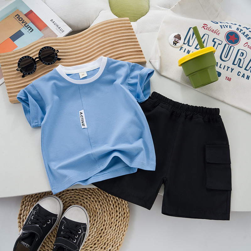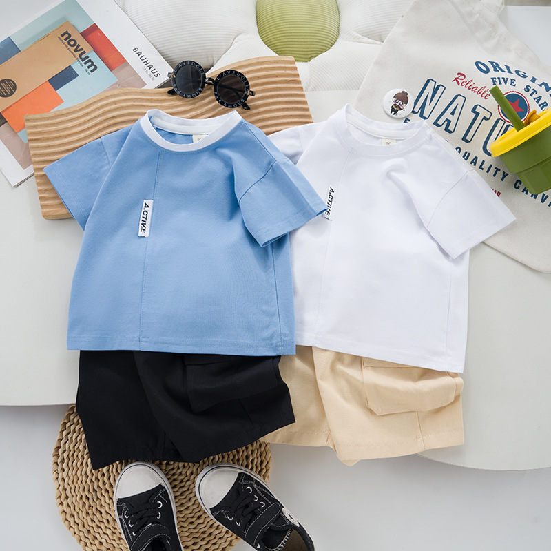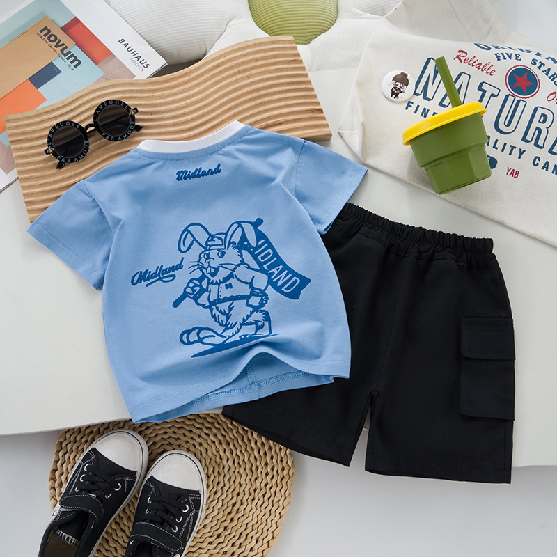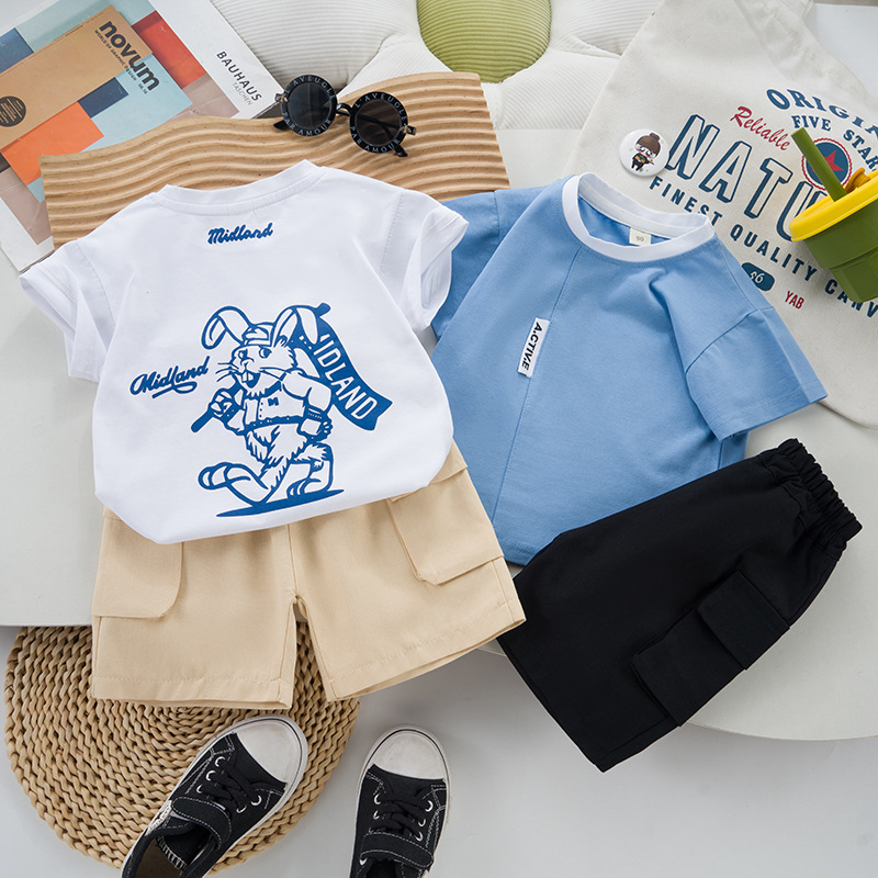 여름 정장 트렌디한 여름 새로운 한국 스타일 소년 패션 뒷면 토끼 반팔 탑 + 반바지 투피스 슈트스토어 가기