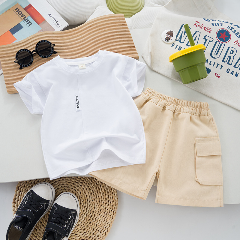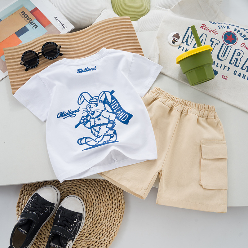 여름 정장 트렌디한 여름 새로운 한국 스타일 소년 패션 뒷면 토끼 반팔 탑 + 반바지 투피스 슈트