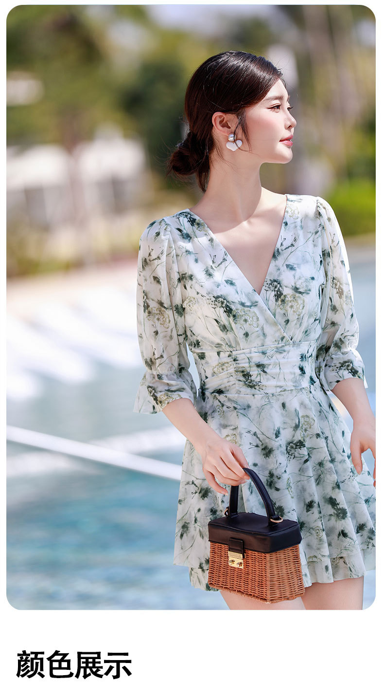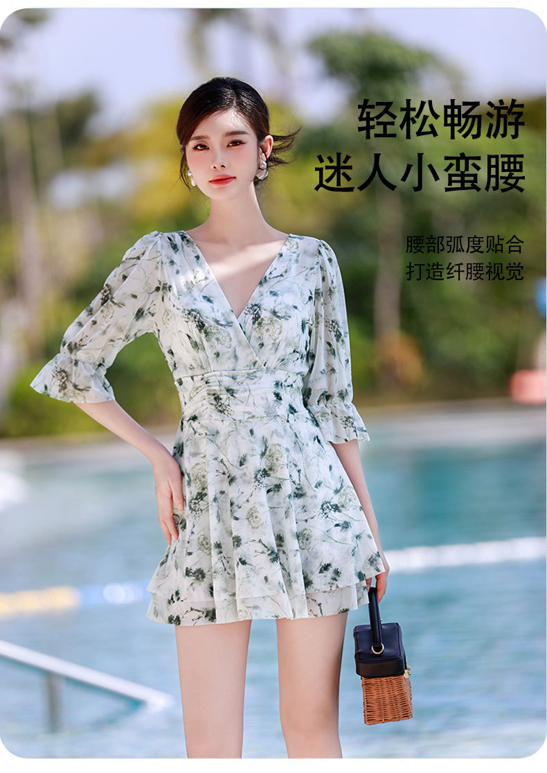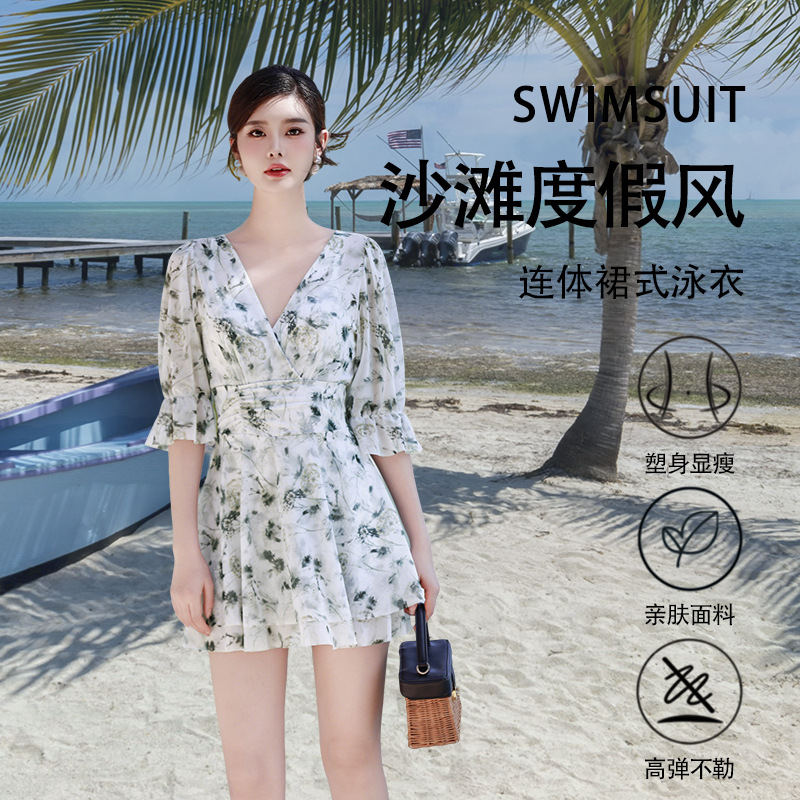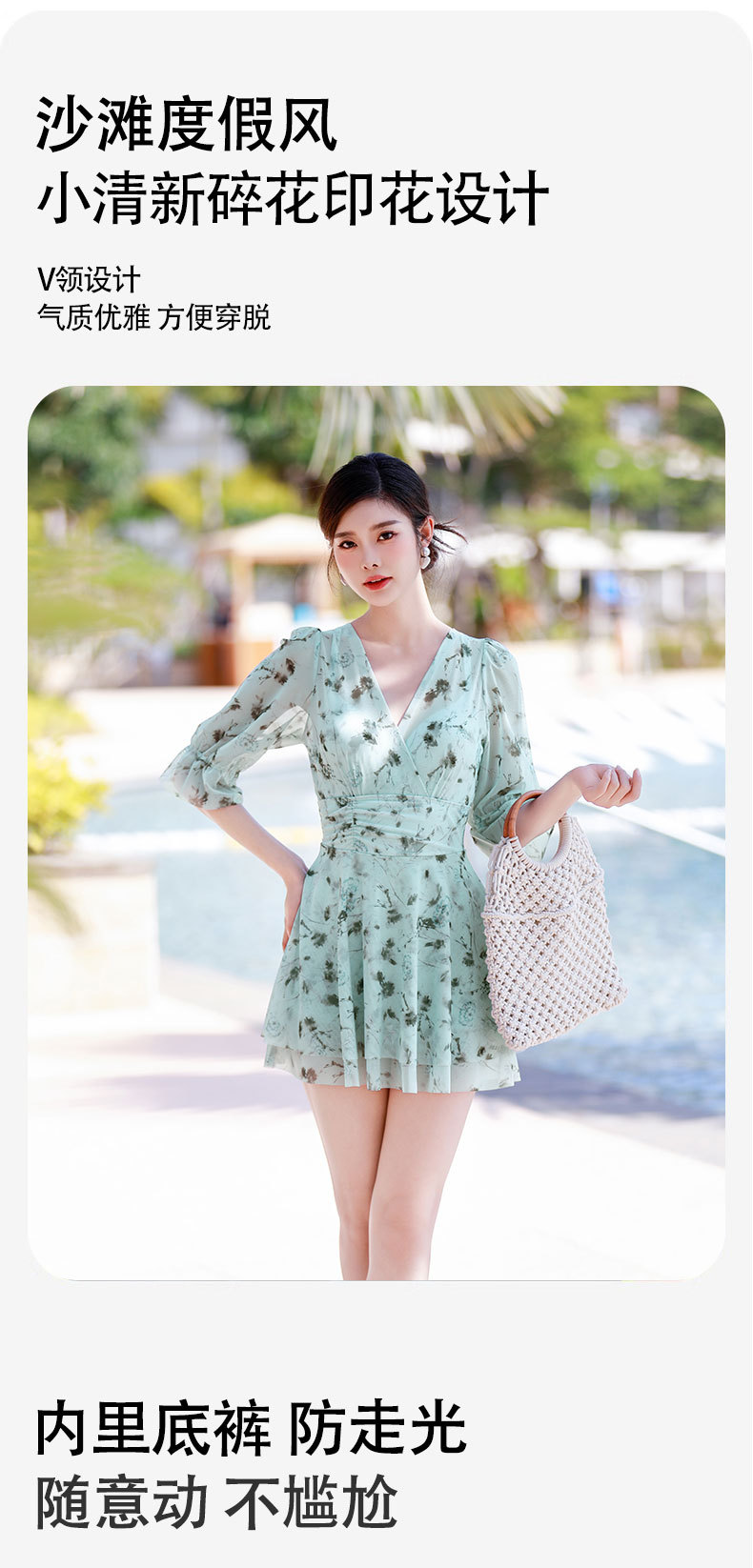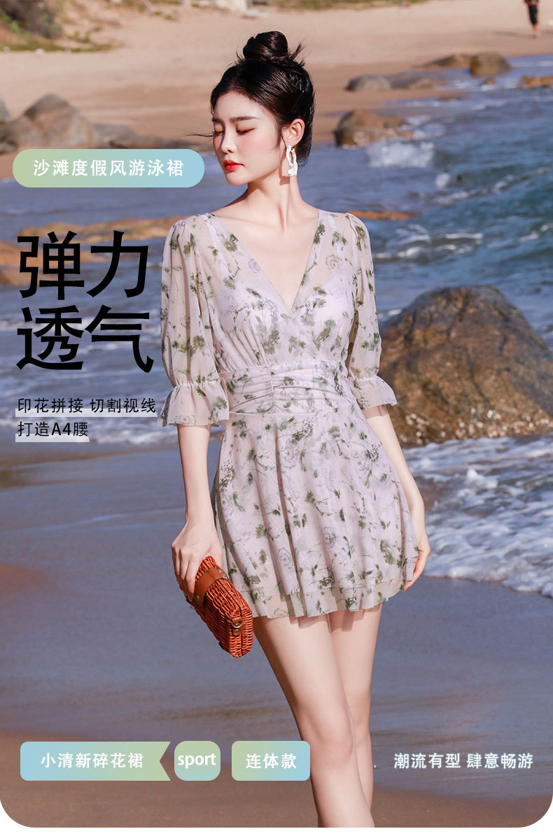 여성을 위한 새로운 고급 원피스 스커트 수영복, 작은 꽃무늬, 보수적이고 슬림한 해변 해변 캐주얼 야외 수영복