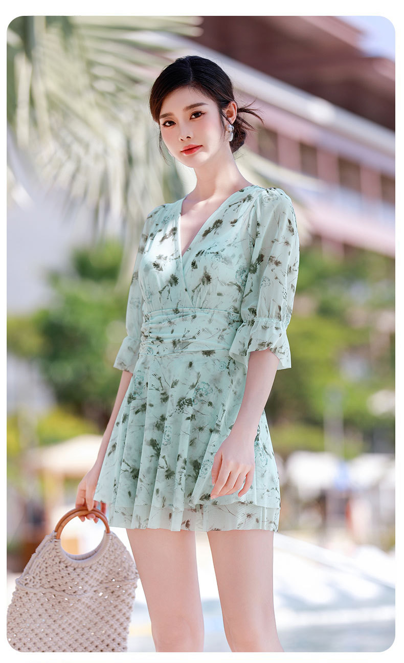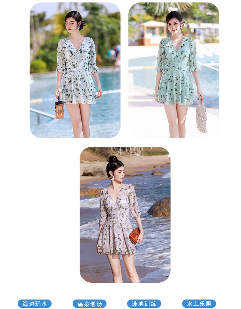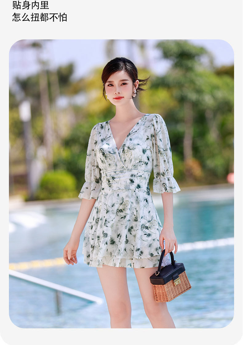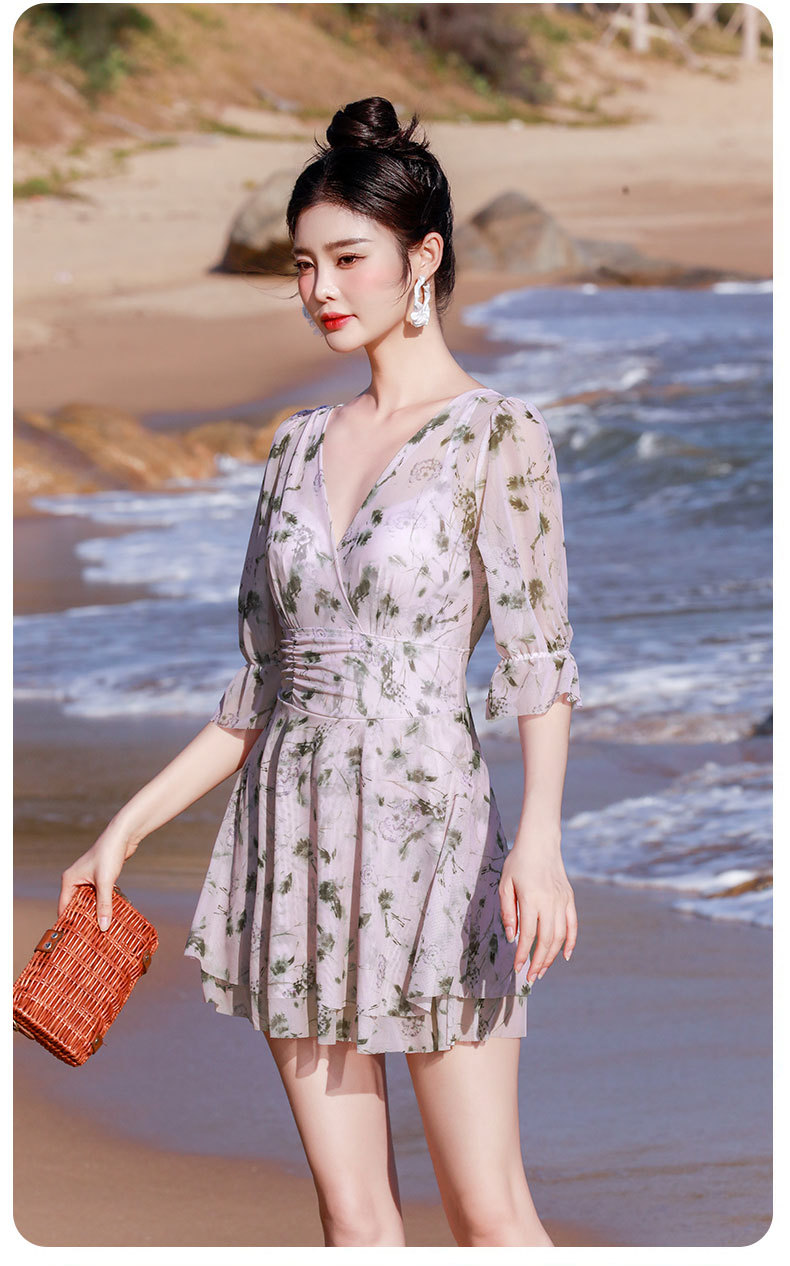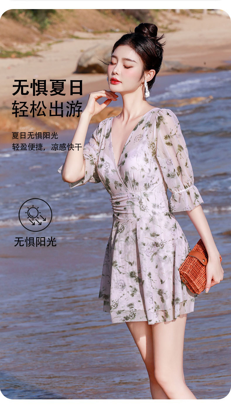 여성을 위한 새로운 고급 원피스 스커트 수영복, 작은 꽃무늬, 보수적이고 슬림한 해변 해변 캐주얼 야외 수영복
