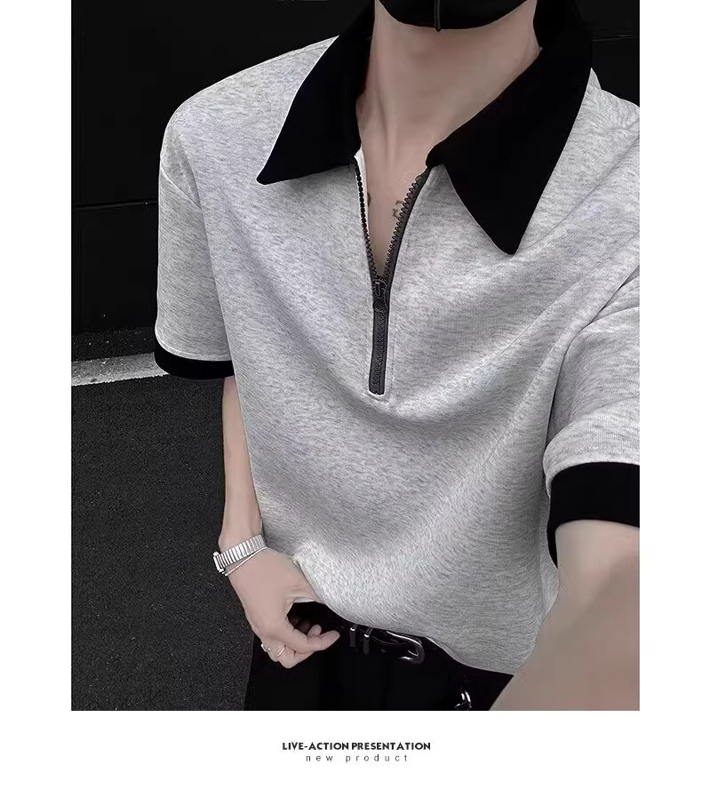아메리칸 하프 지퍼 반팔 티셔츠 남성 여름 트렌디 브랜드 배색 라펠 폴로 셔츠 루즈한 5부소매 티셔츠