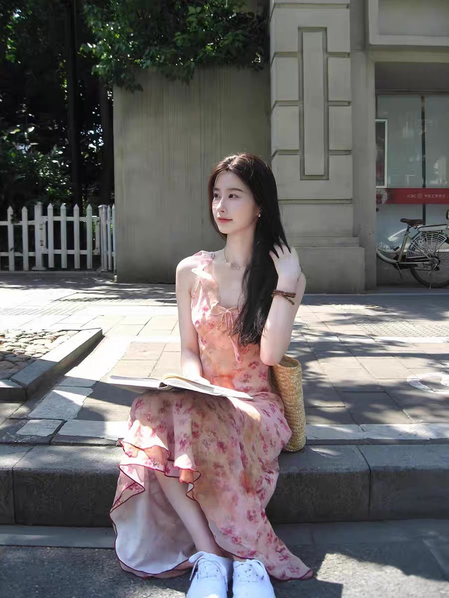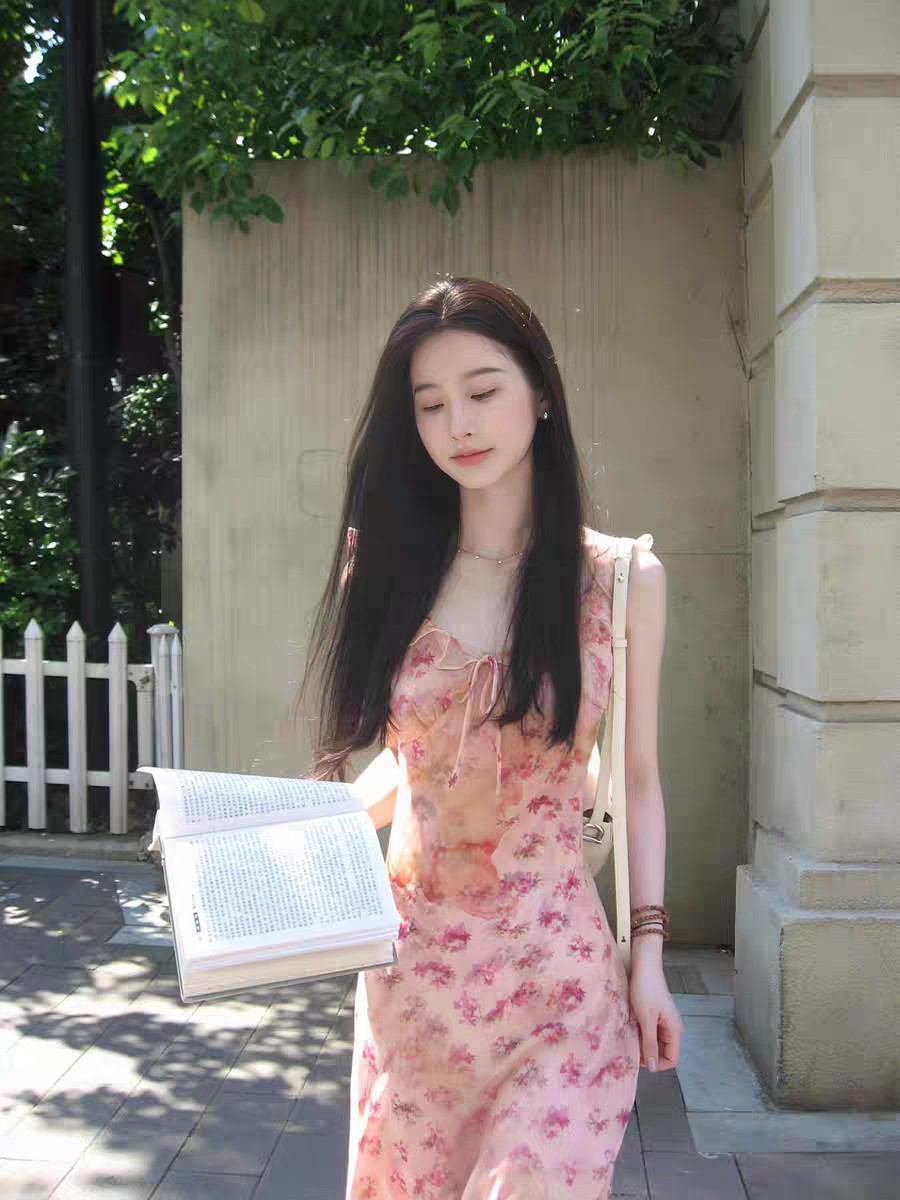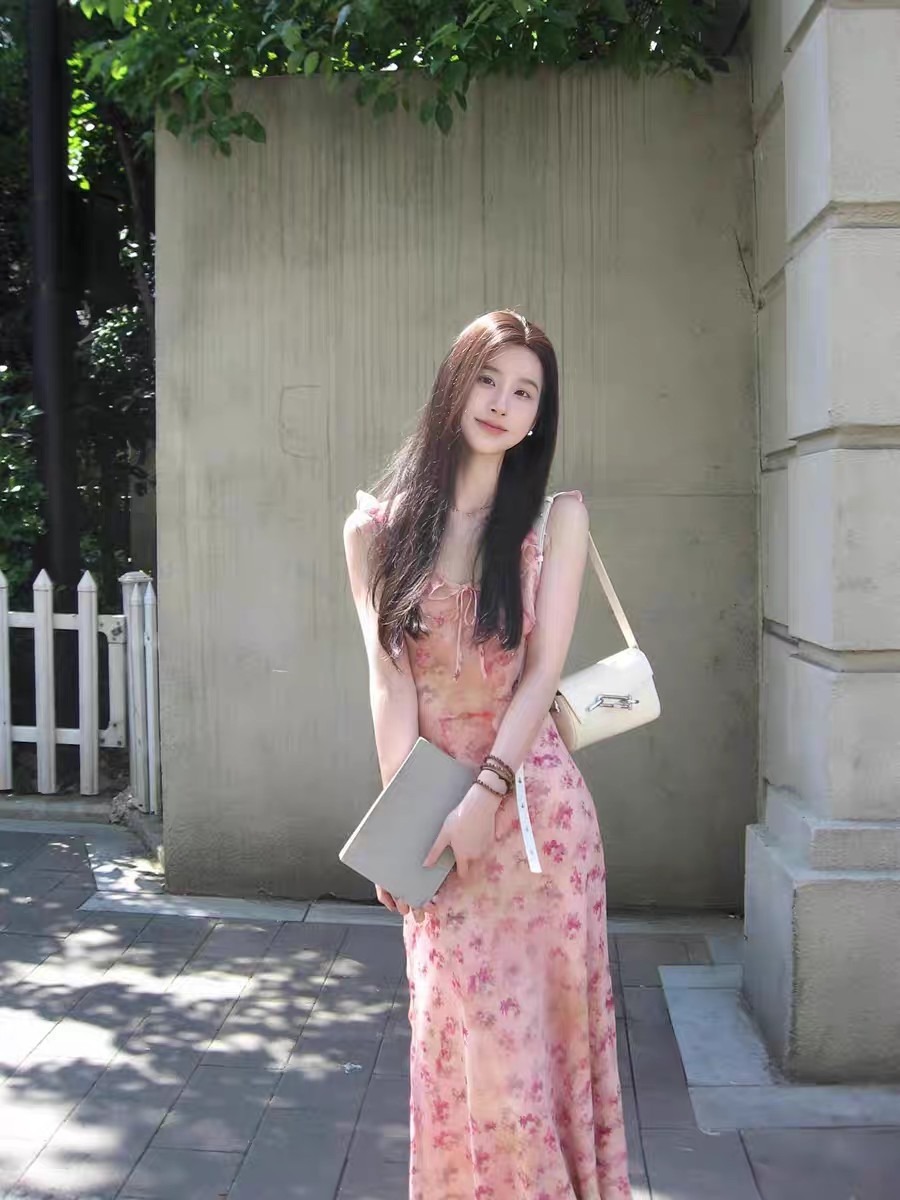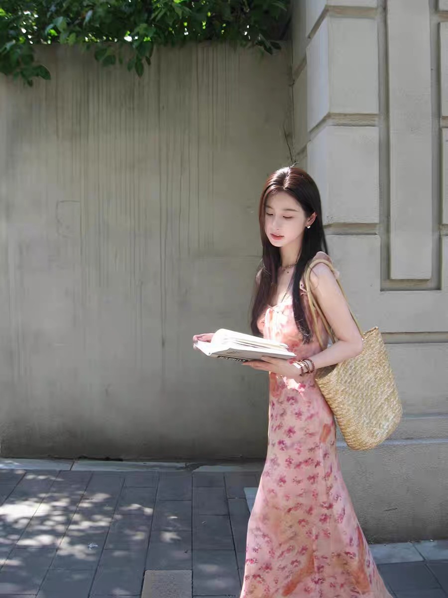 핑크 꽃 슬링 원피스 여성의 순수한 욕망 부드러운 여름 프랑스 휴가 스타일 우아한 허리 소매 긴 원피스스토어 가기