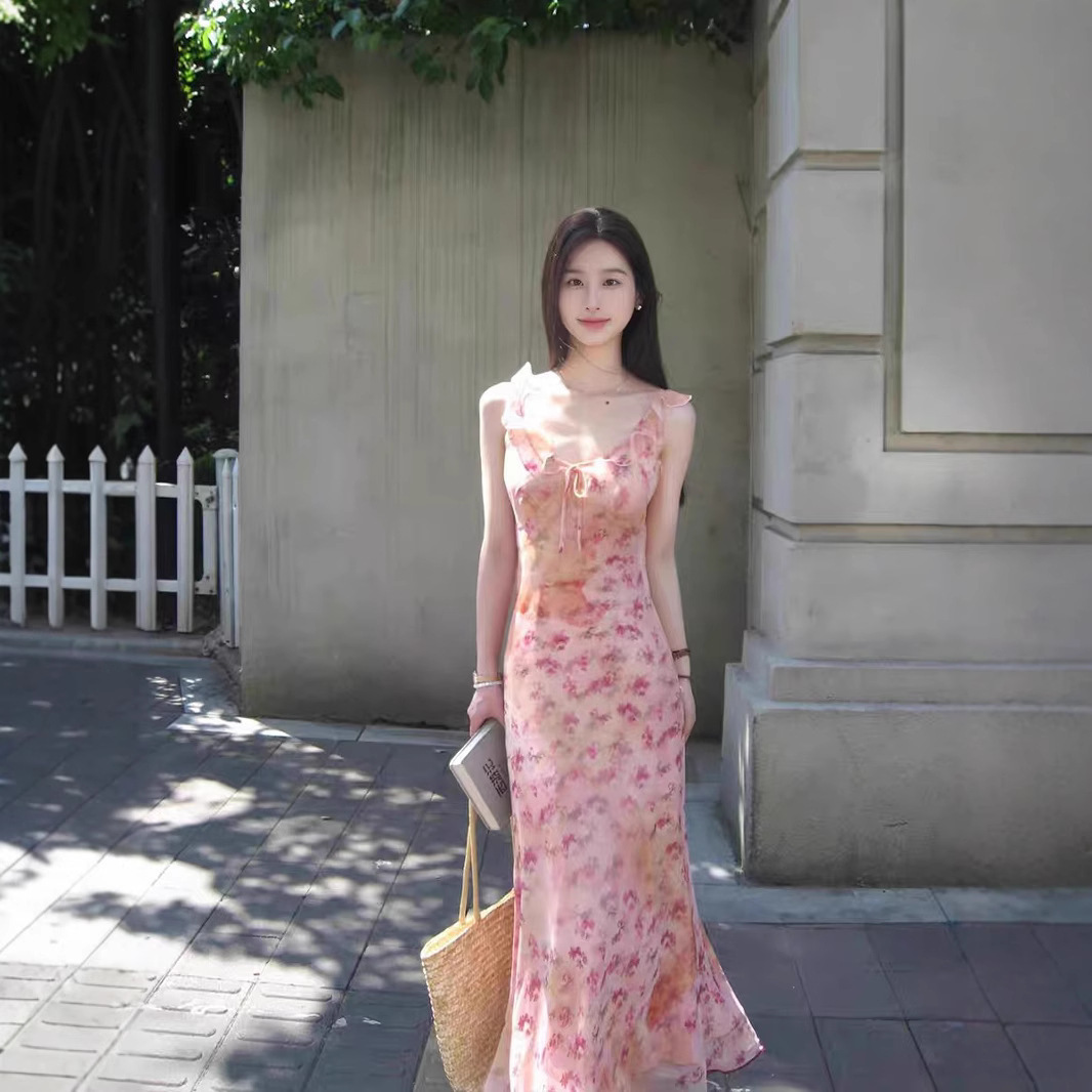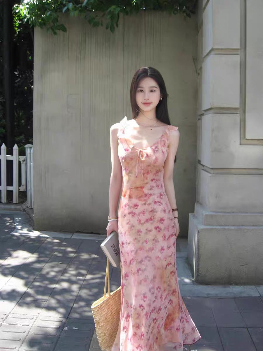 핑크 꽃 슬링 원피스 여성의 순수한 욕망 부드러운 여름 프랑스 휴가 스타일 우아한 허리 소매 긴 원피스