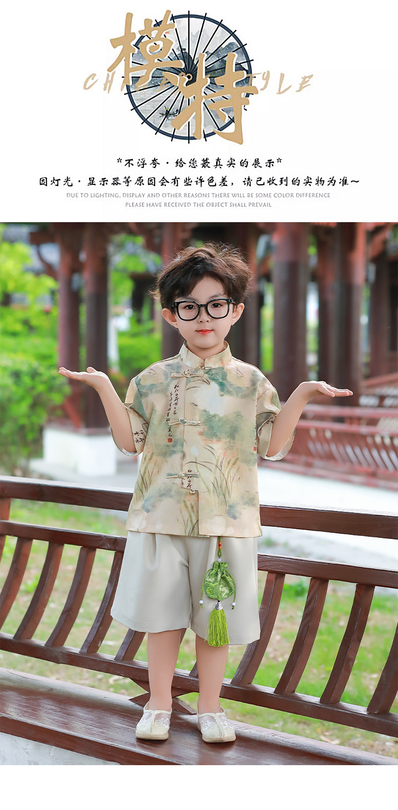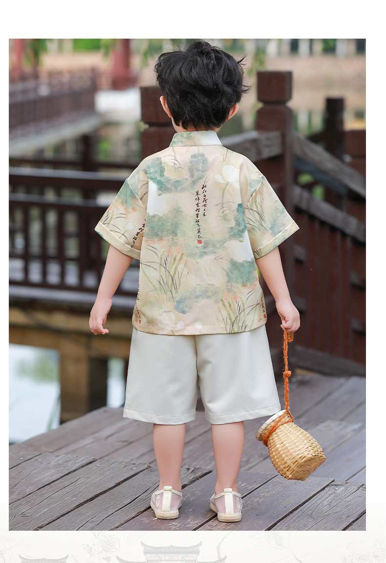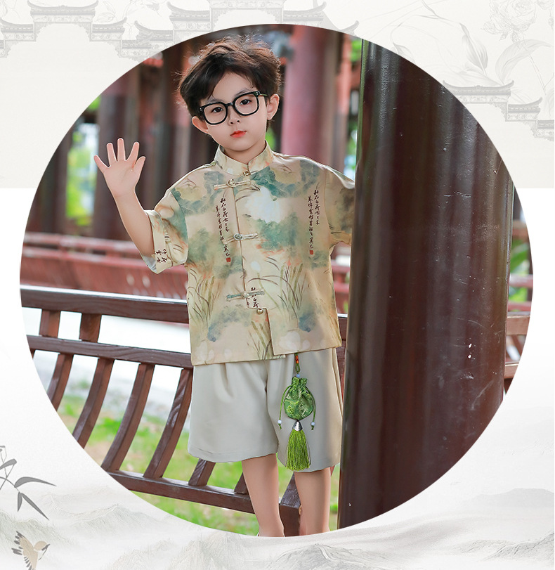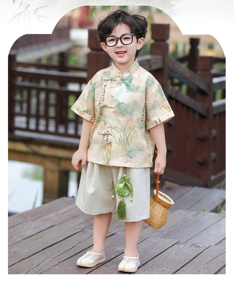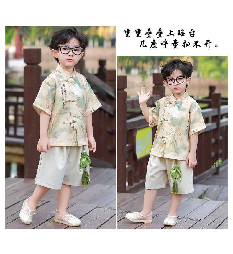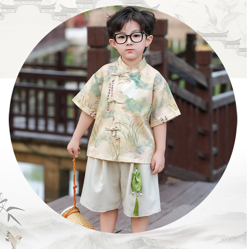 한푸 소년의 여름 반팔 탕 세트 투피스 세트 아기의 새로운 중국식 세트 중국 스타일의 어린 시절과 어린 시절 중국 스타일의 고대 원피스